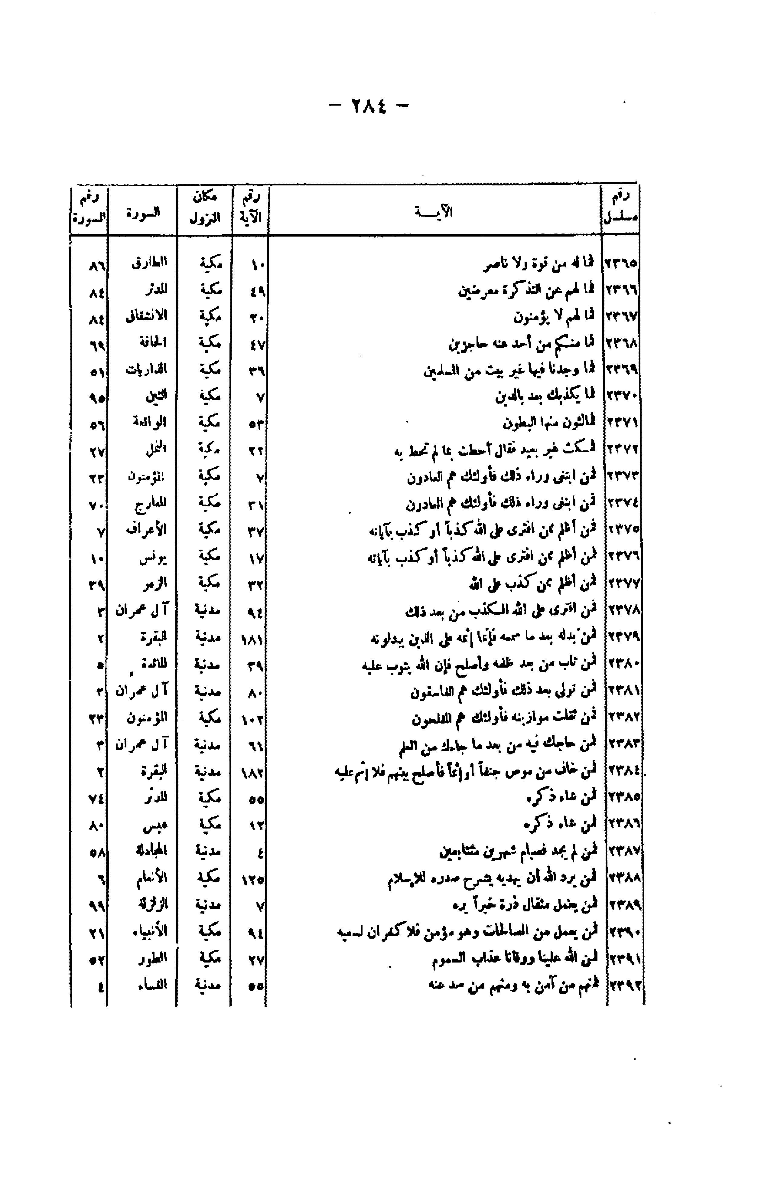 رقم مسلسل/ الآية/ رقم الآية/ مكان النزول/ السورة/ رقم السورة 2365/ فَما لَهُ مِنْ قُوَّةٍ وَلا ناصِرٍ/ 10/ مكية/ الطارق/ 86 2366/ فَما لَهُمْ عَنِ التَّذْكِرَةِ مُعْرِضِينَ/ 49/ مكية/ المدثر/ 84 2367/ فَما لَهُمْ لا يُؤْمِنُونَ/ 20/ مكية/ الانشقاق/ 84 2368/ فَما مِنْكُمْ مِنْ أَحَدٍ عَنْهُ حاجِزِينَ/ 47/ مكية/ الحاقة/ 69 2369/ فَما وَجَدْنا فِيها غَيْرَ بَيْتٍ مِنَ الْمُسْلِمِينَ/ 36/ مكية/ الذاريات/ 51 2370/ فَما يُكَذِّبُكَ بَعْدُ بِالدِّينِ/ 7/ مكية/ التين/ 95 2371/ فَمالِؤُنَ مِنْهَا الْبُطُونَ/ 53/ مكية/ الواقعة/ 56 2372/ فَمَكَثَ غَيْرَ بَعِيدٍ فَقالَ أَحَطْتُ بِما لَمْ تُحِطْ بِهِ/ 22/ مكية/ النمل/ 27 2373/ فَمَنِ ابْتَغى وَراءَ ذلِكَ فَأُولئِكَ هُمُ العادُونَ/ 7/ مكية/ المؤمنون/ 23 2374/ فَمَنِ ابْتَغى وَراءَ ذلِكَ فَأُولئِكَ هُمُ العادُونَ/ 31/ مكية/ المعارج/ 70 2375/ فَمَنْ أَظْلَمُ مِمَّنِ افْتَرى عَلَى اللَّهِ كَذِباً أَوْ كَذَّبَ بِآياتِهِ/ 37/ مكية/ الأعراف/ 7 2376/ فَمَنْ أَظْلَمُ مِمَّنِ افْتَرى عَلَى اللَّهِ كَذِباً أَوْ كَذَّبَ بِآياتِهِ/ 17/ مكية/ يونس/ 10 2377/ فَمَنْ أَظْلَمُ مِمَّنْ كَذَبَ عَلَى اللَّهِ/ 32/ مكية/ الزمر/ 39 2378/ فَمَنِ افْتَرى عَلَى اللَّهِ الْكَذِبَ مِنْ بَعْدِ ذلِكَ