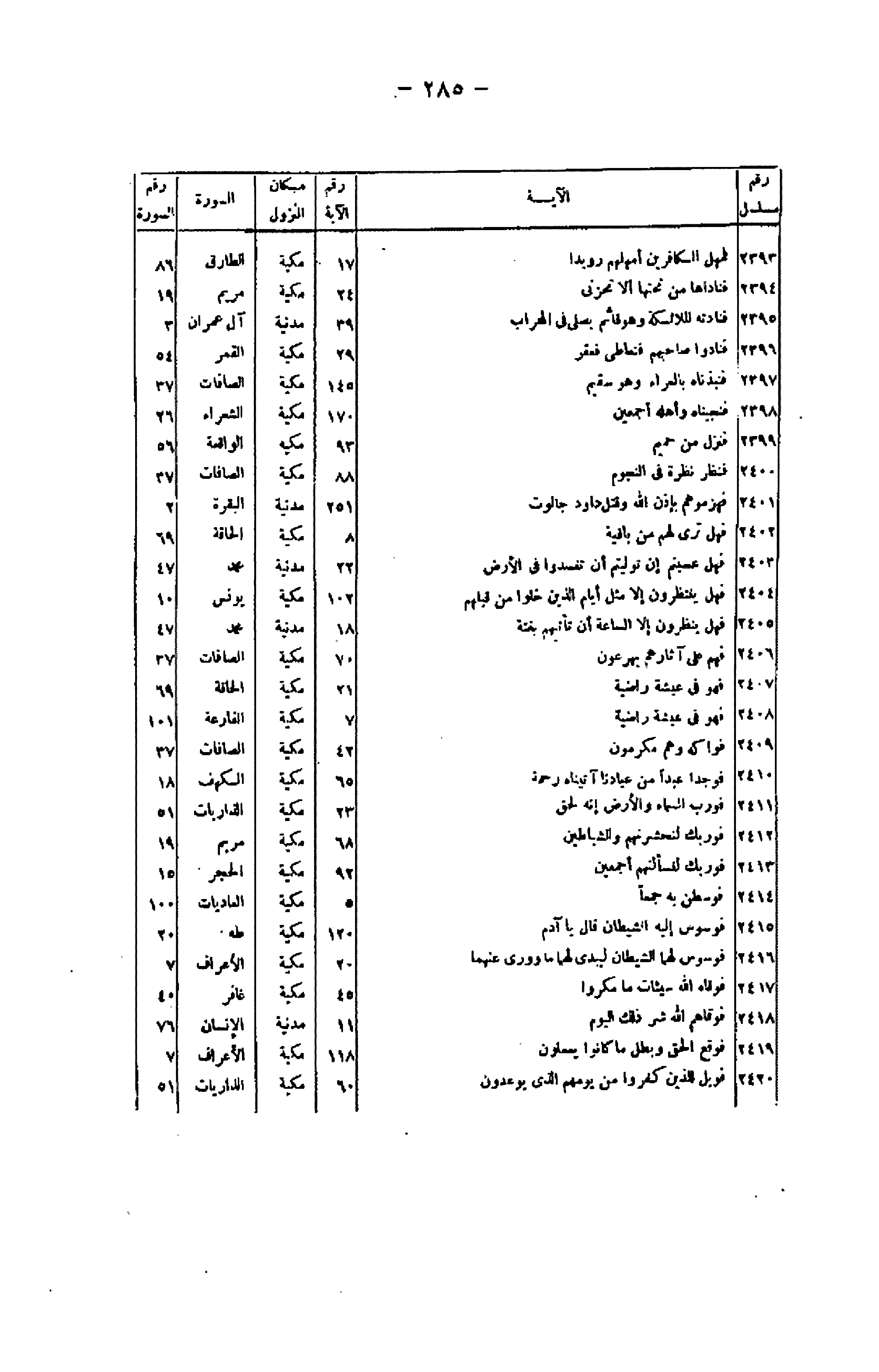 رقم مسلسل/ الآية/ رقم الآية/ مكان النزول/ السورة/ رقم السورة 2393/ فَمَهِّلِ الْكافِرِينَ أَمْهِلْهُمْ رُوَيْداً/ 17/ مكية/ الطارق/ 86 2394/ فَناداها مِنْ تَحْتِها أَلَّا تَحْزَنِي/ 24/ مكية/ مريم/ 19 2395/ فَنادَتْهُ الْمَلائِكَةُ وَهُوَ قائِمٌ يُصَلِّي فِي الْمِحْرابِ/ 39/ مدنية/ آل عمران/ 3 2396/ فَنادَوْا صاحِبَهُمْ فَتَعاطى فَعَقَرَ/ 29/ مكية/ القمر/ 54 2397/ فَنَبَذْناهُ بِالْعَراءِ وَهُوَ سَقِيمٌ/ 145/ مكية/ الصافات/ 37 2398/ فَنَجَّيْناهُ وَأَهْلَهُ أَجْمَعِينَ/ 170/ مكية/ الشعراء/ 26 2399/ فَنُزُلٌ مِنْ حَمِيمٍ/ 93/ مكية/ الواقعة/ 56 2400/ فَنَظَرَ نَظْرَةً فِي النُّجُومِ/ 88/ مكية/ الصافات/ 37 2401/ فَهَزَمُوهُمْ بِإِذْنِ اللَّهِ وَقَتَلَ داوُدُ جالُوتَ/ 251/ مدنية/ البقرة/ 2 2402/ فَهَلْ تَرى لَهُمْ مِنْ باقِيَةٍ/ 8/ مكية/ الحاقة/ 69 2403/ فَهَلْ عَسَيْتُمْ إِنْ تَوَلَّيْتُمْ أَنْ تُفْسِدُوا فِي الْأَرْضِ/ 22/ مدنية/ محمد/ 47 2404/ فَهَلْ يَنْتَظِرُونَ إِلَّا مِثْلَ أَيَّامِ الَّذِينَ خَلَوْا مِنْ قَبْلِهِمْ/ 102/ مكية/ يونس/ 10 2405/ فَهَلْ يَنْظُرُونَ إِلَّا السَّاعَةَ أَنْ تَأْتِيَهُمْ بَغْتَةً/ 18/ مدنية/ محمد/ 47 2406/ فَهُمْ عَلى آثارِهِمْ يُهْرَعُونَ/ 70/ مكية/ الصافات/ 37 2407/ فَهُوَ فِي عِيشَةٍ راضِيَةٍ/ 21/ مكية/ الحاقة/ 69 2408/ فَهُوَ فِي عِيشَةٍ راضِيَةٍ/ 7/ مكية/ القارعة/ 101 2409/ فَواكِهُ وَهُمْ مُكْرَمُونَ/ 42/ مكية/ الصافات/ 37 2410/ فَوَجَدا عَبْداً مِنْ عِبادِنا آتَيْناهُ رَحْمَةً/ 65/ مكية/ الكهف/ 18 2411/ فَوَ رَبِّ السَّماءِ وَالْأَرْضِ إِنَّهُ لَحَقٌّ/ 23/ مكية/ الذاريات/ 51 2412/ فَوَ رَبِّكَ لَنَحْشُرَنَّهُمْ وَالشَّياطِينَ/ 68/ مكية/ مريم/ 19 2413/ فَوَ رَبِّكَ لَنَسْئَلَنَّهُمْ أَجْمَعِينَ/ 92/ مكية/ الحجر/ 15 2414/ فَوَسَطْنَ بِهِ جَمْعاً/ 5/ مكية/ العاديات/ 100 2415/ فَوَسْوَسَ إِلَيْهِ الشَّيْطانُ قالَ يا آدَمُ/ 120/ مكية/ طه/ 20 2416/ فَوَسْوَسَ لَهُمَا الشَّيْطانُ لِيُبْدِيَ لَهُما ما وُورِيَ عَنْهُما/ 20/ مكية/ الأعراف/ 7 2417/ فَوَقاهُ اللَّهُ سَيِّئاتِ ما مَكَرُوا/ 45/ مكية/ غافر/ 40 2418/ فَوَقاهُمُ اللَّهُ شَرَّ ذلِكَ الْيَوْمِ/ 11/ مدنية/ الإنسان/ 76 2419/ فَوَقَعَ الْحَقُّ وَبَطَلَ ما كانُوا يَعْمَلُونَ/ 118/ مكية/ الأعراف/ 7 2420/ فَوَيْلٌ لِلَّذِينَ كَفَرُوا مِنْ يَوْمِهِمُ الَّذِي يُوعَدُونَ/ 60/ مكية/ الذاريات/ 51