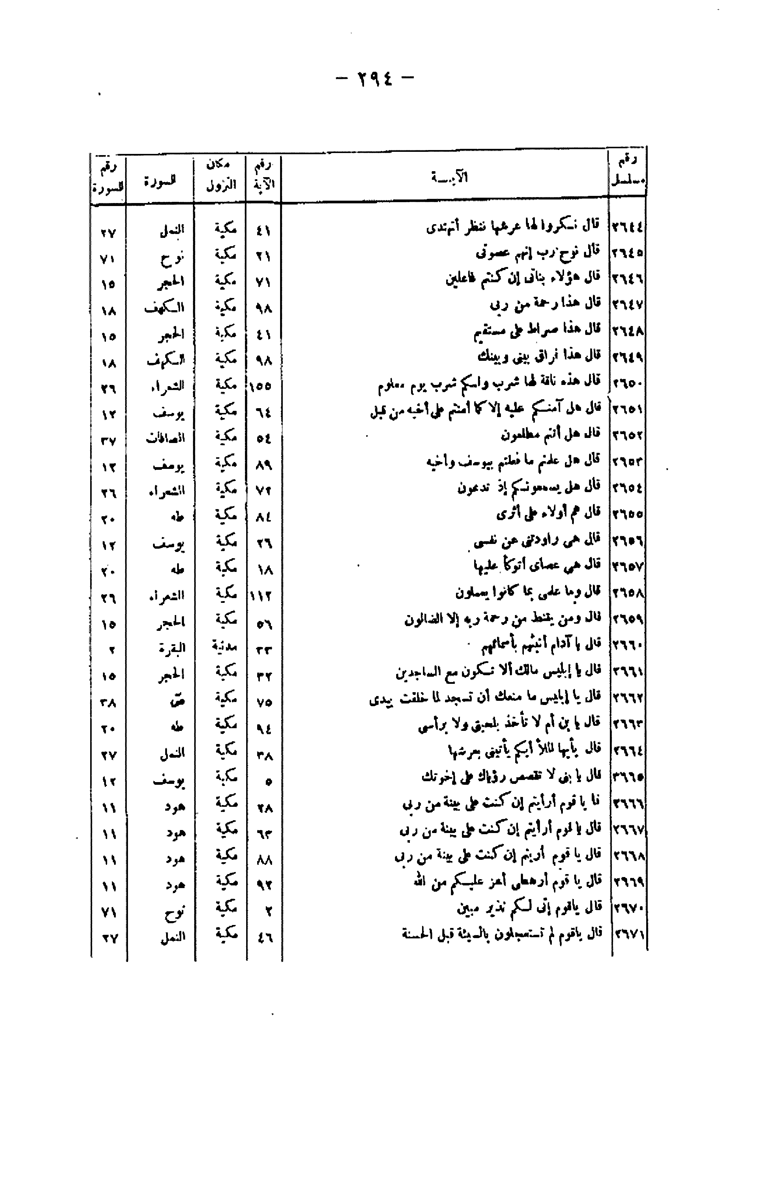 رقم مسلسل/ الآية/ رقم الآية/ مكان النزول/ السورة/ رقم السورة 2644/ قالَ نَكِّرُوا لَها عَرْشَها نَنْظُرْ أَتَهْتَدِي/ 41/ مكية/ النمل/ 27 2645/ قالَ نُوحٌ رَبِّ إِنَّهُمْ عَصَوْنِي/ 21/ مكية/ نوح/ 71 2646/ قالَ هؤُلاءِ بَناتِي إِنْ كُنْتُمْ فاعِلِينَ/ 71/ مكية/ الحجر/ 15 2647/ قالَ هذا رَحْمَةٌ مِنْ رَبِّي/ 98/ مكية/ الكهف/ 18 2648/ قالَ هذا صِراطٌ عَلَيَّ مُسْتَقِيمٌ/ 41/ مكية/ الحجر/ 15 2649/ قالَ هذا فِراقُ بَيْنِي وَبَيْنِكَ/ 98/ مكية/ الكهف/ 18 2650/ قالَ هذِهِ ناقَةٌ لَها شِرْبٌ وَلَكُمْ شِرْبُ يَوْمٍ مَعْلُومٍ/ 155/ مكية/ الشعراء/ 26 2651/ قالَ هَلْ آمَنُكُمْ عَلَيْهِ إِلَّا كَما أَمِنْتُكُمْ عَلى أَخِيهِ مِنْ قَبْلُ/ 64/ مكية/ يوسف/ 12 2652/ قالَ هَلْ أَنْتُمْ مُطَّلِعُونَ/ 54/ مكية/ الصافات/ 37 2653/ قالَ هَلْ عَلِمْتُمْ ما فَعَلْتُمْ بِيُوسُفَ وَأَخِيهِ/ 89/ مكية/ يوسف/ 12 2654/ قالَ هَلْ يَسْمَعُونَكُمْ إِذْ تَدْعُونَ/ 72/ مكية/ الشعراء/ 26 2655/ قالَ هُمْ أُولاءِ عَلى أَثَرِي/ 84/ مكية/ طه/ 20 2656/ قالَ هِيَ راوَدَتْنِي عَنْ نَفْسِي/ 26/ مكية/ يوسف/ 12 2657/ قالَ هِيَ عَصايَ أَتَوَكَّؤُا عَلَيْها/ 18/ مكية/ طه/ 20 2658/ قالَ وَما عِلْمِي بِما كانُوا يَعْمَلُونَ/ 112/ مكية/ الشعراء/ 26 2659/ قالَ وَمَنْ يَقْنَطُ مِنْ رَحْمَةِ رَبِّهِ إِلَّا الضَّالُّونَ/ 56/ مكية/ الحجر/ 15 2660/ قالَ يا آدَمُ أَنْبِئْهُمْ بِأَسْمائِهِمْ/ 33/ مدنية/ البقرة/ 2 2661/ قالَ يا إِبْلِيسُ ما لَكَ أَلَّا تَكُونَ مَعَ السَّاجِدِينَ/ 32/ مكية/ الحجر/ 15 2662/ قالَ يا إِبْلِيسُ ما مَنَعَكَ أَنْ تَسْجُدَ لِما خَلَقْتُ بِيَدَيَّ/ 75/ مكية/ ص/ 38 2663/الَ يَا بْنَ أُمَّ لا تَأْخُذْ بِلِحْيَتِي وَلا بِرَأْسِي