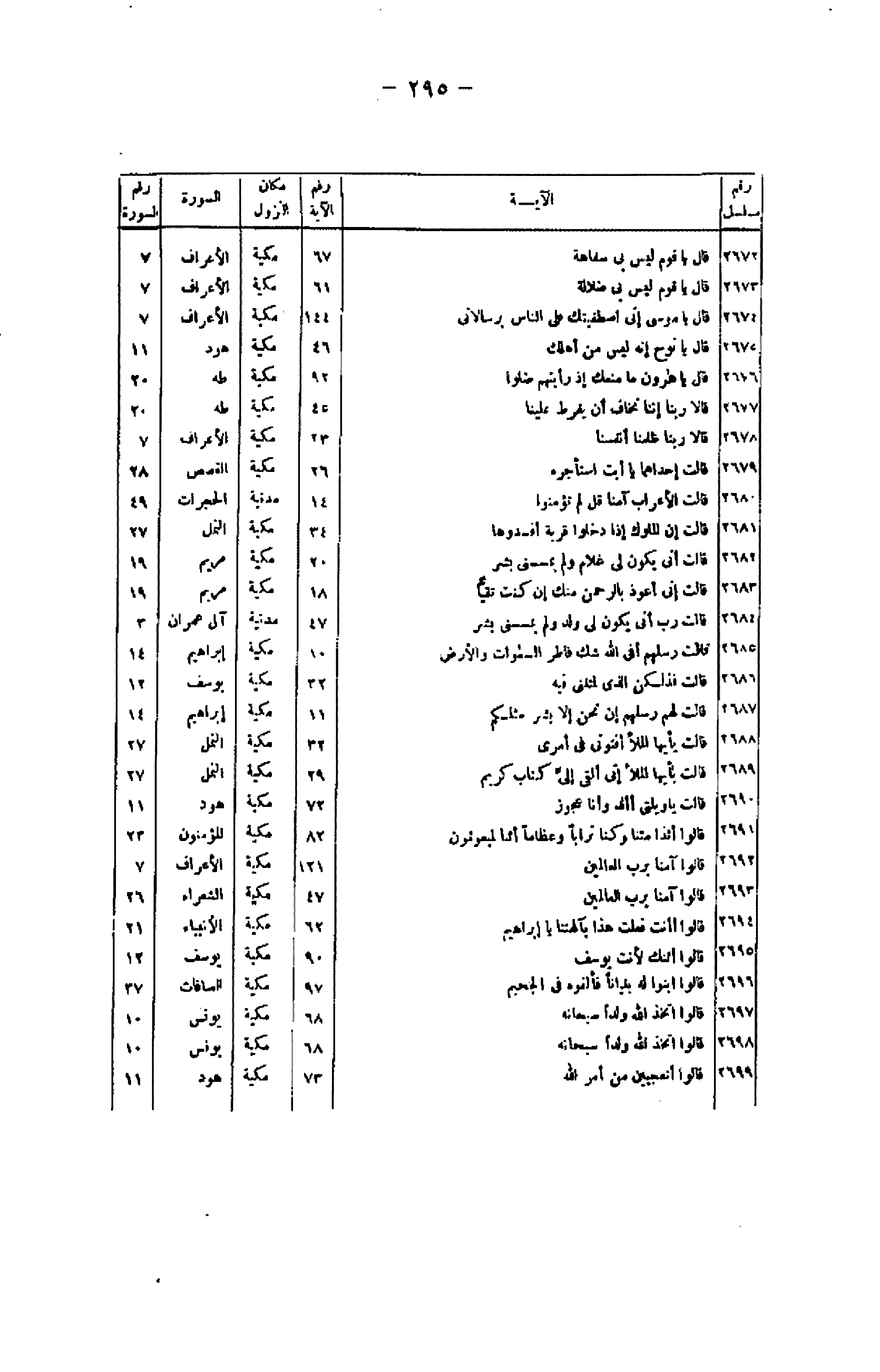 رقم مسلسل/ الآية/ رقم الآية/ مكان النزول/ السورة/ رقم السورة 2672/ قالَ يا قَوْمِ لَيْسَ بِي سَفاهَةٌ/ 67/ مكية/ الأعراف/ 7 2673/ قالَ يا قَوْمِ لَيْسَ بِي ضَلالَةٌ/ 61/ مكية/ الأعراف/ 7 2674/ قالَ يا مُوسى إِنِّي اصْطَفَيْتُكَ عَلَى النَّاسِ بِرِسالاتِي/ 144/ مكية/ الأعراف/ 7 2675/ قالَ يا نُوحُ إِنَّهُ لَيْسَ مِنْ أَهْلِكَ/ 46/ مكية/ هود/ 11 2676/ قالَ يا هارُونُ ما مَنَعَكَ إِذْ رَأَيْتَهُمْ ضَلُّوا/ 92/ مكية/ طه/ 20 2677/ قالا رَبَّنا إِنَّنا نَخافُ أَنْ يَفْرُطَ عَلَيْنا/ 45/ مكية/ طه/ 20 2678/ قالا رَبَّنا ظَلَمْنا أَنْفُسَنا/ 23/ مكية/ الأعراف/ 7 2679/ قالَتْ إِحْداهُما يا أَبَتِ اسْتَأْجِرْهُ/ 26/ مكية/ القصص/ 28 2680/ قالَتِ الْأَعْرابُ آمَنَّا قُلْ لَمْ تُؤْمِنُوا/ 14/ مدنية/ الحجرات/ 49 2681/ قالَتْ إِنَّ الْمُلُوكَ إِذا دَخَلُوا قَرْيَةً أَفْسَدُوها/ 34/ مكية/ النمل/ 27 2682/ قالَتْ أَنَّى يَكُونُ لِي غُلامٌ وَلَمْ يَمْسَسْنِي بَشَرٌ/ 20/ مكية/ مريم/ 19 2683/ قالَتْ إِنِّي أَعُوذُ بِالرَّحْمنِ مِنْكَ إِنْ كُنْتَ تَقِيًّا
