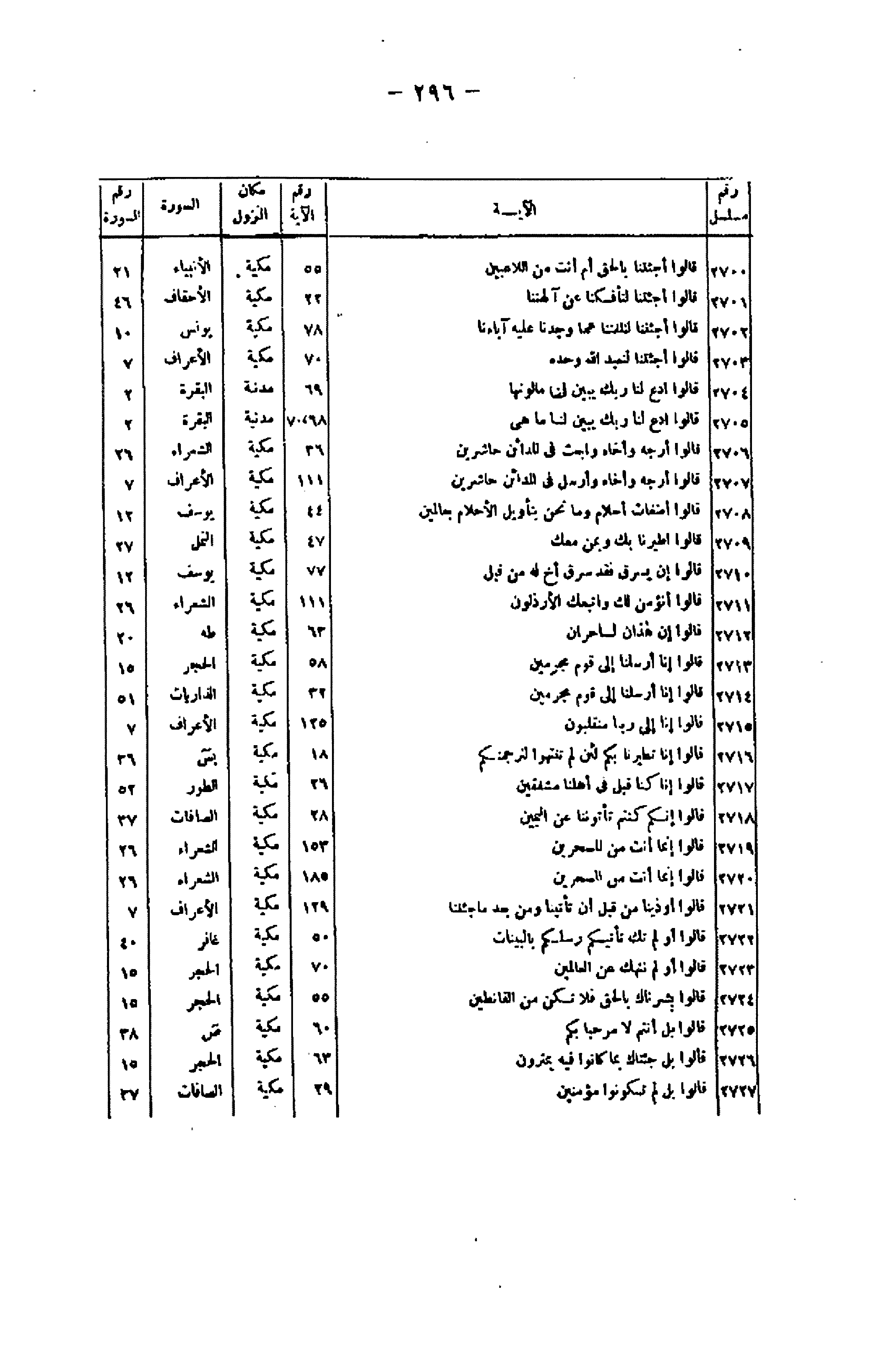 رقم مسلسل/ الآية/ رقم الآية/ مكان النزول/ السورة/ رقم السورة 2700/ قالُوا أَجِئْتَنا بِالْحَقِّ أَمْ أَنْتَ مِنَ اللَّاعِبِينَ/ 55/ مكية/ الأنبياء/ 21 2701/ قالُوا أَجِئْتَنا لِتَأْفِكَنا عَنْ آلِهَتِنا/ 22/ مكية/ الأحقاف/ 46 2702/ قالُوا أَجِئْتَنا لِتَلْفِتَنا عَمَّا وَجَدْنا عَلَيْهِ آباءَنا/ 78/ مكية/ يونس/ 10 2703/ قالُوا أَجِئْتَنا لِنَعْبُدَ اللَّهَ وَحْدَهُ/ 70/ مكية/ الأعراف/ 7 2704/ قالُوا ادْعُ لَنا رَبَّكَ يُبَيِّنْ لَنا ما لَوْنُها/ 69/ مدنية/ البقرة/ 2 2705/ قالُوا ادْعُ لَنا رَبَّكَ يُبَيِّنْ لَنا ما هِيَ/ 69، 70/ مدنية/ البقرة/ 2 2706/ قالُوا أَرْجِهْ وَأَخاهُ وَابْعَثْ فِي الْمَدائِنِ حاشِرِينَ/ 36/ مكية/ الشعراء/ 26 2707/ قالُوا أَرْجِهْ وَأَخاهُ وَأَرْسِلْ فِي الْمَدائِنِ حاشِرِينَ/ 111/ مكية/ الأعراف/ 7 2708/ قالُوا أَضْغاثُ أَحْلامٍ وَما نَحْنُ بِتَأْوِيلِ الْأَحْلامِ بِعالِمِينَ/ 44/ مكية/ يوسف/ 12 2709/ قالُوا اطَّيَّرْنا بِكَ وَبِمَنْ مَعَكَ/ 47/ مكية/ النمل/ 27 2710/ قالُوا إِنْ يَسْرِقْ فَقَدْ سَرَقَ أَخٌ لَهُ مِنْ قَبْلُ/ 77/ مكية/ يوسف/ 12 2711/ قالُوا أَنُؤْمِنُ لَكَ وَاتَّبَعَكَ الْأَرْذَلُونَ/ 111/ مكية/ الشعراء/ 26 2712/ قالُوا إِنْ هذانِ لَساحِرانِ/ 63/ مكية/ طه/ 20 2713/ قالُوا إِنَّا أُرْسِلْنا إِلى قَوْمٍ مُجْرِمِينَ/ 58/ مكية/ الحجر/ 15 2714/ قالُوا إِنَّا أُرْسِلْنا إِلى قَوْمٍ مُجْرِمِينَ/ 32/ مكية/ الذاريات/ 51 2715/ قالُوا إِنَّا إِلى رَبِّنا مُنْقَلِبُونَ/ 125/ مكية/ الأعراف/ 7 2716/ قالُوا إِنَّا تَطَيَّرْنا بِكُمْ لَئِنْ لَمْ تَنْتَهُوا لَنَرْجُمَنَّكُمْ/ 18/ مكية/ يس/ 36 2717/ قالُوا إِنَّا كُنَّا قَبْلُ فِي أَهْلِنا مُشْفِقِينَ/ 26/ مكية/ الطور/ 52 2718/ قالُوا إِنَّكُمْ كُنْتُمْ تَأْتُونَنا عَنِ الْيَمِينِ/ 28/ مكية/ الصافات/ 37 2719/ قالُوا إِنَّما أَنْتَ مِنَ الْمُسَحَّرِينَ/ 153/ مكية/ الشعراء/ 26 2720/ قالُوا إِنَّما أَنْتَ مِنَ الْمُسَحَّرِينَ/ 185/ مكية/ الشعراء/ 26 2721/ قالُوا أُوذِينا مِنْ قَبْلِ أَنْ تَأْتِيَنا وَمِنْ بَعْدِ ما جِئْتَنا/ 129/ مكية/ الأعراف/ 7 2722/ قالُوا أَوَلَمْ تَكُ تَأْتِيكُمْ رُسُلُكُمْ بِالْبَيِّناتِ