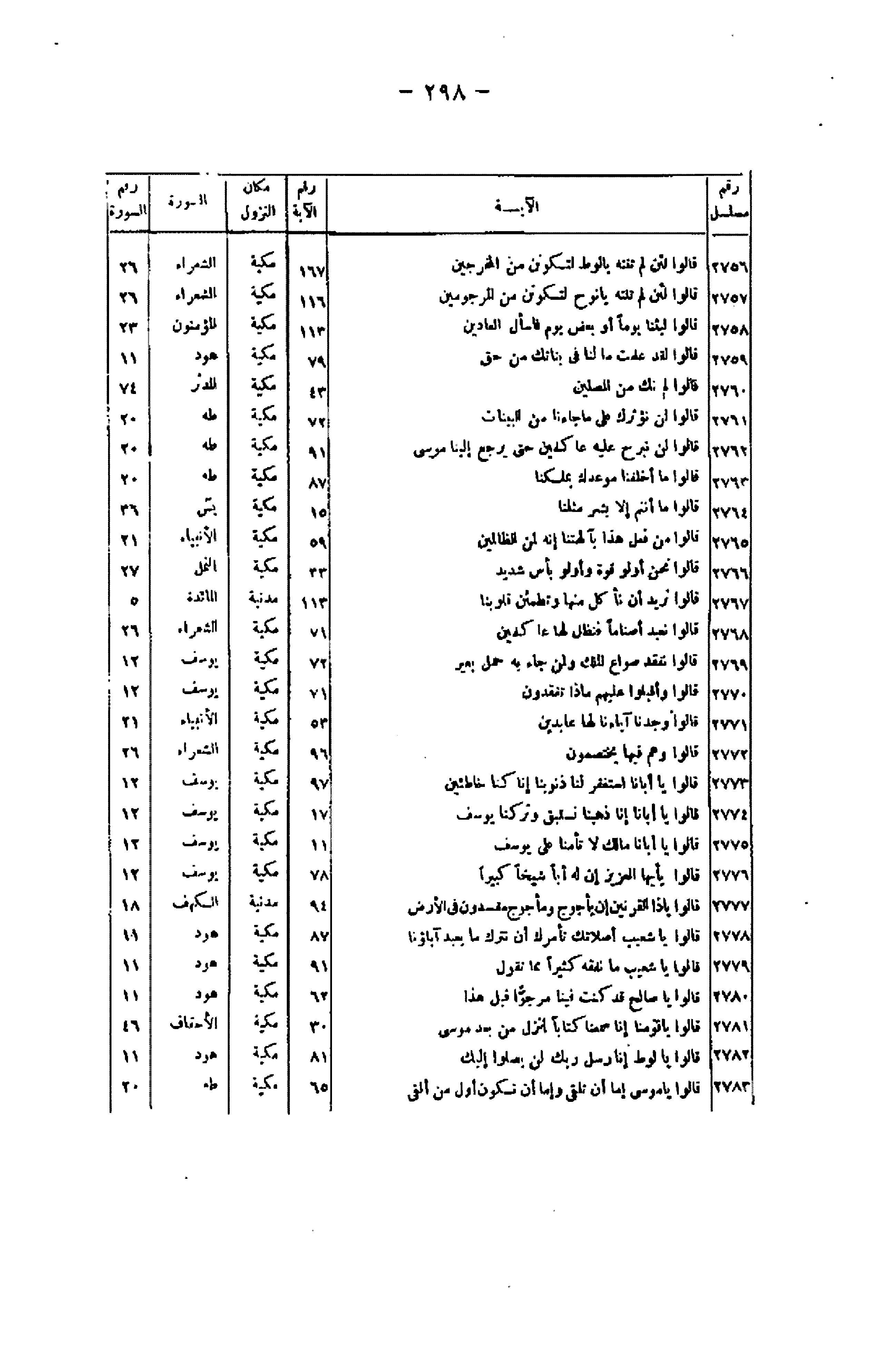 رقم مسلسل/ الآية/ رقم الآية/ مكان النزول/ السورة/ رقم السورة 2756/ قالُوا لَئِنْ لَمْ تَنْتَهِ يا لُوطُ لَتَكُونَنَّ مِنَ الْمُخْرَجِينَ/ 167/ مكية/ الشعراء/ 26 2757/ قالُوا لَئِنْ لَمْ تَنْتَهِ يا نُوحُ لَتَكُونَنَّ مِنَ الْمَرْجُومِينَ/ 116/ مكية/ الشعراء/ 26 2758/ قالُوا لَبِثْنا يَوْماً أَوْ بَعْضَ يَوْمٍ فَسْئَلِ الْعادِّينَ/ 113/ مكية/ المؤمنون/ 23 2759/ قالُوا لَقَدْ عَلِمْتَ ما لَنا فِي بَناتِكَ مِنْ حَقٍّ/ 79/ مكية/ هود/ 11 2760/ قالُوا لَمْ نَكُ مِنَ الْمُصَلِّينَ/ 43/ مكية/ المدثر/ 74 2761/ قالُوا لَنْ نُؤْثِرَكَ عَلى ما جاءَنا مِنَ الْبَيِّناتِ/ 72/ مكية/ طه/ 20 2762/ قالُوا لَنْ نَبْرَحَ عَلَيْهِ عاكِفِينَ حَتَّى يَرْجِعَ إِلَيْنا مُوسى / 91/ مكية/ طه/ 20 2763/ قالُوا ما أَخْلَفْنا مَوْعِدَكَ بِمَلْكِنا/ 87/ مكية/ طه/ 20 2764/ قالُوا ما أَنْتُمْ إِلَّا بَشَرٌ مِثْلُنا/ 15/ مكية/ يس/ 36 2765/ قالُوا مَنْ فَعَلَ هذا بِآلِهَتِنا إِنَّهُ لَمِنَ الظَّالِمِينَ/ 59/ مكية/ الأنبياء/ 21 2766/ قالُوا نَحْنُ أُولُوا قُوَّةٍ وَأُولُوا بَأْسٍ شَدِيدٍ/ 33/ مكية/ النمل/ 27 2767/ قالُوا نُرِيدُ أَنْ نَأْكُلَ مِنْها وَتَطْمَئِنَّ قُلُوبُنا/ 113/ مدنية/ المائدة/ 5 2768/ قالُوا نَعْبُدُ أَصْناماً فَنَظَلُّ لَها عاكِفِينَ/ 71/ مكية/ الشعراء/ 26 2769/ قالُوا نَفْقِدُ صُواعَ الْمَلِكِ وَلِمَنْ جاءَ بِهِ حِمْلُ بَعِيرٍ/ 72/ مكية/ يوسف/ 12 2770/ قالُوا وَأَقْبَلُوا عَلَيْهِمْ ماذا تَفْقِدُونَ/ 71/ مكية/ الشعراء/ 26 2771/ قالُوا وَجَدْنا آباءَنا لَها عابِدِينَ/ 53/ مكية