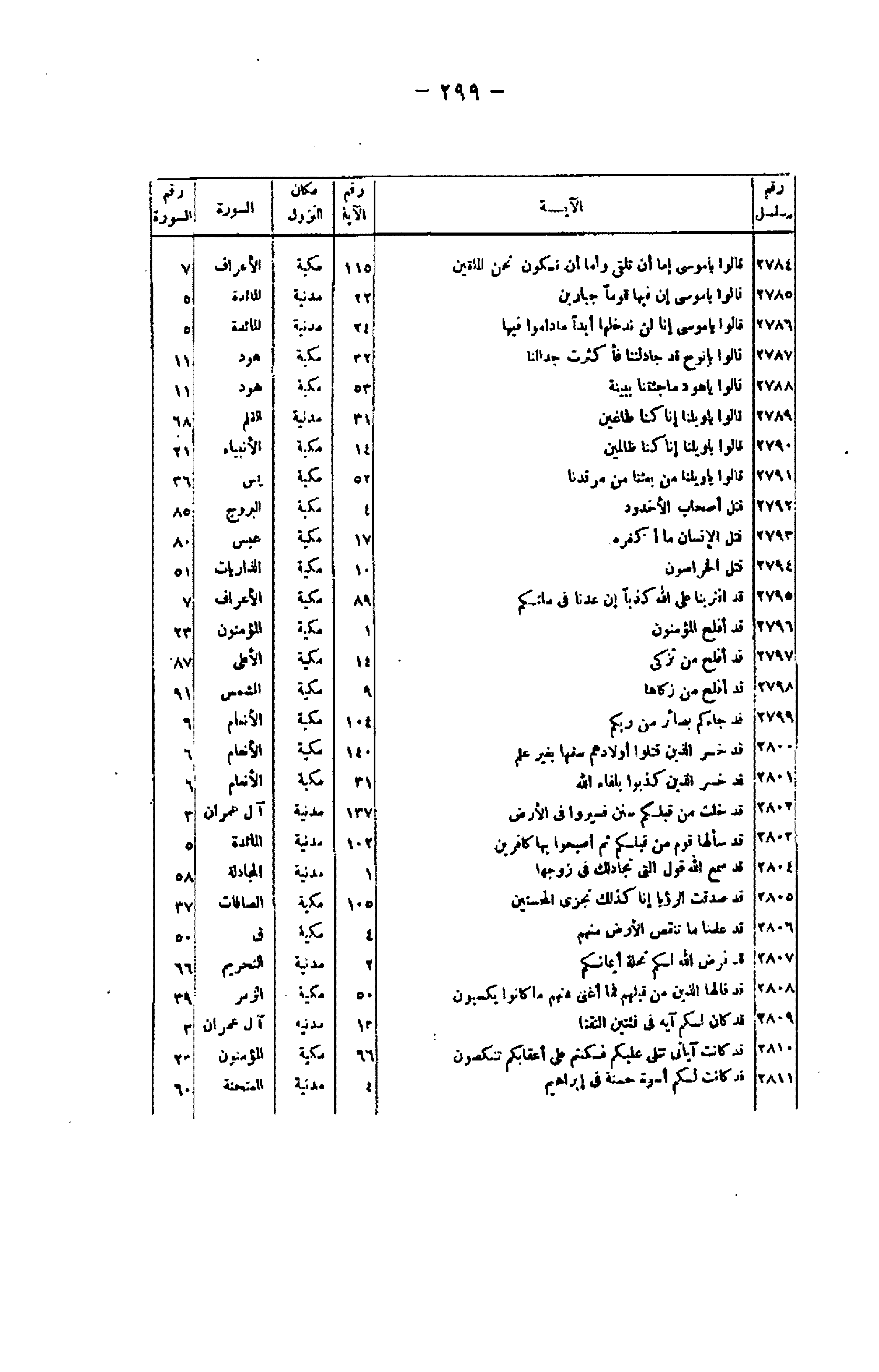 رقم مسلسل/ الآية/ رقم الآية/ مكان النزول/ السورة/ رقم السورة 2784/ قالُوا يا مُوسى إِمَّا أَنْ تُلْقِيَ وَإِمَّا أَنْ نَكُونَ نَحْنُ الْمُلْقِينَ/ 115/ مكية/ الأعراف/ 7 2785/ قالُوا يا مُوسى إِنَّ فِيها قَوْماً جَبَّارِينَ/ 22/ مدنية/ المائدة/ 5 2786/ قالُوا يا مُوسى إِنَّا لَنْ نَدْخُلَها أَبَداً ما دامُوا فِيها/ 24/ مدنية/ المائدة/ 5 2787/ قالُوا يا نُوحُ قَدْ جادَلْتَنا فَأَكْثَرْتَ جِدالَنا/ 32/ مكية/ هود/ 11 2788/ قالُوا يا هُودُ ما جِئْتَنا بِبَيِّنَةٍ/ 53/ مكية/ هود/ 11 2789/ قالُوا يا وَيْلَنا إِنَّا كُنَّا طاغِينَ/ 31/ مدنية/ القلم/ 68 2790/ قالُوا يا وَيْلَنا إِنَّا كُنَّا ظالِمِينَ/ 14/ مكية/ الأنبياء/ 21 2791/ قالُوا يا وَيْلَنا مَنْ بَعَثَنا مِنْ مَرْقَدِنا/ 52/ مكية/ يس/ 36 2792/ قُتِلَ أَصْحابُ الْأُخْدُودِ/ 4/ مكية/ البروج/ 85 2793/ قُتِلَ الْإِنْسانُ ما أَكْفَرَهُ/ 17/ مكية/ عبس/ 80 2794/ قُتِلَ الْخَرَّاصُونَ/ 10/ مكية/ الذاريات/ 51 2795/ قَدِ افْتَرَيْنا عَلَى اللَّهِ كَذِباً إِنْ عُدْنا فِي مِلَّتِكُمْ/ 89/ مكية/ الأعراف/ 7 2796/ قَدْ أَفْلَحَ الْمُؤْمِنُونَ/ 1/ مكية/ المؤمنون/ 23 2797/ قَدْ أَفْلَحَ مَنْ تَزَكَّى/ 14/ مكية/ الأعلى/ 87 2798/ قَدْ أَفْلَحَ مَنْ زَكَّاها/ 9/ مكية/ الشمس/ 91 2799/ قَدْ جاءَكُمْ بَصائِرُ مِنْ رَبِّكُمْ/ 104/ مكية/ الأنعام/ 6 2800/ قَدْ خَسِرَ الَّذِينَ قَتَلُوا أَوْلادَهُمْ سَفَهاً بِغَيْرِ عِلْمٍ/ 140/ مكية/ الأنعام/ 6 2801/ قَدْ خَسِرَ الَّذِينَ كَذَّبُوا بِلِقاءِ اللَّهِ/ 31/ مكية/ الأنعام/ 6 2802/ قَدْ خَلَتْ مِنْ قَبْلِكُمْ سُنَنٌ فَسِيرُوا فِي الْأَرْضِ/ 137/ مدنية/ آل عمران/ 3 2803/ قَدْ سَأَلَها قَوْمٌ مِنْ قَبْلِكُمْ ثُمَّ أَصْبَحُوا بِها كافِرِينَ/ 102/ مدنية/ المائدة/ 5 2804/ قَدْ سَمِعَ اللَّهُ قَوْلَ الَّتِي تُجادِلُكَ فِي زَوْجِها/ 1/ مدنية/ المجادلة/ 58 2805/ قَدْ صَدَّقْتَ الرُّؤْيا إِنَّا كَذلِكَ نَجْزِي الْمُحْسِنِينَ/ 105/ مكية/ الصافات/ 37 2806/ قَدْ عَلِمْنا ما تَنْقُصُ الْأَرْضُ مِنْهُمْ/ 4/ مكية/ ق/ 50 2807/ قَدْ فَرَضَ اللَّهُ لَكُمْ تَحِلَّةَ أَيْمانِكُمْ/ 2/ مدنية/ التحريم/ 66 2808/ قَدْ قالَهَا الَّذِينَ مِنْ قَبْلِهِمْ فَما أَغْنى عَنْهُمْ ما كانُوا يَكْسِبُونَ/ 50/ مكية/ الزمر/ 39 2809/ قَدْ كانَ لَكُمْ آيَةٌ فِي فِئَتَيْنِ الْتَقَتا/ 13/ مدنية/ آل عمران/ 3 2810/ قَدْ كانَتْ آياتِي تُتْلى عَلَيْكُمْ فَكُنْتُمْ عَلى أَعْقابِكُمْ تَنْكِصُونَ/ 66/ مكية/ المؤمنون/ 23 2811/ قَدْ كانَتْ لَكُمْ أُسْوَةٌ حَسَنَةٌ فِي إِبْراهِيمَ/ 4/ مدنية/ المتحنة/ 60