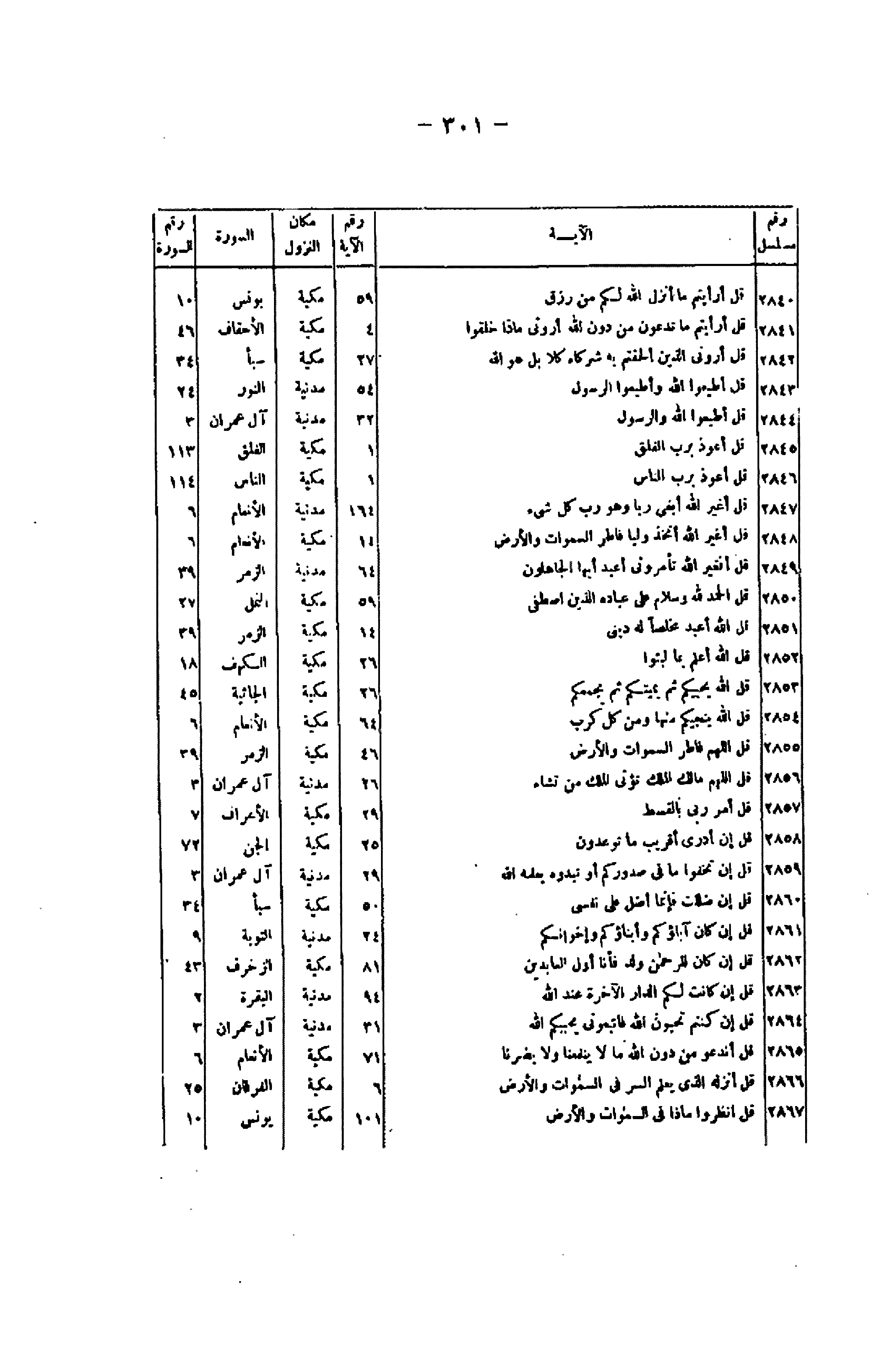 / يونس/ 10 2841/ قُلْ أَرَأَيْتُمْ ما تَدْعُونَ مِنْ دُونِ اللَّهِ أَرُونِي ماذا خَلَقُوا/ 4/ مكية/ الأحقاف/ 46 2842/ قُلْ أَرُونِيَ الَّذِينَ أَلْحَقْتُمْ بِهِ شُرَكاءَ كَلَّا بَلْ هُوَ اللَّهُ/ 27/ مكية/ سبأ/ 34 2843/ قُلْ أَطِيعُوا اللَّهَ وَأَطِيعُوا الرَّسُولَ/ 54/ مدنية/ النور/ 24 2844/ قُلْ أَطِيعُوا اللَّهَ وَالرَّسُولَ/ 32/ مدنية/ آل عمران/ 3 2845/ قُلْ أَعُوذُ بِرَبِّ الْفَلَقِ/ 1/ مكية/ الفلق/ 113 2846/ قُلْ أَعُوذُ بِرَبِّ النَّاسِ/ 1/ مكية/ الناس/ 114 2847/ قُلْ أَغَيْرَ اللَّهِ أَبْغِي رَبًّا وَهُوَ رَبُّ كُلِّ شَيْءٍ/ 164/ مدنية/ الأنعام/ 6 2848/ قُلْ أَغَيْرَ اللَّهِ أَتَّخِذُ وَلِيًّا فاطِرِ السَّماواتِ وَالْأَرْضِ/ 14/ مكية/ الأنعام/ 6 2849/ قُلْ أَفَغَيْرَ اللَّهِ تَأْمُرُونِّي أَعْبُدُ أَيُّهَا الْجاهِلُونَ/ 64/ مدنية/ الزمر/ 39 2850/ قُلِ الْحَمْدُ لِلَّهِ وَسَلامٌ عَلى عِبادِهِ الَّذِينَ اصْطَفى / 59/ مكية/ النمل/ 27 2851/ قُلِ اللَّهَ أَعْبُدُ مُخْلِصاً لَهُ دِينِي/ 14/ مكية/ الزمر/ 39 2852/ قُلِ اللَّهُ أَعْلَمُ بِما لَبِثُوا/ 26/ مكية/ الكهف/ 18 2853/ قُلِ اللَّهُ يُحْيِيكُمْ ثُمَّ يُمِيتُكُمْ ثُمَّ يَجْمَعُكُمْ/ 26/ مكية/ الجائية/ 45 2854/ قُلِ اللَّهُ يُنَجِّيكُمْ مِنْها وَمِنْ كُلِّ كَرْبٍ/ 64/ مكية/ الأنعام/ 6 2855/ قُلِ اللَّهُمَّ فاطِرَ السَّماواتِ وَالْأَرْضِ/ 46/ مكية/ الزمر/ 39 2856/ قُلِ اللَّهُمَّ مالِكَ الْمُلْكِ تُؤْتِي الْمُلْكَ مَنْ تَشاءُ/ 26/ مدنية/ آل عمران/ 3 2857/ قُلْ أَمَرَ رَبِّي بِالْقِسْطِ/ 29/ مكية/ الأعراف/ 7 2858/ قُلْ إِنْ أَدْرِي أَقَرِيبٌ ما تُوعَدُونَ/ 25/ مكية/ الجن/ 72 2859/ قُلْ إِنْ تُخْفُوا ما فِي صُدُورِكُمْ أَوْ تُبْدُوهُ يَعْلَمْهُ اللَّهُ/ 29/ مدنية/ آل عمران/ 3 2860/ قُلْ إِنْ ضَلَلْتُ فَإِنَّما أَضِلُّ عَلى نَفْسِي/ 50/ مكية/ سبأ/ 34 2861/ قُلْ إِنْ كانَ آباؤُكُمْ وَأَبْناؤُكُمْ وَإِخْوانُكُمْ/ 24/ مدنية/ التوبة/ 9 2862/ قُلْ إِنْ كانَ لِلرَّحْمنِ وَلَدٌ فَأَنَا أَوَّلُ الْعابِدِينَ/ 81/ مكية/ الزخرف/ 43 2863/ قُلْ إِنْ كانَتْ لَكُمُ الدَّارُ الْآخِرَةُ عِنْدَ اللَّهِ/ 94/ مدنية/ البقرة/ 2 2864/ قُلْ إِنْ كُنْتُمْ تُحِبُّونَ اللَّهَ فَاتَّبِعُونِي يُحْبِبْكُمُ اللَّهُ/ 31/ مدنية/ آل عمران/ 3 2865/ قُلْ أَنَدْعُوا مِنْ دُونِ اللَّهِ ما لا يَنْفَعُنا وَلا يَضُرُّنا/ 71/ مكية/ الأنعام/ 6 2866/ قُلْ أَنْزَلَهُ الَّذِي يَعْلَمُ السِّرَّ فِي السَّماواتِ وَالْأَرْضِ/ 6/ مكية/ الفرقان/ 25 2867/ قُلِ انْظُرُوا ماذا فِي السَّماواتِ وَالْأَرْضِ/ 101/ مكية/ يونس/ 10