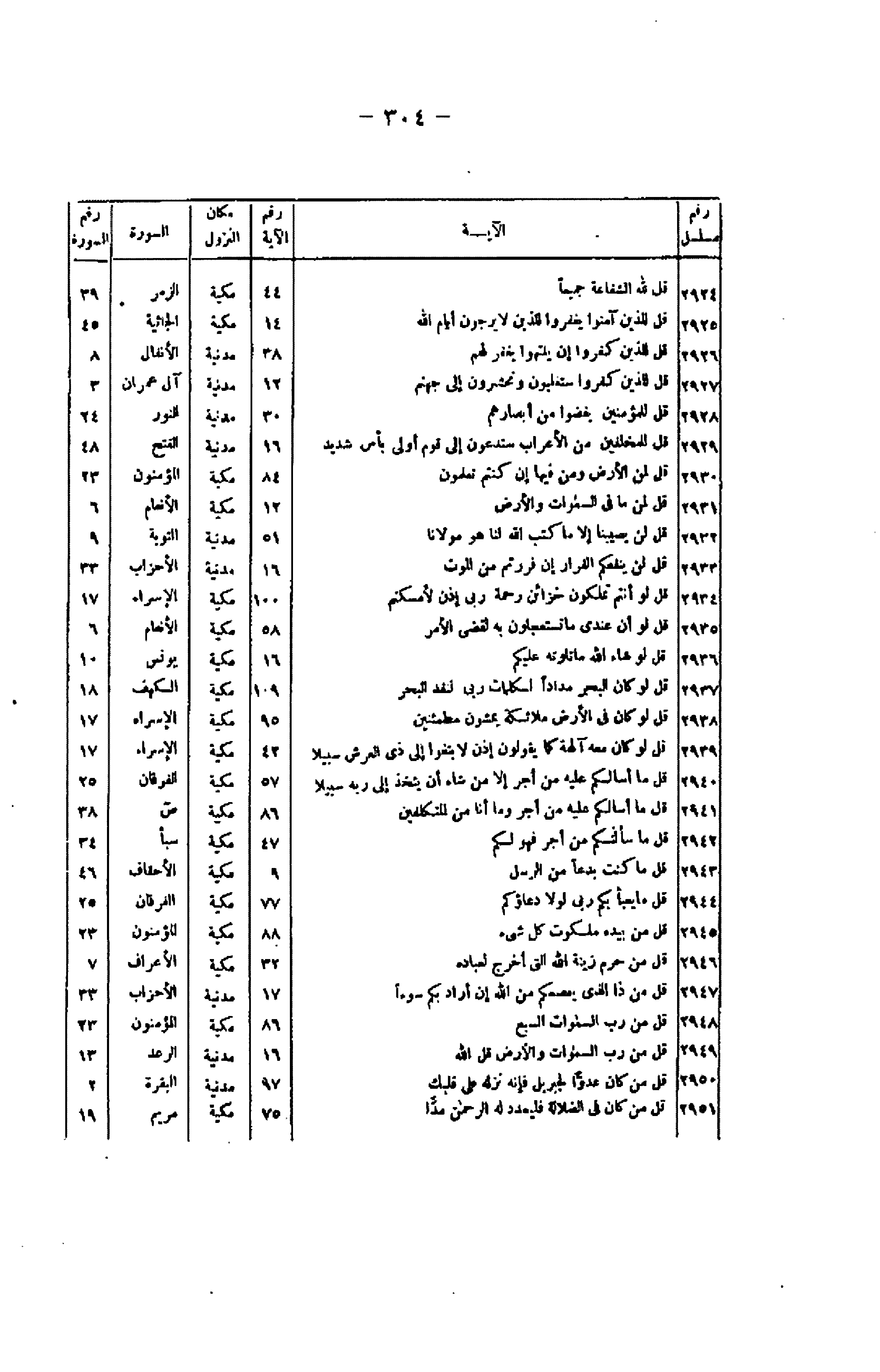 رقم مسلسل/ الآية/ رقم الآية/ مكان النزول/ السورة/ رقم السورة 2924/ قُلْ لِلَّهِ الشَّفاعَةُ جَمِيعاً/ 44/ مكية/ الزمر/ 39 2925/ قُلْ لِلَّذِينَ آمَنُوا يَغْفِرُوا لِلَّذِينَ لا يَرْجُونَ أَيَّامَ اللَّهِ/ 14/ مكية/ الجاثية/ 45 2926/ قُلْ لِلَّذِينَ كَفَرُوا إِنْ يَنْتَهُوا يُغْفَرْ لَهُمْ/ 38/ مدنية/ الأنفال/ 8 2927/ قُلْ لِلَّذِينَ كَفَرُوا سَتُغْلَبُونَ وَتُحْشَرُونَ إِلى جَهَنَّمَ/ 12/ مدنية/ آل عمران/ 3 2928/ قُلْ لِلْمُؤْمِنِينَ يَغُضُّوا مِنْ أَبْصارِهِمْ/ 30/ مدنية/ النور/ 24 2929/ قُلْ لِلْمُخَلَّفِينَ مِنَ الْأَعْرابِ سَتُدْعَوْنَ إِلى قَوْمٍ أُولِي بَأْسٍ شَدِيدٍ/ 16/ مدنية/ الفتح/ 48 2930/ قُلْ لِمَنِ الْأَرْضُ وَمَنْ فِيها إِنْ كُنْتُمْ تَعْلَمُونَ/ 84/ مكية/ المؤمنون/ 23 2931/ قُلْ لِمَنْ ما فِي السَّماواتِ وَالْأَرْضِ/ 12/ مكية/ الأنعام/ 6 2932/ قُلْ لَنْ يُصِيبَنا إِلَّا ما كَتَبَ اللَّهُ لَنا هُوَ مَوْلانا/ 51/ مدنية/ التوبة/ 9 2933/ قُلْ لَنْ يَنْفَعَكُمُ الْفِرارُ إِنْ فَرَرْتُمْ مِنَ الْمَوْتِ/ 16/ مدنية/ الأحزاب/ 33 2934/ قُلْ لَوْ أَنْتُمْ تَمْلِكُونَ خَزائِنَ رَحْمَةِ رَبِّي إِذاً لَأَمْسَكْتُمْ/ 100/ مكية/ الإسراء/ 17 2935/ قُلْ لَوْ أَنَّ عِنْدِي ما تَسْتَعْجِلُونَ بِهِ لَقُضِيَ الْأَمْرُ/ 58/ مكية/ الأنعام/ 6 2936/ قُلْ لَوْ شاءَ اللَّهُ ما تَلَوْتُهُ عَلَيْكُمْ/ 16/ مكية/ يونس/ 10 2937/ قُلْ لَوْ كانَ الْبَحْرُ مِداداً لِكَلِماتِ رَبِّي لَنَفِدَ الْبَحْرُ/ 109/ مكية/ الكهف/ 18 2938/ قُلْ لَوْ كانَ فِي الْأَرْضِ مَلائِكَةٌ يَمْشُونَ مُطْمَئِنِّينَ/ 95/ مكية/ الإسراء/ 17 2939/ قُلْ لَوْ كانَ مَعَهُ آلِهَةٌ كَما يَقُولُونَ إِذاً لَابْتَغَوْا إِلى ذِي الْعَرْشِ سَبِيلًا/ 42/ مكية/ الإسراء/ 17 2940/ قُلْ ما أَسْئَلُكُمْ عَلَيْهِ مِنْ أَجْرٍ إِلَّا مَنْ شاءَ أَنْ يَتَّخِذَ إِلى رَبِّهِ سَبِيلًا/ 57/ مكية/ الفرقان/ 25 2941/ قُلْ ما أَسْئَلُكُمْ عَلَيْهِ مِنْ أَجْرٍ وَما أَنَا مِنَ الْمُتَكَلِّفِينَ/ 86/ مكية/ ص/ 38 2942/ قُلْ ما سَأَلْتُكُمْ مِنْ أَجْرٍ فَهُوَ لَكُمْ/ 47/ مكية/ سبأ/ 34 2943/ قُلْ ما كُنْتُ بِدْعاً مِنَ الرُّسُلِ/ 9/ مكية/ الأحقاف/ 46 2944/ قُلْ ما يَعْبَؤُا بِكُمْ رَبِّي لَوْلا دُعاؤُكُمْ/ 77/ مكية/ الفرقان/ 25 2945/ قُلْ مَنْ بِيَدِهِ مَلَكُوتُ كُلِّ شَيْءٍ/ 88/ مكية/ المؤمنون/ 23 2946/ قُلْ مَنْ حَرَّمَ زِينَةَ اللَّهِ الَّتِي أَخْرَجَ لِعِبادِهِ/ 32/ مكية/ الأعراف/ 7 2947/ قُلْ مَنْ ذَا الَّذِي يَعْصِمُكُمْ مِنَ اللَّهِ إِنْ أَرادَ بِكُمْ سُوءاً/ 17/ مدنية/ الأحزاب/ 33 2948/ قُلْ مَنْ رَبُّ السَّماواتِ السَّبْعِ/ 86/ مكية/ المؤمنون/ 23 2949/ قُلْ مَنْ رَبُّ السَّماواتِ وَالْأَرْضِ قُلِ اللَّهُ/ 16/ مدنية/ الرعد/ 13 2950/ قُلْ مَنْ كانَ عَدُوًّا لِجِبْرِيلَ فَإِنَّهُ نَزَّلَهُ عَلى قَلْبِكَ/ 97/ مدنية/ البقرة/ 2 2951/ قُلْ مَنْ كانَ فِي الضَّلالَةِ فَلْيَمْدُدْ لَهُ الرَّحْمنُ مَدًّا/ 75/ مكية/ مريم/ 19