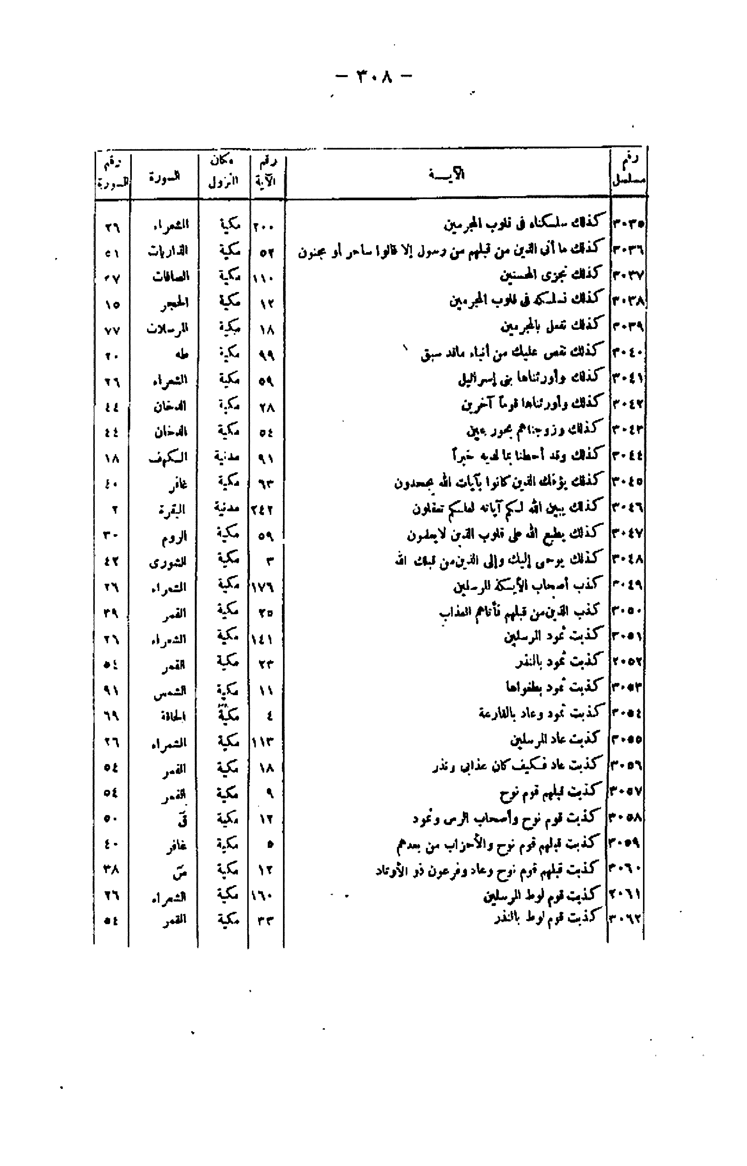 رقم مسلسل/ الآية/ رقم الآية/ مكان النزول/ السورة/ رقم السورة 3035/ كَذلِكَ سَلَكْناهُ فِي قُلُوبِ الْمُجْرِمِينَ/ 200/ مكية/ الشعراء/ 26 3036/ كَذلِكَ ما أَتَى الَّذِينَ مِنْ قَبْلِهِمْ مِنْ رَسُولٍ إِلَّا قالُوا ساحِرٌ أَوْ مَجْنُونٌ/ 52/ مكية/ الذاريات/ 51 3037/ كَذلِكَ نَجْزِي الْمُحْسِنِينَ/ 110/ مكية/ الصافات/ 27 3038/ كَذلِكَ نَسْلُكُهُ فِي قُلُوبِ الْمُجْرِمِينَ/ 12/ مكية/ الحجر/ 15 3039/ كَذلِكَ نَفْعَلُ بِالْمُجْرِمِينَ/ 18/ مكية/ المرسلات/ 77 3040/ كَذلِكَ نَقُصُّ عَلَيْكَ مِنْ أَنْباءِ ما قَدْ سَبَقَ/ 99/ مكية/ طه/ 20 3041/ كَذلِكَ وَأَوْرَثْناها بَنِي إِسْرائِيلَ/ 59/ مكية/ الشعراء/ 26 3042/ كَذلِكَ وَأَوْرَثْناها قَوْماً آخَرِينَ/ 28/ مكية/ الدخان/ 44 3043/ كَذلِكَ وَزَوَّجْناهُمْ بِحُورٍ عِينٍ/ 54/ مكية/ الدخان/ 44 3044/ كَذلِكَ وَقَدْ أَحَطْنا بِما لَدَيْهِ خُبْراً/ 91/ مدنية/ الكهف/ 18 3045/ كَذلِكَ يُؤْفَكُ الَّذِينَ كانُوا بِآياتِ اللَّهِ يَجْحَدُونَ/ 63/ مكية/ غافر/ 40 3046/ كَذلِكَ يُبَيِّنُ اللَّهُ لَكُمْ آياتِهِ لَعَلَّكُمْ تَعْقِلُونَ/ 242/ مدنية/ البقرة/ 2 3047/ كَذلِكَ يَطْبَعُ اللَّهُ عَلى قُلُوبِ الَّذِينَ لا يَعْلَمُونَ/ 59/ مكية/ الروم/ 30 3048/ كَذلِكَ يُوحِي إِلَيْكَ وَإِلَى الَّذِينَ مِنْ قَبْلِكَ اللَّهُ/ 3/ مكية/ الشورى/ 42 3049/ كَذَّبَ أَصْحابُ الْأَيْكَةِ الْمُرْسَلِينَ/ 176/ مكية/ الشعراء/ 26 3050/ كَذَّبَ الَّذِينَ مِنْ قَبْلِهِمْ فَأَتاهُمُ الْعَذابُ/ 25/ مكية/ القمر/ 39 3051/ كَذَّبَتْ ثَمُودُ الْمُرْسَلِينَ/ 141/ مكية/ الشعراء/ 26 3052/ كَذَّبَتْ ثَمُودُ بِالنُّذُرِ/ 23/ مكية/ القمر/ 54 3053/ كَذَّبَتْ ثَمُودُ بِطَغْواها/ 11/ مكية/ الشمس/ 91 3054/ كَذَّبَتْ ثَمُودُ وَعادٌ بِالْقارِعَةِ/ 4/ مكية/ الحاقة/ 69 3055/ كَذَّبَتْ عادٌ الْمُرْسَلِينَ/ 113/ مكية/ الشمراء/ 26 3056/ كَذَّبَتْ عادٌ فَكَيْفَ كانَ عَذابِي وَنُذُرِ/ 18/ مكية/ القمر/ 54 3057/ كَذَّبَتْ قَبْلَهُمْ قَوْمُ نُوحٍ/ 9/ مكية/ القمر/ 54 3058/ كَذَّبَتْ قَبْلَهُمْ قَوْمُ نُوحٍ وَأَصْحابُ الرَّسِّ وَثَمُودُ/ 12/ مكية/ ق/ 50 3059/ كَذَّبَتْ قَبْلَهُمْ قَوْمُ نُوحٍ وَالْأَحْزابُ مِنْ بَعْدِهِمْ/ 5/ مكية/ غافر/ 40 3060/ كَذَّبَتْ قَبْلَهُمْ قَوْمُ نُوحٍ وَعادٌ وَفِرْعَوْنُ ذُو الْأَوْتادِ/ 12/ مكية/ ص/ 38 3061/ كَذَّبَتْ قَوْمُ لُوطٍ الْمُرْسَلِينَ/ 160/ مكية/ الشعراء/ 26 3062/ كَذَّبَتْ قَوْمُ لُوطٍ بِالنُّذُرِ/ 33/ مكية