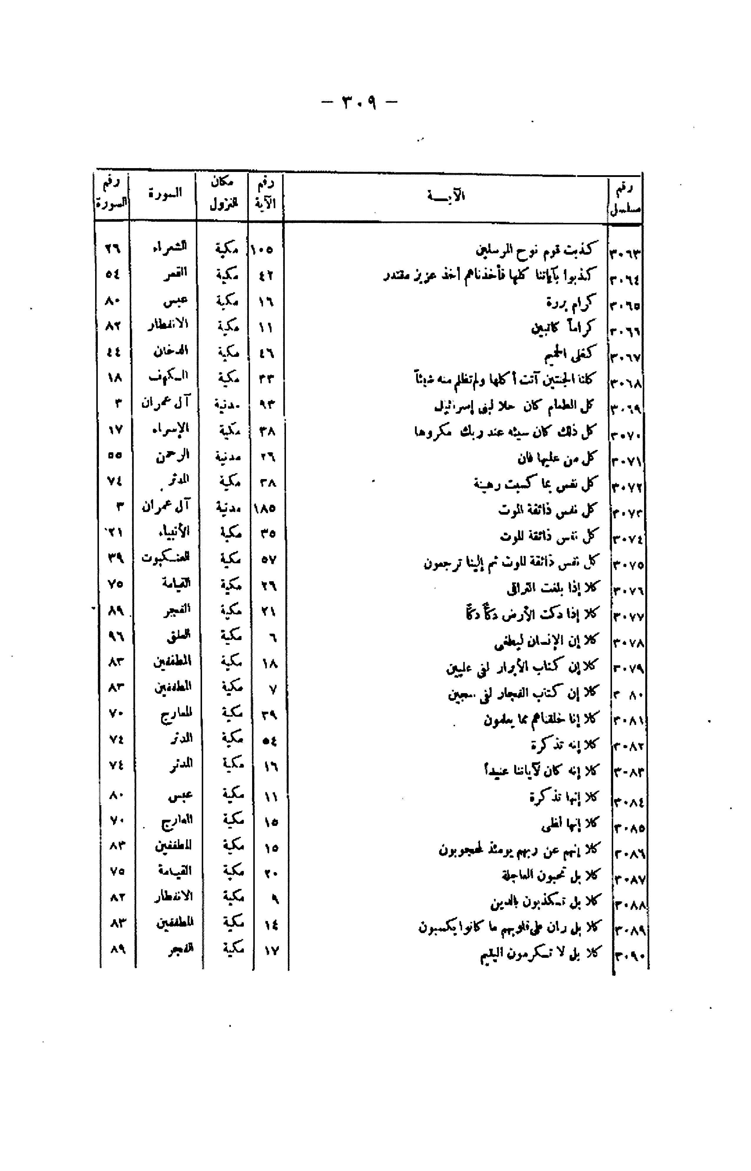 رقم مسلسل/ الآية/ رقم الآية/ مكان النزول/ السورة/ رقم السورة 3063/ كَذَّبَتْ قَوْمُ نُوحٍ الْمُرْسَلِينَ/ 105/ مكية/ الشعراء/ 26 3064/ كَذَّبُوا بِآياتِنا كُلِّها فَأَخَذْناهُمْ أَخْذَ عَزِيزٍ مُقْتَدِرٍ/ 42/ مكية/ القمر/ 54 3065/ كِرامٍ بَرَرَةٍ/ 16/ مكية/ عبس/ 80 3066/ كِراماً كاتِبِينَ/ 11/ مكية/ الانفطار/ 82 3067/ كَغَلْيِ الْحَمِيمِ/ 46/ مكية/ الدخان/ 44 3068/ كِلْتَا الْجَنَّتَيْنِ آتَتْ أُكُلَها وَلَمْ تَظْلِمْ مِنْهُ شَيْئاً/ 33/ مكية/ الكهف/ 18 3069/ كُلُّ الطَّعامِ كانَ حِلًّا لِبَنِي إِسْرائِيلَ/ 93/ مدنية/ آل عمران/ 3 3070/ كُلُّ ذلِكَ كانَ سَيِّئُهُ عِنْدَ رَبِّكَ مَكْرُوهاً/ 38/ مكية/ الإسراء/ 17 3071/ كُلُّ مَنْ عَلَيْها فانٍ/ 26/ مدنية/ الرحمن/ 55 3072/ كُلُّ نَفْسٍ بِما كَسَبَتْ رَهِينَةٌ/ 38/ مكية/ المدثر/ 74 3073/ كُلُّ نَفْسٍ ذائِقَةُ الْمَوْتِ/ 185/ مدنية/ آل عمران/ 3 3074/ كُلُّ نَفْسٍ ذائِقَةُ الْمَوْتِ/ 35/ مكية/ الأنبياء/ 21 3075/ كُلُّ نَفْسٍ ذائِقَةُ الْمَوْتِ ثُمَّ إِلَيْنا تُرْجَعُونَ/ 57/ مكية/ العنكبوت/ 39 3076/ كَلَّا إِذا بَلَغَتِ التَّراقِيَ/ 26/ مكية/ القيامة/ 75 3077/ كَلَّا إِذا دُكَّتِ الْأَرْضُ دَكًّا دَكًّا/ 21/ مكية/ الفجر/ 89 3078/ كَلَّا إِنَّ الْإِنْسانَ لَيَطْغى / 6/ مكية/ العلق/ 96 3079/ كَلَّا إِنَّ كِتابَ الْأَبْرارِ لَفِي عِلِّيِّينَ/ 18/ مكية/ المطففين/ 83 3080/ كَلَّا إِنَّ كِتابَ الفُجَّارِ لَفِي سِجِّينٍ/ 7/ مكية/ المطففين/ 83 3081/ كَلَّا إِنَّا خَلَقْناهُمْ مِمَّا يَعْلَمُونَ/ 39/ مكية/ المعارج/ 70 3082/ كَلَّا إِنَّهُ تَذْكِرَةٌ/ 54/ مكية/ المدثر/ 74 3083/ كَلَّا إِنَّهُ كانَ لِآياتِنا عَنِيداً/ 16/ مكية/ المدثر/ 74 3084/ كَلَّا إِنَّها تَذْكِرَةٌ/ 11/ مكية/ عبس/ 80 3085/ كَلَّا إِنَّها لَظى / 15/ مكية/ المعارج/ 70 3086/ كَلَّا إِنَّهُمْ عَنْ رَبِّهِمْ يَوْمَئِذٍ لَمَحْجُوبُونَ/ 15/ مكية/ المطففين/ 83 3087/ كَلَّا بَلْ تُحِبُّونَ الْعاجِلَةَ/ 20/ مكية/ القيامة/ 75 3088/ كَلَّا بَلْ تُكَذِّبُونَ بِالدِّينِ/ 9/ مكية/ الانفطار/ 82 3089/ كَلَّا بَلْ رانَ عَلى قُلُوبِهِمْ ما كانُوا يَكْسِبُونَ/ 14/ مكية/ المطففين/ 83 3090/ كَلَّا بَلْ لا تُكْرِمُونَ الْيَتِيمَ/ 17/ مكية/ الفجر/ 89