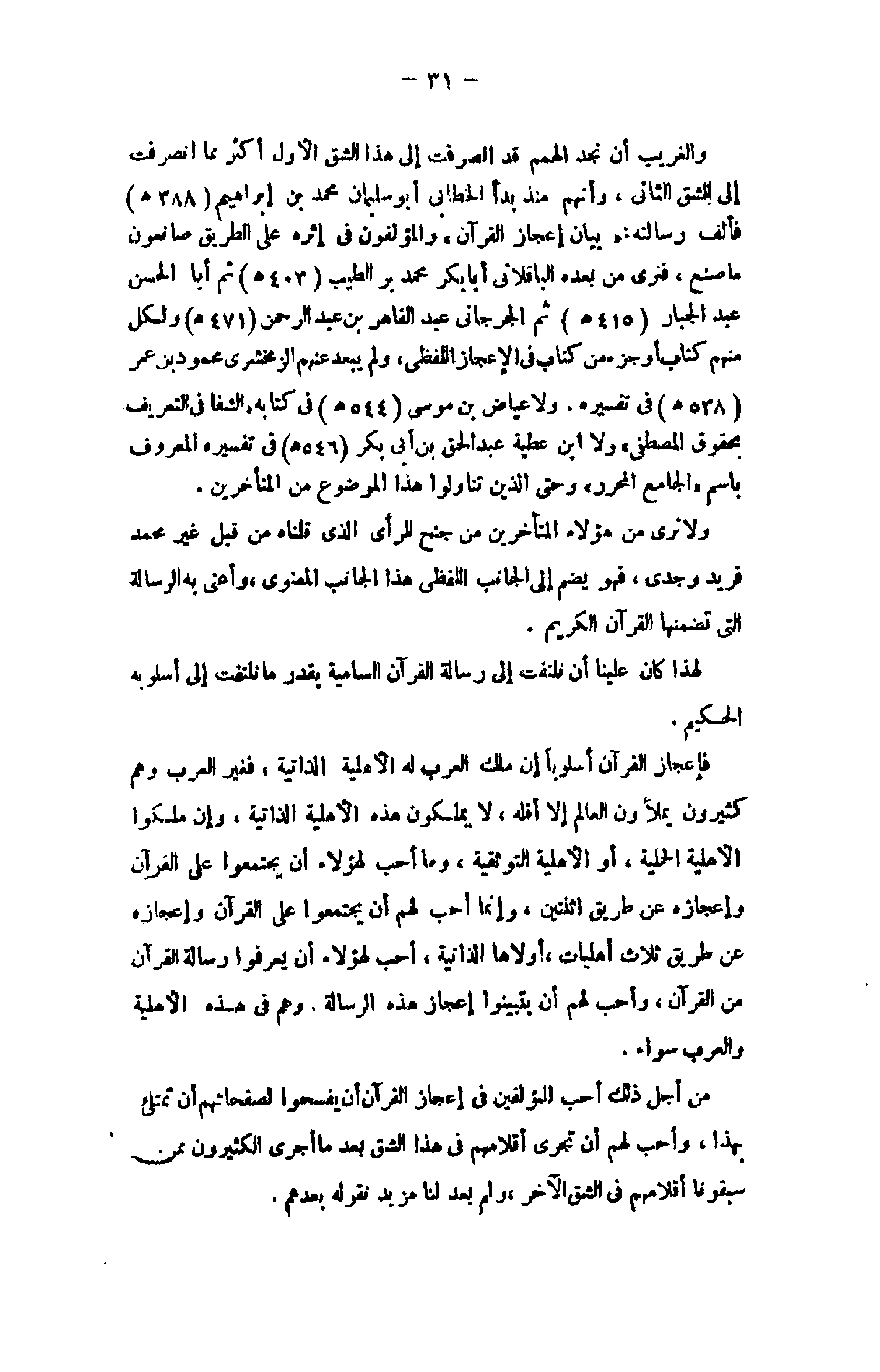 والغريب أن نجد الهمم قد الصرفت إلى هذا الشق الأول أكثر مما انصرفت إلى الشق الثانى، وأنهم منذ بدأ الخطابى أبو سليمان محمد بن إبراهيم (388 هـ) فألف رسالته: «بيان إعجاز القرآن» والمؤلفون فى إثره على الطريق صانعون ما صنع، فنرى من بعده الباقلانى أبابكر محمد بر الطيب (403 هـ) ثم أبا الحسن عبد الجبار (415 هـ) ثم الجرجانى عبد القاهر بن عبد الرحمن (471 هـ) ولكل منهم كتاب أو جزء من كتاب فى الإعجاز اللفظى، ولم يبعد عنهم الزمخشرى محمود بن عمر (538 هـ) فى تفسيره. ولا عياض بن موسى (544 هـ) فى كتابه «الشفا فى التعريف بحقوق المصطفى» ولا ابن عطية عبد الحق بن أبى بكر (546 هـ) فى تفسيره المعروف باسم «الجامع المحرر» وحتى الذين تناولوا هذا الموضوع من المتأخرين.