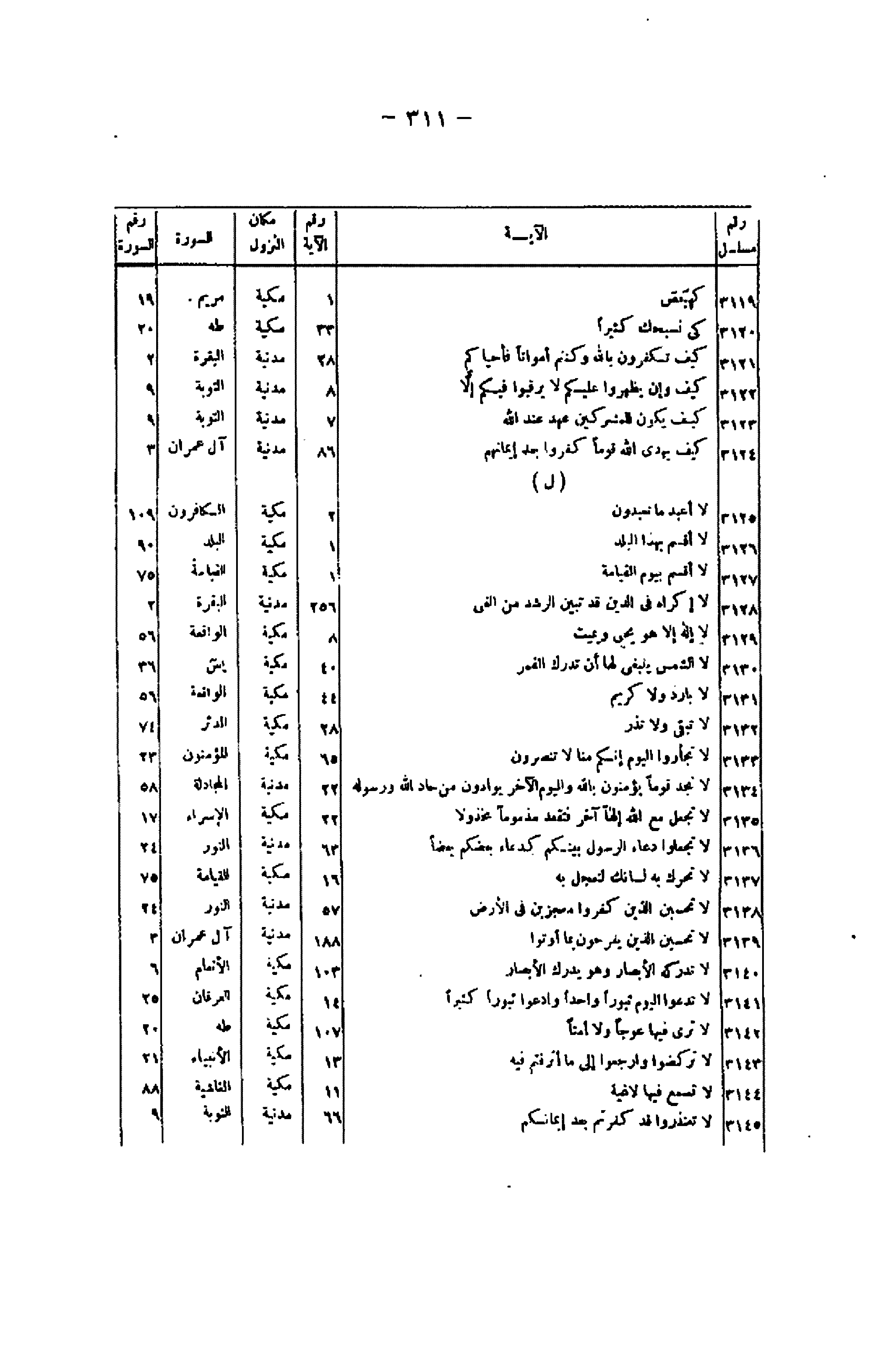 رقم مسلسل/ الآية/ رقم الآية/ مكان النزول/ السورة/ رقم السورة 3119/ كهيعص/ 1/ مكية/ مريم/ 19 3120/ كَيْ نُسَبِّحَكَ كَثِيراً/ 33/ مكية/ طه/ 20 3121/ كَيْفَ تَكْفُرُونَ بِاللَّهِ وَكُنْتُمْ أَمْواتاً فَأَحْياكُمْ/ 28/ مدنية/ البقرة/ 2 3122/ كَيْفَ وَإِنْ يَظْهَرُوا عَلَيْكُمْ لا يَرْقُبُوا فِيكُمْ إِلًّا/ 8/ مدنية/ التوبة/ 9 3123/ كَيْفَ يَكُونُ لِلْمُشْرِكِينَ عَهْدٌ عِنْدَ اللَّهِ/ 7/ مدنية/ التوبة/ 9 3124/ كَيْفَ يَهْدِي اللَّهُ قَوْماً كَفَرُوا بَعْدَ إِيمانِهِمْ/ 86/ مدنية/ آل عمران/ 3 (ل) 3125/ لا أَعْبُدُ ما تَعْبُدُونَ/ 2/ مكية/ الكافرون/ 109 3126/ لا أُقْسِمُ بِهذَا الْبَلَدِ/ 1/ مكية/ البلد/ 90 3127/ لا أُقْسِمُ بِيَوْمِ الْقِيامَةِ/ 1/ مكية/ القيامة/ 75 3128/ لا إِكْراهَ فِي الدِّينِ قَدْ تَبَيَّنَ الرُّشْدُ مِنَ الْغَيِّ/ 256/ مدنية/ البقرة/ 2 3129/ لا إِلهَ إِلَّا هُوَ يُحْيِي وَيُمِيتُ/ 8/ مكية/ الواقعة/ 56 3130/ لَا الشَّمْسُ يَنْبَغِي لَها أَنْ تُدْرِكَ الْقَمَرَ/ 40/ مكية/ يس/ 36 3131/ لا بارِدٍ وَلا كَرِيمٍ/ 44/ مكية/ الواقعة/ 56 3132/ لا تُبْقِي وَلا تَذَرُ/ 28/ مكية/ المدثر/ 74 3133/ لا تَجْأَرُوا الْيَوْمَ إِنَّكُمْ مِنَّا لا تُنْصَرُونَ/ 65/ مكية/ المؤمنون/ 23 3134/ لا تَجِدُ قَوْماً يُؤْمِنُونَ بِاللَّهِ وَالْيَوْمِ الْآخِرِ يُوادُّونَ مَنْ حَادَّ اللَّهَ وَرَسُولَهُ/ 22/ مدنية/ المجادلة/ 58 3135/ لا تَجْعَلْ مَعَ اللَّهِ إِلهاً آخَرَ فَتَقْعُدَ مَذْمُوماً مَخْذُولًا/ 22/ مكية/ الإسراء/ 17 3136/ لا تَجْعَلُوا دُعاءَ الرَّسُولِ بَيْنَكُمْ كَدُعاءِ بَعْضِكُمْ بَعْضاً/ 63/ مدنية/ النور/ 24 3137/ لا تُحَرِّكْ بِهِ لِسانَكَ لِتَعْجَلَ بِهِ