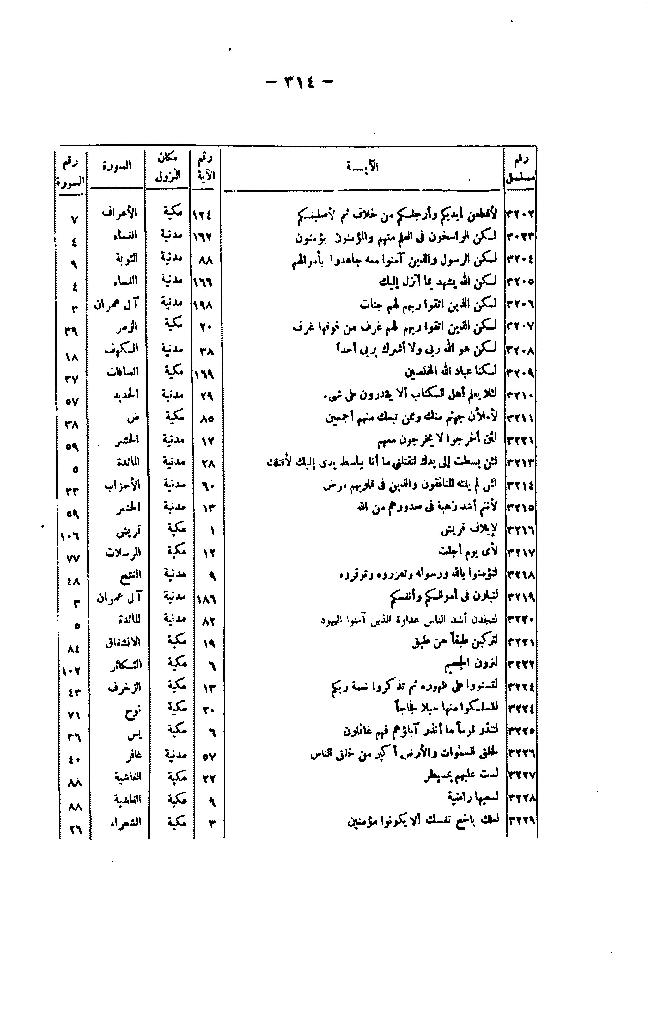 رقم مسلسل/ الآية/ رقم الآية/ مكان النزول/ السورة/ رقم السورة 3202/ لَأُقَطِّعَنَّ أَيْدِيَكُمْ وَأَرْجُلَكُمْ مِنْ خِلافٍ ثُمَّ لَأُصَلِّبَنَّكُمْ/ 124/ مكية/ الأعراف/ 7 3203/ لكِنِ الرَّاسِخُونَ فِي الْعِلْمِ مِنْهُمْ وَالْمُؤْمِنُونَ يُؤْمِنُونَ/ 162/ مدنية/ النساء/ 4 3204/ لكِنِ الرَّسُولُ وَالَّذِينَ آمَنُوا مَعَهُ جاهَدُوا بِأَمْوالِهِمْ/ 88/ مدنية/ التوبة/ 9 3205/ لكِنِ اللَّهُ يَشْهَدُ بِما أَنْزَلَ إِلَيْكَ/ 166/ مدنية/ النساء/ 4 3206/ لكِنِ الَّذِينَ اتَّقَوْا رَبَّهُمْ لَهُمْ جَنَّاتٌ/ 198/ مدنية/ آل عمران/ 3 3207/ لكِنِ الَّذِينَ اتَّقَوْا رَبَّهُمْ لَهُمْ غُرَفٌ مِنْ فَوْقِها غُرَفٌ/ 20/ مكية/ الزمر/ 39 3208/ لكِنَّا هُوَ اللَّهُ رَبِّي وَلا أُشْرِكُ بِرَبِّي أَحَداً/ 38/ مدنية/ الكهف/ 18 3209/ لَكُنَّا عِبادَ اللَّهِ الْمُخْلَصِينَ/ 169/ مكية/ الصافات/ 37 3210/ لِئَلَّا يَعْلَمَ أَهْلُ الْكِتابِ أَلَّا يَقْدِرُونَ عَلى شَيْءٍ/ 29/ مدنية/ الحديد/ 57 3211/ لَأَمْلَأَنَّ جَهَنَّمَ مِنْكَ وَمِمَّنْ تَبِعَكَ مِنْهُمْ أَجْمَعِينَ/ 85/ مكية/ ص/ 38 3212/ لَئِنْ أُخْرِجُوا لا يَخْرُجُونَ مَعَهُمْ/ 12/ مدنية/ الحشر/ 59 3213/ لَئِنْ بَسَطْتَ إِلَيَّ يَدَكَ لِتَقْتُلَنِي ما أَنَا بِباسِطٍ يَدِيَ إِلَيْكَ لِأَقْتُلَكَ/ 28/ مدنية/ المائدة/ 5 3214/ لَئِنْ لَمْ يَنْتَهِ الْمُنافِقُونَ وَالَّذِينَ فِي قُلُوبِهِمْ مَرَضٌ/ 60/ مدنية/ الأحزاب/ 33 3215/ لَأَنْتُمْ أَشَدُّ رَهْبَةً فِي صُدُورِهِمْ مِنَ اللَّهِ/ 13/ مدنية/ الحشر/ 59 3216/ لِإِيلافِ قُرَيْشٍ/ 1/ مكية/ قريش/ 106 3217/ لِأَيِّ يَوْمٍ أُجِّلَتْ/ 12/ مكية/ المرسلات/ 77 3218/ لِتُؤْمِنُوا بِاللَّهِ وَرَسُولِهِ وَتُعَزِّرُوهُ وَتُوَقِّرُوهُ/ 9/ مدنية/ الفتح/ 48 3219/ لَتُبْلَوُنَّ فِي أَمْوالِكُمْ وَأَنْفُسِكُمْ/ 186/ مدنية/ آل عمران/ 3 3220/ لَتَجِدَنَّ أَشَدَّ النَّاسِ عَداوَةً لِلَّذِينَ آمَنُوا الْيَهُودَ/ 82/ مدنية/ المائدة/ 5 3221/ لَتَرْكَبُنَّ طَبَقاً عَنْ طَبَقٍ/ 19/ مكية/ الانشقاق/ 84 3222/ لَتَرَوُنَّ الْجَحِيمَ/ 6/ مكية/ التكاثر/ 102 3223/ لِتَسْتَوُوا عَلى ظُهُورِهِ ثُمَّ تَذْكُرُوا نِعْمَةَ رَبِّكُمْ/ 13/ مكية