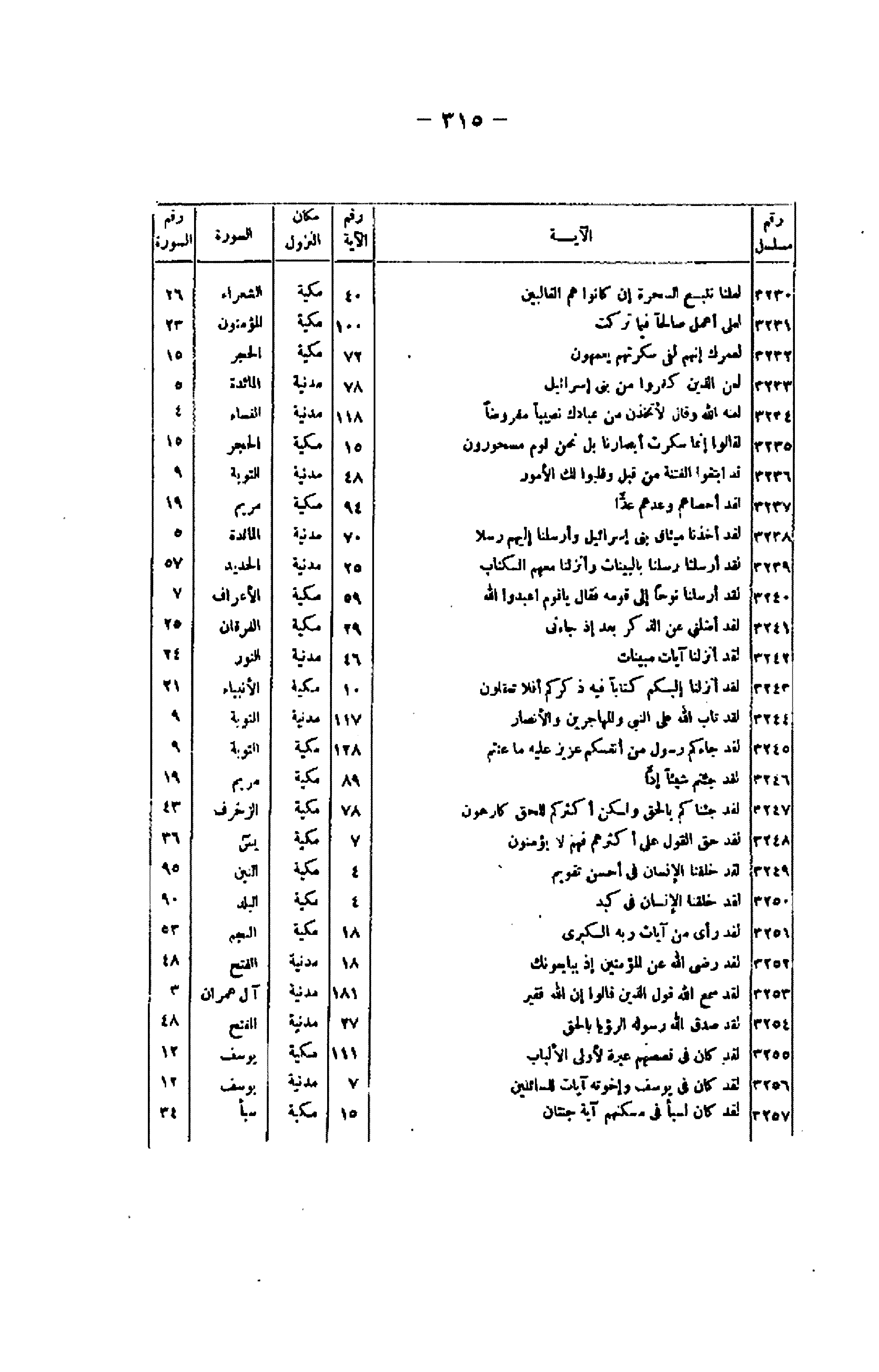رقم مسلسل/ الآية/ رقم الآية/ مكان النزول/ السورة/ رقم السورة 3230/ لَعَلَّنا نَتَّبِعُ السَّحَرَةَ إِنْ كانُوا هُمُ الْغالِبِينَ/ 40/ مكية/ الشعراء/ 26 3231/ لَعَلِّي أَعْمَلُ صالِحاً فِيما تَرَكْتُ/ 100/ مكية/ المؤمنون/ 23 3232/ لَعَمْرُكَ إِنَّهُمْ لَفِي سَكْرَتِهِمْ يَعْمَهُونَ/ 72/ مكية/ الحجر/ 15 3233/ لُعِنَ الَّذِينَ كَفَرُوا مِنْ بَنِي إِسْرائِيلَ/ 78/ مدنية/ المائدة/ 5 3234/ لَعَنَهُ اللَّهُ وَقالَ لَأَتَّخِذَنَّ مِنْ عِبادِكَ نَصِيباً مَفْرُوضاً/ 118/ مدنية/ النساء/ 4 3235/ لَقالُوا إِنَّما سُكِّرَتْ أَبْصارُنا بَلْ نَحْنُ قَوْمٌ مَسْحُورُونَ/ 15/ مكية/ الحجر/ 15 3236/ لَقَدِ ابْتَغَوُا الْفِتْنَةَ مِنْ قَبْلُ وَقَلَّبُوا لَكَ الْأُمُورَ/ 48/ مدنية/ التوبة/ 9 3237/ لَقَدْ أَحْصاهُمْ وَعَدَّهُمْ عَدًّا/ 94/ مكية/ مريم/ 19 3238/ لَقَدْ أَخَذْنا مِيثاقَ بَنِي إِسْرائِيلَ وَأَرْسَلْنا إِلَيْهِمْ رُسُلًا/ 70/ مدنية/ المائدة/ 5 3239/ لَقَدْ أَرْسَلْنا رُسُلَنا بِالْبَيِّناتِ وَأَنْزَلْنا مَعَهُمُ الْكِتابَ/ 25/ مدنية/ الحديد/ 57 3240/ لَقَدْ أَرْسَلْنا نُوحاً إِلى قَوْمِهِ فَقالَ يا قَوْمِ اعْبُدُوا اللَّهَ/ 59/ مكية/ الأعراف/ 7 3241/ لَقَدْ أَضَلَّنِي عَنِ الذِّكْرِ بَعْدَ إِذْ جاءَنِي/ 29/ مكية/ الفرقان/ 25 3242/ لَقَدْ أَنْزَلْنا آياتٍ مُبَيِّناتٍ/ 46/ مدنية/ النور/ 24 3243/ لَقَدْ أَنْزَلْنا إِلَيْكُمْ كِتاباً فِيهِ ذِكْرُكُمْ أَفَلا تَعْقِلُونَ/ 10/ مكية/ الأنبياء/ 21 3244/ لَقَدْ تابَ اللَّهُ عَلَى النَّبِيِّ وَالْمُهاجِرِينَ وَالْأَنْصارِ/ 117/ مدنية/ التوبة/ 9 3245/ لَقَدْ جاءَكُمْ رَسُولٌ مِنْ أَنْفُسِكُمْ عَزِيزٌ عَلَيْهِ ما عَنِتُّمْ/ 128/ مكية/ التوبة/ 9 3246/ لَقَدْ جِئْتُمْ شَيْئاً إِدًّا/ 89/ مكية/ مريم/ 19 3247/ لَقَدْ جِئْناكُمْ بِالْحَقِّ وَلكِنَّ أَكْثَرَكُمْ لِلْحَقِّ كارِهُونَ/ 78/ مكية/ الزخرف/ 43 3248/ لَقَدْ حَقَّ الْقَوْلُ عَلى أَكْثَرِهِمْ فَهُمْ لا يُؤْمِنُونَ/ 7/ مكية/ يس/ 36 3249/ لَقَدْ خَلَقْنَا الْإِنْسانَ فِي أَحْسَنِ تَقْوِيمٍ/ 4/ مكية/ النين/ 95 3250/ لَقَدْ خَلَقْنَا الْإِنْسانَ فِي كَبَدٍ/ 4/ مكية/ البلد/ 90 3251/ لَقَدْ رَأى مِنْ آياتِ رَبِّهِ الْكُبْرى / 18/ مكية/ النجم/ 53 3252/ لَقَدْ رَضِيَ اللَّهُ عَنِ الْمُؤْمِنِينَ إِذْ يُبايِعُونَكَ/ 18/ مدنية/ الفتح/ 48 3253/ لَقَدْ سَمِعَ اللَّهُ قَوْلَ الَّذِينَ قالُوا إِنَّ اللَّهَ فَقِيرٌ/ 181/ مدنية/ آل عمران/ 3 3254/ لَقَدْ صَدَقَ اللَّهُ رَسُولَهُ الرُّؤْيا بِالْحَقِّ/ 27/ مدنية/ الفتح/ 48 3255/ لَقَدْ كانَ فِي قَصَصِهِمْ عِبْرَةٌ لِأُولِي الْأَلْبابِ/ 111/ مكية/ يوسف/ 12 3256/ لَقَدْ كانَ فِي يُوسُفَ وَإِخْوَتِهِ آياتٌ لِلسَّائِلِينَ/ 7/ مدنية/ يوسف/ 12 3257/ لَقَدْ كانَ لِسَبَإٍ فِي مَسْكَنِهِمْ آيَةٌ جَنَّتانِ/ 15/ مكية/ سبأ/ 34