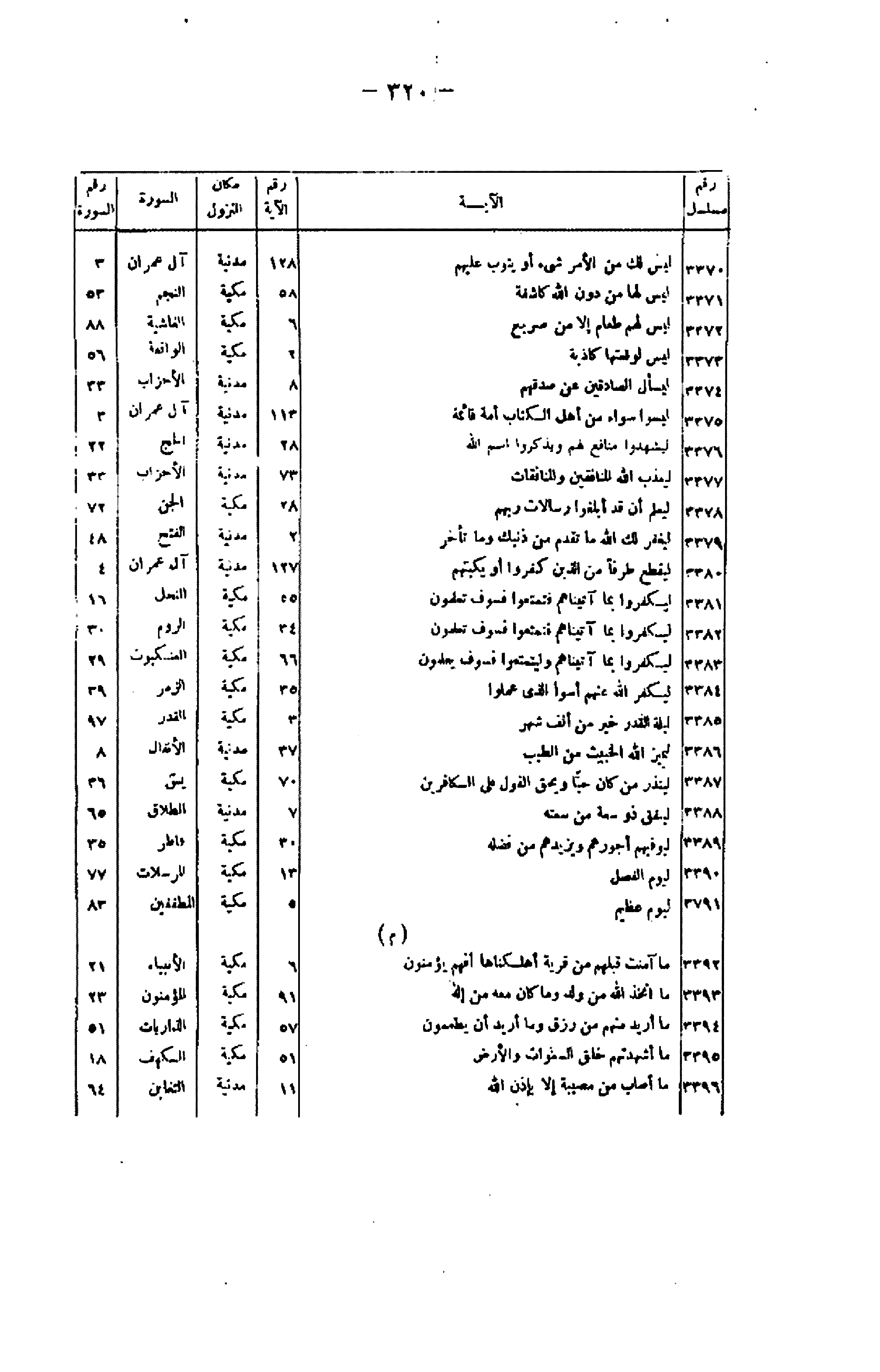 الآية/ مكان النزول/ السورة/ رقم السورة 3370/ لَيْسَ لَكَ مِنَ الْأَمْرِ شَيْءٌ أَوْ يَتُوبَ عَلَيْهِمْ/ 128/ مدنية/ آل عمران/ 3 3371/ لَيْسَ لَها مِنْ دُونِ اللَّهِ كاشِفَةٌ/ 58/ مكية/ النجم/ 53 3372/ لَيْسَ لَهُمْ طَعامٌ إِلَّا مِنْ ضَرِيعٍ/ 6/ مكية/ الغاشية/ 88 3373/ لَيْسَ لِوَقْعَتِها كاذِبَةٌ/ 2/ مكية/ الواقعة/ 56 3374/ لِيَسْئَلَ الصَّادِقِينَ عَنْ صِدْقِهِمْ/ 8/ مدنية/ الأحزاب/ 33 3375/ لَيْسُوا سَواءً مِنْ أَهْلِ الْكِتابِ أُمَّةٌ قائِمَةٌ/ 113/ مدنية/ آل عمران/ 3 3376/ لِيَشْهَدُوا مَنافِعَ لَهُمْ وَيَذْكُرُوا اسْمَ اللَّهِ/ 28/ مدنية/ الحج/ 22 3377/ لِيُعَذِّبَ اللَّهُ الْمُنافِقِينَ وَالْمُنافِقاتِ/ 73/ مدنية/ الأحزاب/ 33 3378/ لِيَعْلَمَ أَنْ قَدْ أَبْلَغُوا رِسالاتِ رَبِّهِمْ/ 28/ مكية/ الجن/ 72 3379/ لِيَغْفِرَ لَكَ اللَّهُ ما تَقَدَّمَ مِنْ ذَنْبِكَ وَما تَأَخَّرَ/ 2/ مدنية/ الفتح/ 48 3380/ لِيَقْطَعَ طَرَفاً مِنَ الَّذِينَ كَفَرُوا أَوْ يَكْبِتَهُمْ/ 127/ مدنية/ آل عمران/ 4 3381/ لِيَكْفُرُوا بِما آتَيْناهُمْ فَتَمَتَّعُوا فَسَوْفَ تَعْلَمُونَ/ 55/ مكية/ النحل/ 16 3382/ لِيَكْفُرُوا بِما آتَيْناهُمْ فَتَمَتَّعُوا فَسَوْفَ تَعْلَمُونَ/ 34/ مكية/ الروم/ 30 3383/ لِيَكْفُرُوا بِما آتَيْناهُمْ وَلِيَتَمَتَّعُوا فَسَوْفَ يَعْلَمُونَ/ 66/ مكية/ العنكبوت/ 29 3384/ لِيُكَفِّرَ اللَّهُ عَنْهُمْ أَسْوَأَ الَّذِي عَمِلُوا/ 35/ مكية/ الزمر/ 39 3385/ لَيْلَةُ الْقَدْرِ خَيْرٌ مِنْ أَلْفِ شَهْرٍ/ 3/ مكية/ القدر/ 97 3386/ لِيَمِيزَ اللَّهُ الْخَبِيثَ مِنَ الطَّيِّبِ/ 37/ مدنية/ الأنفال/ 8 3387/ لِيُنْذِرَ مَنْ كانَ حَيًّا وَيَحِقَّ الْقَوْلُ عَلَى الْكافِرِينَ/ 70/ مكية/ يس/ 36 3388/ لِيُنْفِقْ ذُو سَعَةٍ مِنْ سَعَتِهِ/ 7/ مدنية/ الطلاق/ 65 3389/ لِيُوَفِّيَهُمْ أُجُورَهُمْ وَيَزِيدَهُمْ مِنْ فَضْلِهِ/ 30/ مكية/ فاطر/ 35 3390/ لِيَوْمِ الْفَصْلِ/ 13/ مكية/ المرسلات/ 77 3391/ لِيَوْمٍ عَظِيمٍ/ 5/ مكية/ المطففين/ 83 (م) 3392/ ما آمَنَتْ قَبْلَهُمْ مِنْ قَرْيَةٍ أَهْلَكْناها أَفَهُمْ يُؤْمِنُونَ/ 6/ مكية/ الأنبياء/ 21 3393/ مَا اتَّخَذَ اللَّهُ مِنْ وَلَدٍ وَما كانَ مَعَهُ مِنْ إِلهٍ/ 91/ مكية/ المؤمنون/ 23 3394/ ما أُرِيدُ مِنْهُمْ مِنْ رِزْقٍ وَما أُرِيدُ أَنْ يُطْعِمُونِ/ 57/ مكية/ الذاريات/ 51 3395/ ما أَشْهَدْتُهُمْ خَلْقَ السَّماواتِ وَالْأَرْضِ/ 51/ مكية/ الكهف/ 18 3396/ ما أَصابَ مِنْ مُصِيبَةٍ إِلَّا بِإِذْنِ اللَّهِ/ 11/ مدنية/ التغابن/ 64