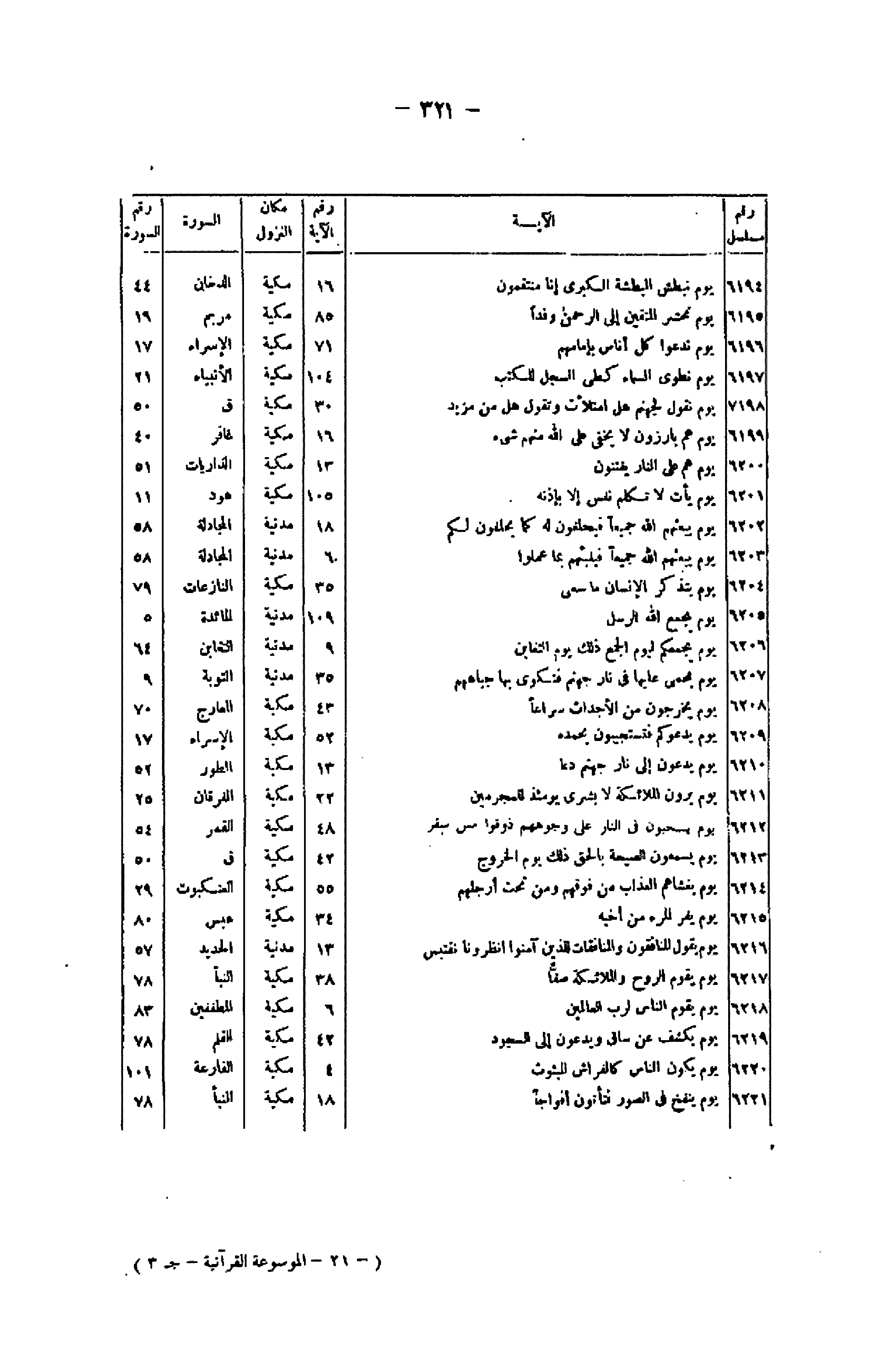 رقم مسلسل/ الآية/ رقم الآية/ مكان النزول/ السورة/ رقم السورة 6194/ يَوْمَ نَبْطِشُ الْبَطْشَةَ الْكُبْرى إِنَّا مُنْتَقِمُونَ/ 16/ مكية/ الدخان/ 44 6195/ يَوْمَ نَحْشُرُ الْمُتَّقِينَ إِلَى الرَّحْمنِ وَفْداً/ 85/ مكية/ مريم/ 19 6196/ يَوْمَ نَدْعُوا كُلَّ أُناسٍ بِإِمامِهِمْ/ 71/ مكية/ الإسراء/ 17 6197/ يَوْمَ نَطْوِي السَّماءَ كَطَيِّ السِّجِلِّ لِلْكُتُبِ/ 104/ مكية/ الأنبياء/ 21 6198/ يَوْمَ نَقُولُ لِجَهَنَّمَ هَلِ امْتَلَأْتِ وَتَقُولُ هَلْ مِنْ مَزِيدٍ/ 30/ مكية/ ق/ 50 6199/ يَوْمَ هُمْ بارِزُونَ لا يَخْفى عَلَى اللَّهِ مِنْهُمْ شَيْءٌ/ 16/ مكية/ غافر/ 40 6200/ يَوْمَ هُمْ عَلَى النَّارِ يُفْتَنُونَ/ 13/ مكية/ الذاريات/ 51 6201/ يَوْمَ يَأْتِ لا تَكَلَّمُ نَفْسٌ إِلَّا بِإِذْنِهِ/ 105/ مكية/ هود/ 11 6202/ يَوْمَ يَبْعَثُهُمُ اللَّهُ جَمِيعاً فَيَحْلِفُونَ لَهُ كَما يَحْلِفُونَ لَكُمْ/ 18/ مدنية/ المجادلة/ 58 6203/ يَوْمَ يَبْعَثُهُمُ اللَّهُ جَمِيعاً فَيُنَبِّئُهُمْ بِما عَمِلُوا/ 60/ مدنية/ المجادلة/ 58 6204/ يَوْمَ يَتَذَكَّرُ الْإِنْسانُ ما سَعى / 35/ مكية/ النازعات/ 79 6205/ يَوْمَ يَجْمَعُ اللَّهُ الرُّسُلَ/ 109/ مدنية/ المائدة/ 5 6206/ يَوْمَ يَجْمَعُكُمْ لِيَوْمِ الْجَمْعِ ذلِكَ يَوْمُ التَّغابُنِ/ 9/ مدنية/ التغابن/ 64 6207/ يَوْمَ يُحْمى عَلَيْها فِي نارِ جَهَنَّمَ فَتُكْوى بِها جِباهُهُمْ/ 35/ مدنية/ التوبة/ 9 6208/ يَوْمَ يَخْرُجُونَ مِنَ الْأَجْداثِ سِراعاً/ 43/ مكية/ المعارج/ 70 6209/ يَوْمَ يَدْعُوكُمْ فَتَسْتَجِيبُونَ بِحَمْدِهِ/ 52/ مكية/ الإسراء/ 17 6210/ يَوْمَ يُدَعُّونَ إِلى نارِ جَهَنَّمَ دَعًّا/ 13/ مكية/ الطور/ 52 6211/ يَوْمَ يَرَوْنَ الْمَلائِكَةَ لا بُشْرى يَوْمَئِذٍ لِلْمُجْرِمِينَ/ 22/ مكية/ الفرقان/ 25 6212/ يَوْمَ يُسْحَبُونَ فِي النَّارِ عَلى وُجُوهِهِمْ ذُوقُوا مَسَّ سَقَرَ/ 48/ مكية/ القمر/ 54 6213/ يَوْمَ يَسْمَعُونَ الصَّيْحَةَ بِالْحَقِّ ذلِكَ يَوْمُ الْخُرُوجِ/ 42/ مكية/ ق/ 50 6214/ يَوْمَ يَغْشاهُمُ الْعَذابُ مِنْ فَوْقِهِمْ وَمِنْ تَحْتِ أَرْجُلِهِمْ/ 55/ مكية/ العنكبوت/ 29 6215/ يَوْمَ يَفِرُّ الْمَرْءُ مِنْ أَخِيهِ/ 34/ مكية/ عبس/ 80 6216/ يَوْمَ يَقُولُ الْمُنافِقُونَ وَالْمُنافِقاتُ لِلَّذِينَ آمَنُوا انْظُرُونا نَقْتَبِسْ/ 13/ مدنية/ الحديد/ 57 6217/ يَوْمَ يَقُومُ الرُّوحُ وَالْمَلائِكَةُ صَفًّا/ 38/ مكية/ النبأ/ 78 6218/ يَوْمَ يَقُومُ النَّاسُ لِرَبِّ الْعالَمِينَ/ 6/ مكية/ المطففين/ 83 6219/ يَوْمَ يُكْشَفُ عَنْ ساقٍ وَيُدْعَوْنَ إِلَى السُّجُودِ/ 42/ مكية/ القلم/ 78 6220/ يَوْمَ يَكُونُ النَّاسُ كَالْفَراشِ الْمَبْثُوثِ/ 4/ مكية/ الفارعة/ 101 6221/ يَوْمَ يُنْفَخُ فِي الصُّورِ فَتَأْتُونَ أَفْواجاً/ 18/ مكية/ النبأ/ 78 (- 21- الموسوعة القرآنية/- ج 3)