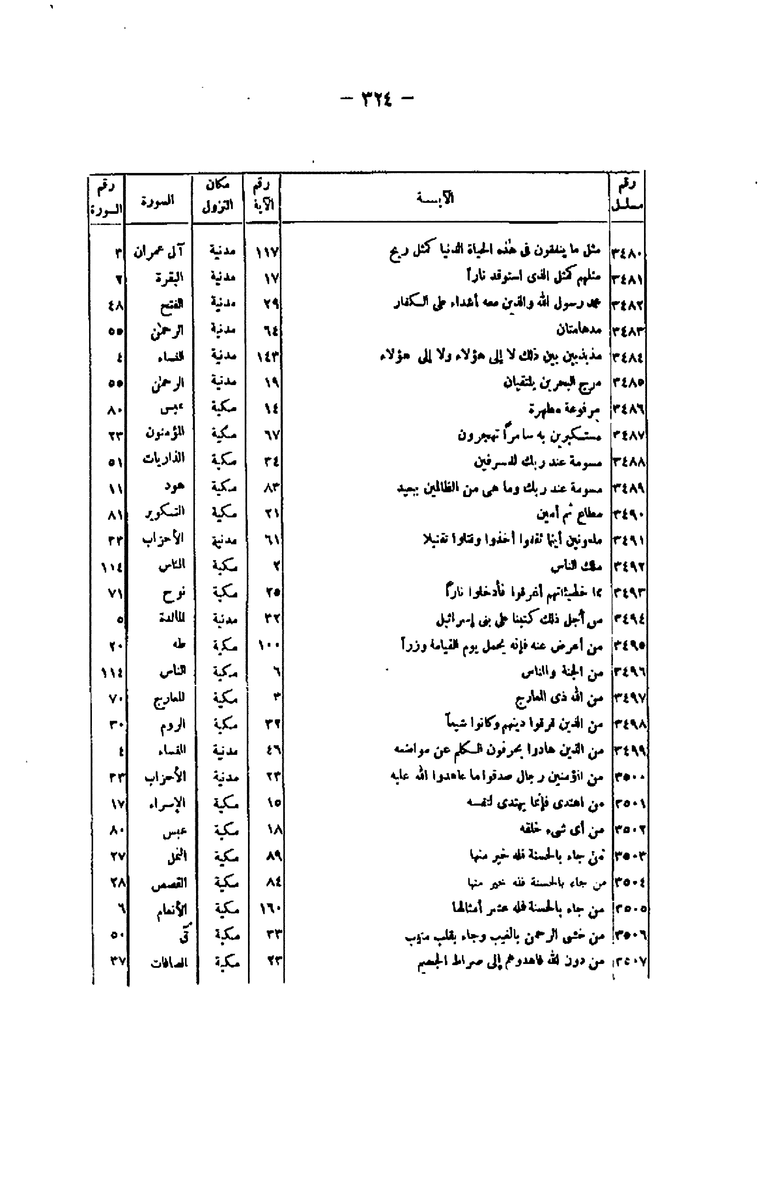 / 117/ مدنية/ آل عمران/ 3 3481/ مَثَلُهُمْ كَمَثَلِ الَّذِي اسْتَوْقَدَ ناراً/ 17/ مدنية/ البقرة/ 2 3482/ مُحَمَّدٌ رَسُولُ اللَّهِ وَالَّذِينَ مَعَهُ أَشِدَّاءُ عَلَى الْكُفَّارِ/ 29/ مدنية/ الفتح/ 48 3483/ مُدْهامَّتانِ/ 64/ مدنية/ الرحمن/ 55 3484/ مُذَبْذَبِينَ بَيْنَ ذلِكَ لا إِلى هؤُلاءِ وَلا إِلى هؤُلاءِ/ 143/ مدنية/ النساء/ 4 3485/ مَرَجَ الْبَحْرَيْنِ يَلْتَقِيانِ/ 19/ مدنية/ الرحمن/ 55 3486/ مَرْفُوعَةٍ مُطَهَّرَةٍ/ 14/ مكية/ عبس/ 80 3487/ مُسْتَكْبِرِينَ بِهِ سامِراً تَهْجُرُونَ/ 67/ مكية/ المؤمنون/ 23 3488/ مُسَوَّمَةً عِنْدَ رَبِّكَ لِلْمُسْرِفِينَ/ 34/ مكية/ الذاريات/ 51 3489/ مُسَوَّمَةً عِنْدَ رَبِّكَ وَما هِيَ مِنَ الظَّالِمِينَ بِبَعِيدٍ/ 83/ مكية/ هود/ 11 3490/ مُطاعٍ ثَمَّ أَمِينٍ/ 21/ مكية/ التكوير/ 81 3491/ مَلْعُونِينَ أَيْنَما ثُقِفُوا أُخِذُوا وَقُتِّلُوا تَقْتِيلًا/ 61/ مدنية/ الأحزاب/ 33 3492/ مَلِكِ النَّاسِ/ 2/ مكية/ الناس/ 114 3493/ مِمَّا خَطِيئاتِهِمْ أُغْرِقُوا فَأُدْخِلُوا ناراً/ 25/ مكية/ نوح/ 71 3494/ مِنْ أَجْلِ ذلِكَ كَتَبْنا عَلى بَنِي إِسْرائِيلَ/ 32/ مدنية/ المائدة/ 5 3495/ مَنْ أَعْرَضَ عَنْهُ فَإِنَّهُ يَحْمِلُ يَوْمَ الْقِيامَةِ وِزْراً/ 100/ مكية/ طه/ 20 3496/ مِنَ الْجِنَّةِ وَالنَّاسِ/ 6/ مكية/ الناس/ 114 3497/ مِنَ اللَّهِ ذِي الْمَعارِجِ/ 3/ مكية/ المعارج/ 70 3498/ مِنَ الَّذِينَ فَرَّقُوا دِينَهُمْ وَكانُوا شِيَعاً/ 32/ مكية/ الروم/ 30 3499/ مِنَ الَّذِينَ هادُوا يُحَرِّفُونَ الْكَلِمَ عَنْ مَواضِعِهِ/ 46/ مدنية/ النساء/ 4 3500/ مِنَ الْمُؤْمِنِينَ رِجالٌ صَدَقُوا ما عاهَدُوا اللَّهَ عَلَيْهِ/ 23/ مدنية/ الأحزاب/ 23 3501/ مَنِ اهْتَدى فَإِنَّما يَهْتَدِي لِنَفْسِهِ/ 15/ مكية/ الإسراء/ 17 3502/ مِنْ أَيِّ شَيْءٍ خَلَقَهُ/ 18/ مكية/ عبس/ 80 3503/ مَنْ جاءَ بِالْحَسَنَةِ فَلَهُ خَيْرٌ مِنْها/ 89/ مكية/ النمل/ 27 3504/ مَنْ جاءَ بِالْحَسَنَةِ فَلَهُ خَيْرٌ مِنْها/ 84/ مكية/ القصص/ 28 3505/ مَنْ جاءَ بِالْحَسَنَةِ فَلَهُ عَشْرُ أَمْثالِها/ 160/ مكية/ الأنعام/ 6 3506/ مَنْ خَشِيَ الرَّحْمنَ بِالْغَيْبِ وَجاءَ بِقَلْبٍ مُنِيبٍ/ 33/ مكية/ ق/ 50 3507/ مِنْ دُونِ اللَّهِ فَاهْدُوهُمْ إِلى صِراطِ الْجَحِيمِ/ 23/ مكية/ الصافات/ 37