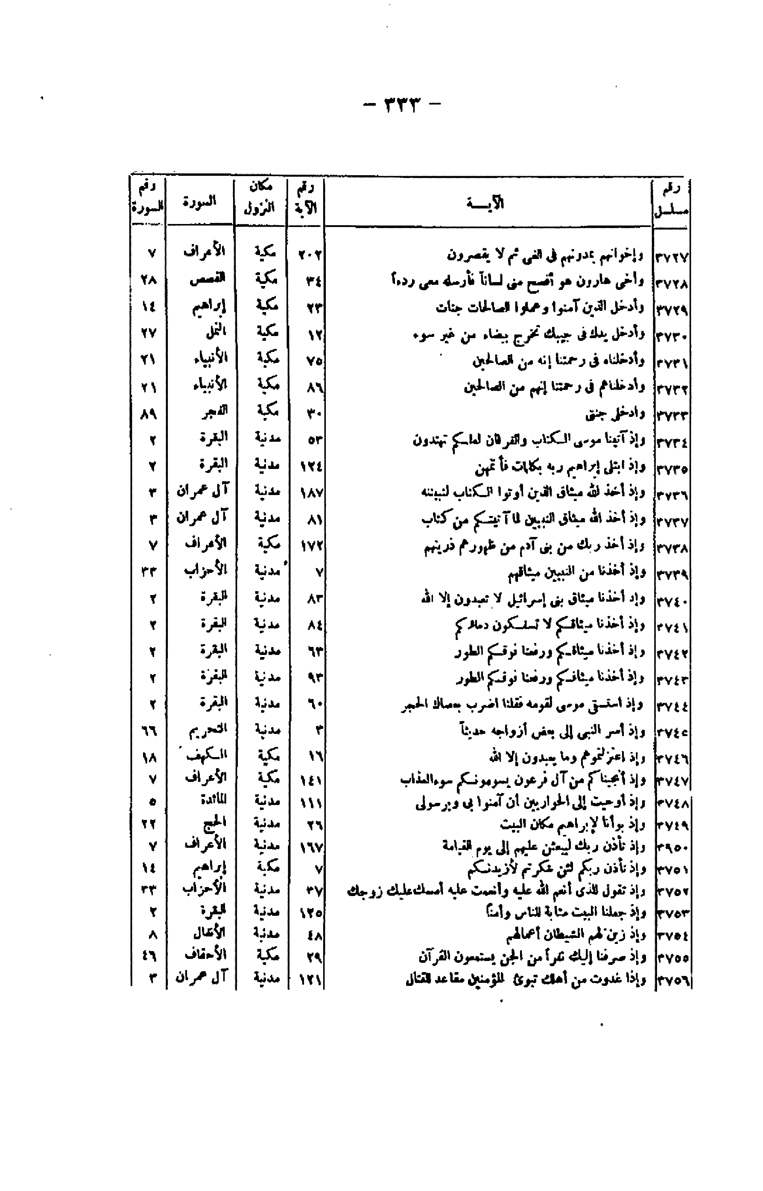 رقم مسلسل/ الآية/ رقم الآية/ مكان النزول/ السورة/ رقم السورة 3727/ وَإِخْوانُهُمْ يَمُدُّونَهُمْ فِي الغَيِّ ثُمَّ لا يُقْصِرُونَ/ 202/ مكية/ الأعراف/ 7 3728/ وَأَخِي هارُونُ هُوَ أَفْصَحُ مِنِّي لِساناً فَأَرْسِلْهُ مَعِي رِدْءاً/ 34/ مكية/ القصص/ 28 3729/ وَأُدْخِلَ الَّذِينَ آمَنُوا وَعَمِلُوا الصَّالِحاتِ جَنَّاتٍ/ 23/ مكية/ إبراهيم/ 14 3730/ وَأَدْخِلْ يَدَكَ فِي جَيْبِكَ تَخْرُجْ بَيْضاءَ مِنْ غَيْرِ سُوءٍ/ 12/ مكية/ النمل/ 27 3731/ وَأَدْخَلْناهُ فِي رَحْمَتِنا إِنَّهُ مِنَ الصَّالِحِينَ/ 75/ مكية/ الأنبياء/ 21 3732/ وَأَدْخَلْناهُمْ فِي رَحْمَتِنا إِنَّهُمْ مِنَ الصَّالِحِينَ/ 86/ مكية/ الأنبياء/ 21 3733/ وَادْخُلِي جَنَّتِي/ 30/ مكية/ الفجر/ 89 3734/ وَإِذْ آتَيْنا مُوسَى الْكِتابَ وَالْفُرْقانَ لَعَلَّكُمْ تَهْتَدُونَ/ 53/ مدنية/ البقرة/ 2 3735/ وَإِذِ ابْتَلى إِبْراهِيمَ رَبُّهُ بِكَلِماتٍ فَأَتَمَّهُنَّ/ 124/ مدنية/ البقرة/ 2 3736/ وَإِذْ أَخَذَ اللَّهُ مِيثاقَ الَّذِينَ أُوتُوا الْكِتابَ لَتُبَيِّنُنَّهُ/ 187/ مدنية/ آل عمران/ 3 3737/ وَإِذْ أَخَذَ اللَّهُ مِيثاقَ النَّبِيِّينَ لَما آتَيْتُكُمْ مِنْ كِتابٍ/ 81/ مدنية/ آل عمران/ 3 3738/ وَإِذْ أَخَذَ رَبُّكَ مِنْ بَنِي آدَمَ مِنْ ظُهُورِهِمْ ذُرِّيَّتَهُمْ/ 172/ مكية/ الأعراف/ 7 3739/ وَإِذْ أَخَذْنا مِنَ النَّبِيِّينَ مِيثاقَهُمْ/ 7/ مدنية/ الأحزاب/ 33 3740/ وَإِذْ أَخَذْنا مِيثاقَ بَنِي إِسْرائِيلَ لا تَعْبُدُونَ إِلَّا اللَّهَ/ 83/ مدنية/ البقرة/ 2 3741/ وَإِذْ أَخَذْنا مِيثاقَكُمْ لا تَسْفِكُونَ دِماءَكُمْ/ 84/ مدنية/ البقرة/ 2 3742/ وَإِذْ أَخَذْنا مِيثاقَكُمْ وَرَفَعْنا فَوْقَكُمُ الطُّورَ/ 63/ مدنية/ البقرة/ 2 3743/ وَإِذْ أَخَذْنا مِيثاقَكُمْ وَرَفَعْنا فَوْقَكُمُ الطُّورَ/ 93/ مدنية/ البقرة/ 2 3744/ وَإِذِ اسْتَسْقى مُوسى لِقَوْمِهِ فَقُلْنَا اضْرِبْ بِعَصاكَ الْحَجَرَ/ 60/ مدنية/ البقرة