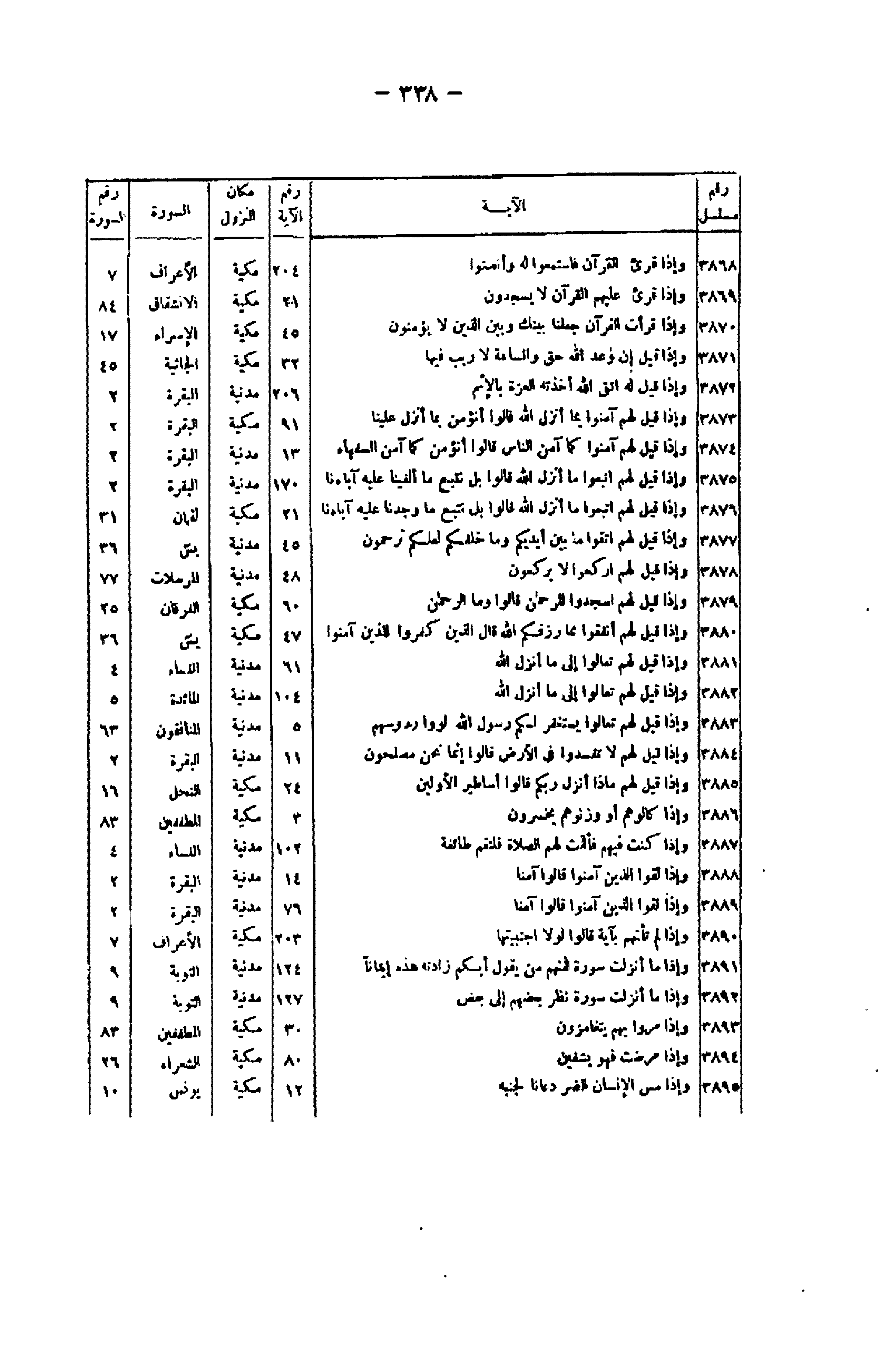 رقم مسلسل/ الآية/ رقم الآية/ مكان النزول/ السورة/ رقم السورة 3868/ وَإِذا قُرِئَ الْقُرْآنُ فَاسْتَمِعُوا لَهُ وَأَنْصِتُوا/ 204/ مكية/ الأعراف/ 7 3869/ وَإِذا قُرِئَ عَلَيْهِمُ الْقُرْآنُ لا يَسْجُدُونَ/ 21/ مكية/ الانشقاق/ 84 3870/ وَإِذا قَرَأْتَ الْقُرْآنَ جَعَلْنا بَيْنَكَ وَبَيْنَ الَّذِينَ لا يُؤْمِنُونَ/ 45/ مكية/ الإسراء/ 17 3871/ وَإِذا قِيلَ إِنَّ وَعْدَ اللَّهِ حَقٌّ وَالسَّاعَةُ لا رَيْبَ فِيها/ 32/ مكية/ الجائية/ 45 3872/ وَإِذا قِيلَ لَهُ اتَّقِ اللَّهَ أَخَذَتْهُ الْعِزَّةُ بِالْإِثْمِ/ 206/ مدنية/ البقرة/ 2 3873/ وَإِذا قِيلَ لَهُمْ آمِنُوا بِما أَنْزَلَ اللَّهُ قالُوا نُؤْمِنُ بِما أُنْزِلَ عَلَيْنا/ 91/ مكية