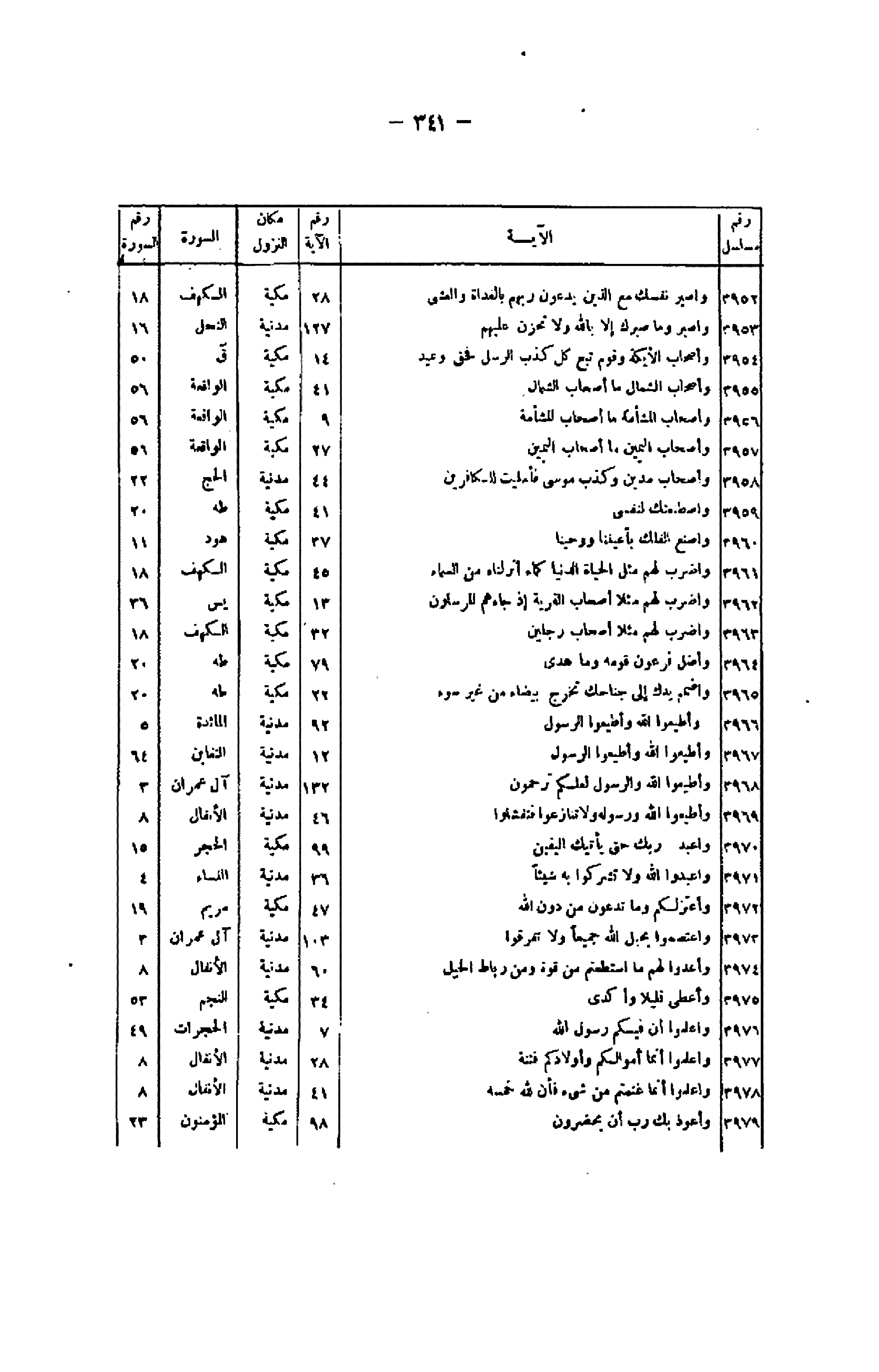 / 127/ مدنية/ النحل/ 16 3954/ وَأَصْحابُ الْأَيْكَةِ وَقَوْمُ تُبَّعٍ كُلٌّ كَذَّبَ الرُّسُلَ فَحَقَّ وَعِيدِ/ 14/ مكية/ ق/ 50 3955/ وَأَصْحابُ الشِّمالِ ما أَصْحابُ الشِّمالِ/ 41/ مكية/ الواقعة/ 56 3956/ وَأَصْحابُ الْمَشْئَمَةِ ما أَصْحابُ الْمَشْئَمَةِ/ 9/ مكية/ الواقعة/ 56 3957/ وَأَصْحابُ الْيَمِينِ ما أَصْحابُ الْيَمِينِ/ 27/ مكية/ الواقعة/ 56 3958/ وَأَصْحابُ مَدْيَنَ وَكُذِّبَ مُوسى فَأَمْلَيْتُ لِلْكافِرِينَ/ 44/ مدنية/ الحج/ 22 3959/ وَاصْطَنَعْتُكَ لِنَفْسِي/ 41/ مكية/ طه/ 20 3960/ وَاصْنَعِ الْفُلْكَ بِأَعْيُنِنا وَوَحْيِنا/ 37/ مكية/ هود/ 11 3961/ وَاضْرِبْ لَهُمْ مَثَلَ الْحَياةِ الدُّنْيا كَماءٍ أَنْزَلْناهُ مِنَ السَّماءِ/ 45/ مكية/ الكهف/ 18 3962/ وَاضْرِبْ لَهُمْ مَثَلًا أَصْحابَ الْقَرْيَةِ إِذْ جاءَهَا الْمُرْسَلُونَ/ 13/ مكية/ يس/ 36 3963/ وَاضْرِبْ لَهُمْ مَثَلًا رَجُلَيْنِ/ 32/ مكية/ الكهف/ 18 3964/ وَأَضَلَّ فِرْعَوْنُ قَوْمَهُ وَما هَدى / 79/ مكية/ طه/ 20 3965/ وَاضْمُمْ يَدَكَ إِلى جَناحِكَ تَخْرُجْ بَيْضاءَ مِنْ غَيْرِ سُوءٍ/ 22/ مكية/ طه/ 20 3966/ وَأَطِيعُوا اللَّهَ وَأَطِيعُوا الرَّسُولَ/ 92/ مدنية/ المائدة/ 5 3967/ وَأَطِيعُوا اللَّهَ وَأَطِيعُوا الرَّسُولَ/ 12/ مدنية/ التغابن/ 64 3968/ وَأَطِيعُوا اللَّهَ وَالرَّسُولَ لَعَلَّكُمْ تُرْحَمُونَ/ 132/ مدنية/ آل عمران/ 3 3969/ وَأَطِيعُوا اللَّهَ وَرَسُولَهُ وَلا تَنازَعُوا فَتَفْشَلُوا/ 46/ مدنية/ الأنفال/ 8 3970/ وَاعْبُدْ رَبَّكَ حَتَّى يَأْتِيَكَ الْيَقِينُ/ 99/ مكية/ الحجر/ 15 3971/ وَاعْبُدُوا اللَّهَ وَلا تُشْرِكُوا بِهِ شَيْئاً/ 36/ مدنية/ النساء/ 4 3972/ وَأَعْتَزِلُكُمْ وَما تَدْعُونَ مِنْ دُونِ اللَّهِ/ 47/ مكية/ مريم/ 19 3973/ وَاعْتَصِمُوا بِحَبْلِ اللَّهِ جَمِيعاً وَلا تَفَرَّقُوا/ 103/ مدنية/ آل عمران/ 3 3974/ وَأَعِدُّوا لَهُمْ مَا اسْتَطَعْتُمْ مِنْ قُوَّةٍ وَمِنْ رِباطِ الْخَيْلِ/ 60/ مدنية/ الأنفال/ 8 3975/ وَأَعْطى قَلِيلًا وَأَكْدى / 34/ مكية/ النجم/ 53 3976/ وَاعْلَمُوا أَنَّ فِيكُمْ رَسُولَ اللَّهِ/ 7/ مدنية/ الحجرات/ 49 3977/ وَاعْلَمُوا أَنَّما أَمْوالُكُمْ وَأَوْلادُكُمْ فِتْنَةٌ