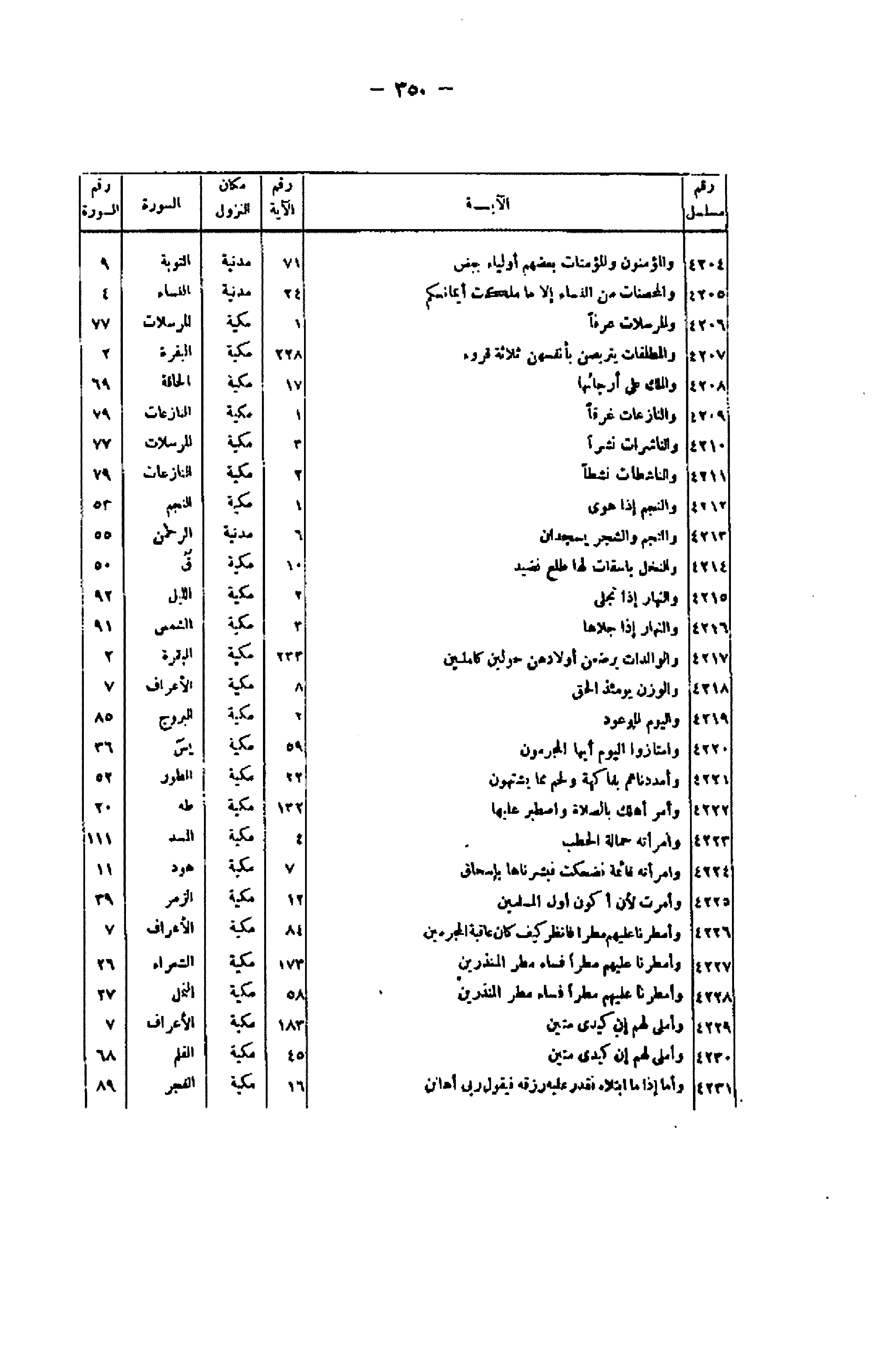 رقم مسلسل/ الآية/ رقم الآية/ مكان النزول/ السورة/ رقم السورة 4204/ وَالْمُؤْمِنُونَ وَالْمُؤْمِناتُ بَعْضُهُمْ أَوْلِياءُ بَعْضٍ/ 71/ مدنية/ التوبة/ 9 4205/ وَالْمُحْصَناتُ مِنَ النِّساءِ إِلَّا ما مَلَكَتْ أَيْمانُكُمْ/ 24/ مدنية/ النساء/ 4 4206/ وَالْمُرْسَلاتِ عُرْفاً/ 1/ مكية/ المرسلات/ 77 4207/ وَالْمُطَلَّقاتُ يَتَرَبَّصْنَ بِأَنْفُسِهِنَّ ثَلاثَةَ قُرُوءٍ/ 228/ مكية/ البقرة/ 2 4208/ وَالْمَلَكُ عَلى أَرْجائِها/ 17/ مكية/ الحاقة/ 69 4209/ وَالنَّازِعاتِ غَرْقاً/ 1/ مكية/ النازعات/ 79 4210/ وَالنَّاشِراتِ نَشْراً/ 3/ مكية/ المرسلات/ 77 4211/ وَالنَّاشِطاتِ نَشْطاً/ 2/ مكية/ النازعات/ 79 4212/ وَالنَّجْمِ إِذا هَوى / 1/ مكية/ النجم/ 53 4213/ وَالنَّجْمُ وَالشَّجَرُ يَسْجُدانِ/ 6/ مدنية/ الرحمن/ 55 4214/ وَالنَّخْلَ باسِقاتٍ لَها طَلْعٌ نَضِيدٌ/ 10/ مكية/ ق/ 50 4215/ وَالنَّهارِ إِذا تَجَلَّى/ 2/ مكية/ الليل/ 92 4216/ وَالنَّهارِ إِذا جَلَّاها/ 3/ مكية/ الشمس/ 91 4217/ وَالْوالِداتُ يُرْضِعْنَ أَوْلادَهُنَّ حَوْلَيْنِ كامِلَيْنِ/ 233/ مكية/ البقرة/ 2 4218/ وَالْوَزْنُ يَوْمَئِذٍ الْحَقُّ/ 8/ مكية/ الأعراف/ 7 4219/ وَالْيَوْمِ الْمَوْعُودِ/ 2/ مكية/ البروج/ 85 4220/ وَامْتازُوا الْيَوْمَ أَيُّهَا الْمُجْرِمُونَ/ 59/ مكية/ يس/ 36 4221/ وَأَمْدَدْناهُمْ بِفاكِهَةٍ وَلَحْمٍ مِمَّا يَشْتَهُونَ/ 22/ مكية/ الطور/ 52 4222/ وَأْمُرْ أَهْلَكَ بِالصَّلاةِ وَاصْطَبِرْ عَلَيْها/ 132/ مكية/ طه/ 20 4223/ وَامْرَأَتُهُ حَمَّالَةَ الْحَطَبِ/ 4/ مكية/ المسد/ 111 4224/ وَامْرَأَتُهُ قائِمَةٌ فَضَحِكَتْ فَبَشَّرْناها بِإِسْحاقَ/ 7/ مكية/ هود/ 11 4225/ وَأُمِرْتُ لِأَنْ أَكُونَ أَوَّلَ الْمُسْلِمِينَ/ 12/ مكية/ الزمر/ 39 4226/ وَأَمْطَرْنا عَلَيْهِمْ مَطَراً فَانْظُرْ كَيْفَ كانَ عاقِبَةُ الْمُجْرِمِينَ/ 84/ مكية/ الأعراف/ 7 4227/ وَأَمْطَرْنا عَلَيْهِمْ مَطَراً فَساءَ مَطَرُ الْمُنْذَرِينَ/ 173/ مكية/ الشعراء/ 26 4228/ وَأَمْطَرْنا عَلَيْهِمْ مَطَراً فَساءَ مَطَرُ الْمُنْذَرِينَ/ 58/ مكية/ النمل/ 27 4229/ وَأُمْلِي لَهُمْ إِنَّ كَيْدِي مَتِينٌ/ 183/ مكية/ الأعراف/ 7 4230/ وَأُمْلِي لَهُمْ إِنَّ كَيْدِي مَتِينٌ/ 45/ مكية/ القلم/ 68 4231/ وَأَمَّا إِذا مَا ابْتَلاهُ فَقَدَرَ عَلَيْهِ رِزْقَهُ فَيَقُولُ رَبِّي أَهانَنِ/ 16/ مكية/ الفجر/ 89