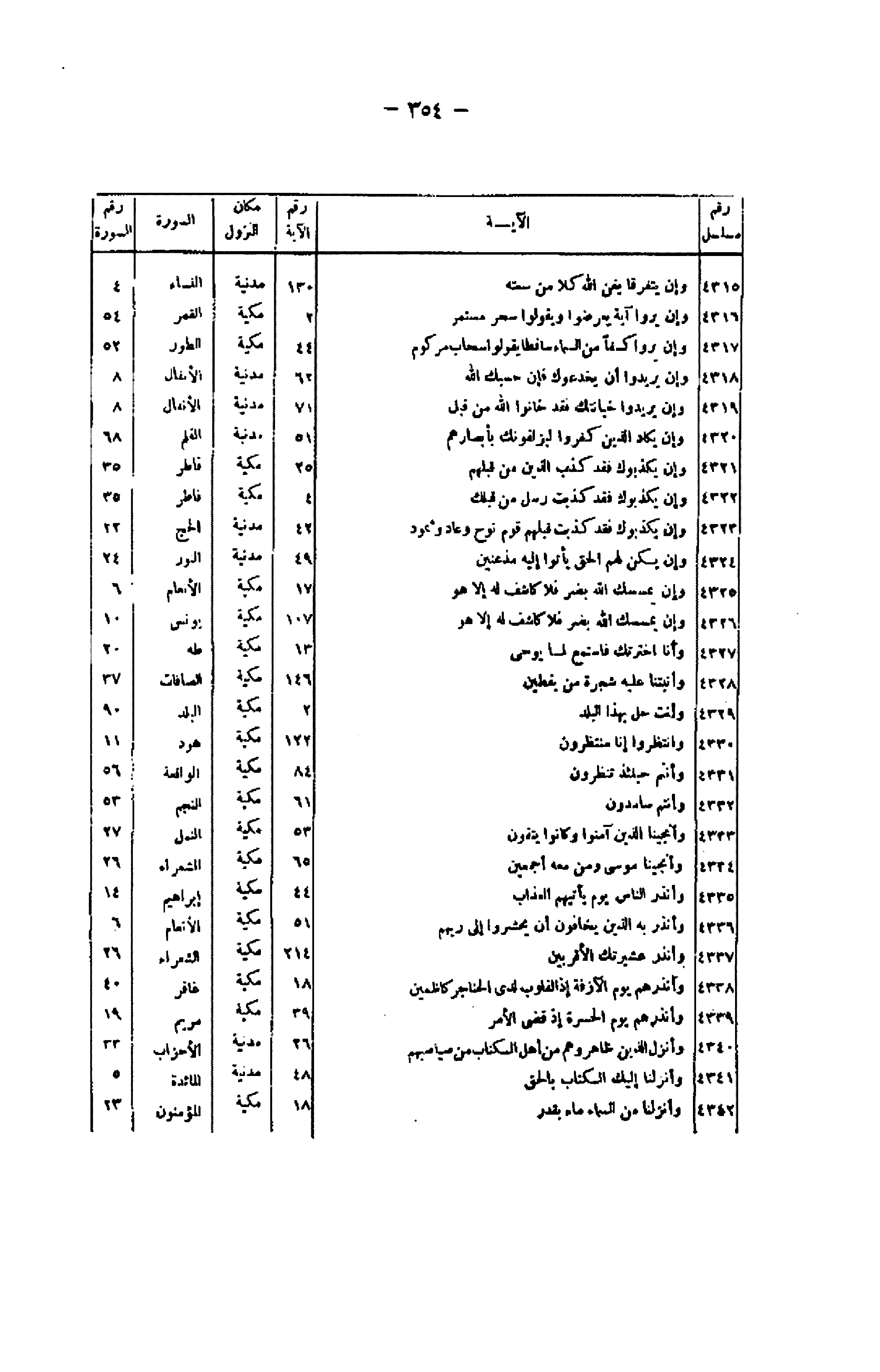 رقم مسلسل/ الآية/ رقم الآية/ مكان النزول/ السورة/ رقم السورة 4315/ وَإِنْ يَتَفَرَّقا يُغْنِ اللَّهُ كُلًّا مِنْ سَعَتِهِ/ 130/ مدنية/ النساء/ 4 4316/ وَإِنْ يَرَوْا آيَةً يُعْرِضُوا وَيَقُولُوا سِحْرٌ مُسْتَمِرٌّ/ 2/ مكية/ القمر/ 54 4317/ وَإِنْ يَرَوْا كِسْفاً مِنَ السَّماءِ ساقِطاً يَقُولُوا سَحابٌ مَرْكُومٌ/ 44/ مكية/ الطور/ 52 4318/ وَإِنْ يُرِيدُوا أَنْ يَخْدَعُوكَ فَإِنَّ حَسْبَكَ اللَّهُ/ 62/ مدنية/ الأنفال/ 8 4319/ وَإِنْ يُرِيدُوا خِيانَتَكَ فَقَدْ خانُوا اللَّهَ مِنْ قَبْلُ/ 71/ مدنية/ الأنفال/ 8 4320/ وَإِنْ يَكادُ الَّذِينَ كَفَرُوا لَيُزْلِقُونَكَ بِأَبْصارِهِمْ/ 51/ مدنية/ القلم/ 68 4321/ وَإِنْ يُكَذِّبُوكَ فَقَدْ كَذَّبَ الَّذِينَ مِنْ قَبْلِهِمْ/ 25/ مكية/ فاطر/ 35 4322/ وَإِنْ يُكَذِّبُوكَ فَقَدْ كُذِّبَتْ رُسُلٌ مِنْ قَبْلِكَ/ 4/ مكية/ فاطر/ 35 4323/ وَإِنْ يُكَذِّبُوكَ فَقَدْ كَذَّبَتْ قَبْلَهُمْ قَوْمُ نُوحٍ وَعادٌ وَثَمُودُ/ 42/ مدنية/ الحج/ 22 4324/ وَإِنْ يَكُنْ لَهُمُ الْحَقُّ يَأْتُوا إِلَيْهِ مُذْعِنِينَ/ 49/ مدنية/ النور/ 24 4325/ وَإِنْ يَمْسَسْكَ اللَّهُ بِضُرٍّ فَلا كاشِفَ لَهُ إِلَّا هُوَ/ 17/ مكية/ الأنعام/ 6 4326/ وَإِنْ يَمْسَسْكَ اللَّهُ بِضُرٍّ فَلا كاشِفَ لَهُ إِلَّا هُوَ/ 107/ مكية/ يونس/ 10 4327/ وَأَنَا اخْتَرْتُكَ فَاسْتَمِعْ لِما يُوحى / 13/ مكية/ طه/ 20 4328/ وَأَنْبَتْنا عَلَيْهِ شَجَرَةً مِنْ يَقْطِينٍ/ 146/ مكية/ الصافات/ 37 4329/ وَأَنْتَ حِلٌّ بِهذَا الْبَلَدِ/ 2/ مكية/ البلد/ 90 4330/ وَانْتَظِرُوا إِنَّا مُنْتَظِرُونَ/ 122/ مكية/ هود/ 11 4331/ وَأَنْتُمْ حِينَئِذٍ تَنْظُرُونَ/ 84/ مكية/ الواقعة/ 56 4332/ وَأَنْتُمْ سامِدُونَ/ 61/ مكية/ النجم/ 53 4333/ وَأَنْجَيْنَا الَّذِينَ آمَنُوا وَكانُوا يَتَّقُونَ/ 53/ مكية/ النمل/ 27 4334/ وَأَنْجَيْنا مُوسى وَمَنْ مَعَهُ أَجْمَعِينَ/ 65/ مكية/ الشعراء/ 26 4335/ وَأَنْذِرِ النَّاسَ يَوْمَ يَأْتِيهِمُ الْعَذابُ/ 44/ مكية/ إبراهيم/ 14 4336/ وَأَنْذِرْ بِهِ الَّذِينَ يَخافُونَ أَنْ يُحْشَرُوا إِلى رَبِّهِمْ/ 51/ مكية/ الأنعام/ 6 4337/ وَأَنْذِرْ عَشِيرَتَكَ الْأَقْرَبِينَ/ 214/ مكية/ الشعراء/ 26 4338/ وَأَنْذِرْهُمْ يَوْمَ الْآزِفَةِ إِذِ الْقُلُوبُ لَدَى الْحَناجِرِ كاظِمِينَ/ 18/ مكية/ غافر/ 40 4339/ وَأَنْذِرْهُمْ يَوْمَ الْحَسْرَةِ إِذْ قُضِيَ الْأَمْرُ/ 39/ مكية/ مريم/ 19 4340/ وَأَنْزَلَ الَّذِينَ ظاهَرُوهُمْ مِنْ أَهْلِ الْكِتابِ مِنْ صَياصِيهِمْ/ 26/ مدنية/ الأحزاب/ 33 4341/ وَأَنْزَلْنا إِلَيْكَ الْكِتابَ بِالْحَقِّ/ 48/ مدنية/ المائدة/ 5 4342/ وَأَنْزَلْنا مِنَ السَّماءِ ماءً بِقَدَرٍ/ 18/ مكية/ المؤمنون/ 23
