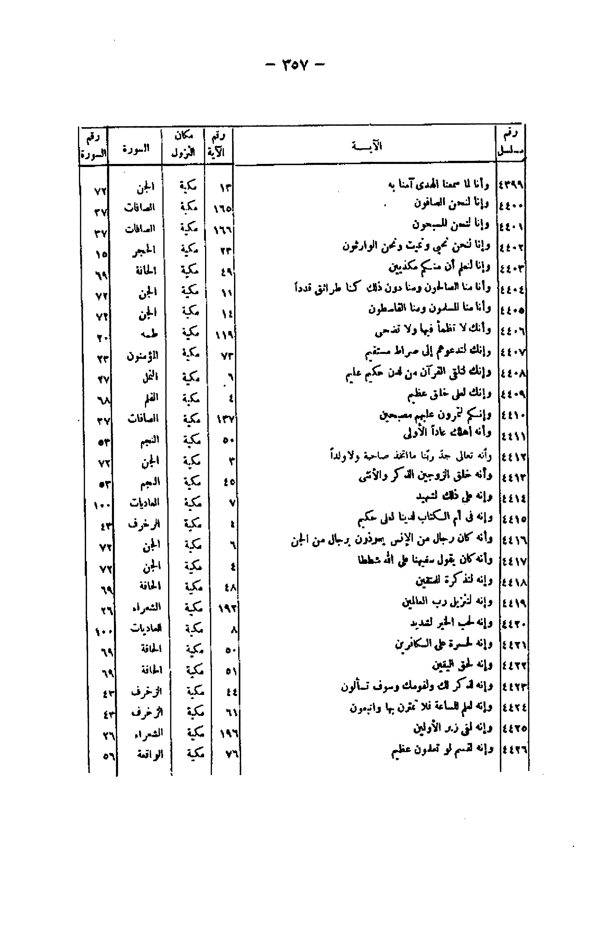 رقم مسلسل/ الآية/ رقم الآية/ مكان النزول/ السورة/ رقم السورة 4399/ وَأَنَّا لَمَّا سَمِعْنَا الْهُدى آمَنَّا بِهِ/ 13/ مكية/ الجن/ 72 4400/ وَإِنَّا لَنَحْنُ الصَّافُّونَ/ 165/ مكية/ الصافات/ 37 4401/ وَإِنَّا لَنَحْنُ الْمُسَبِّحُونَ/ 166/ مكية/ الصافات/ 37 4402/ وَإِنَّا لَنَحْنُ نُحْيِي وَنُمِيتُ وَنَحْنُ الْوارِثُونَ/ 23/ مكية/ الحجر/ 15 4403/ وَإِنَّا لَنَعْلَمُ أَنَّ مِنْكُمْ مُكَذِّبِينَ/ 49/ مكية/ الحاقة/ 69 4404/ وَأَنَّا مِنَّا الصَّالِحُونَ وَمِنَّا دُونَ ذلِكَ كُنَّا طَرائِقَ قِدَداً/ 11/ مكية/ الجن/ 72 4405/ وَأَنَّا مِنَّا الْمُسْلِمُونَ وَمِنَّا الْقاسِطُونَ/ 14/ مكية/ الجن/ 72 4406/ وَأَنَّكَ لا تَظْمَؤُا فِيها وَلا تَضْحى / 119/ مكية/ طه/ 20 4407/ وَإِنَّكَ لَتَدْعُوهُمْ إِلى صِراطٍ مُسْتَقِيمٍ/ 73/ مكية/ المؤمنون/ 23 4408/ وَإِنَّكَ لَتُلَقَّى الْقُرْآنَ مِنْ لَدُنْ حَكِيمٍ عَلِيمٍ/ 6/ مكية/ النمل/ 27 4409/ وَإِنَّكَ لَعَلى خُلُقٍ عَظِيمٍ/ 4/ مكية/ القلم/ 68 4410/ وَإِنَّكُمْ لَتَمُرُّونَ عَلَيْهِمْ مُصْبِحِينَ
