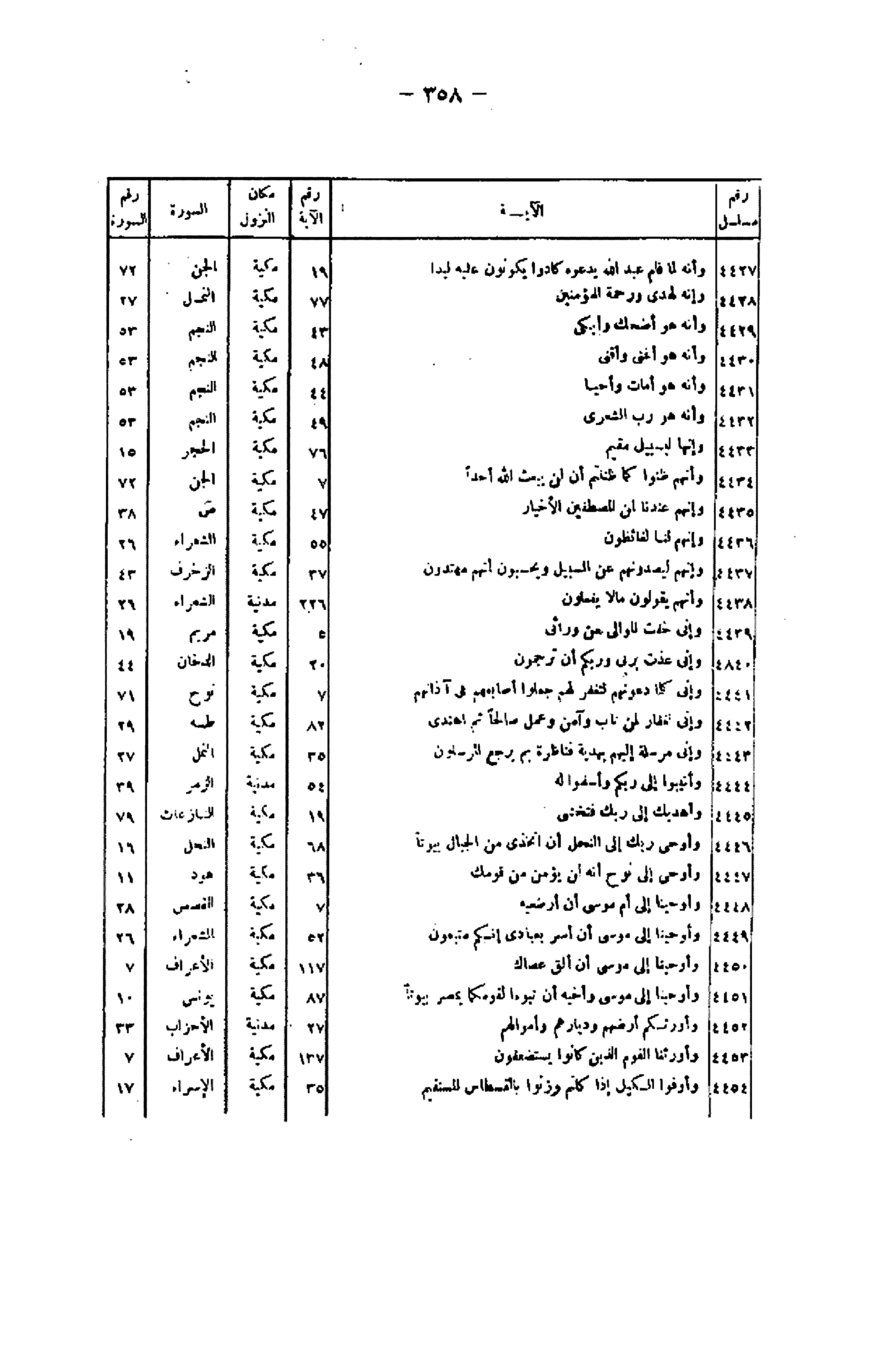 رقم مسلسل/ الآية/ رقم الآية/ مكان النزول/ السورة/ رقم السورة 4427/ وَأَنَّهُ لَمَّا قامَ عَبْدُ اللَّهِ يَدْعُوهُ كادُوا يَكُونُونَ عَلَيْهِ لِبَداً/ 19/ مكية/ الجن/ 72 4428/ وَإِنَّهُ لَهُدىً وَرَحْمَةٌ لِلْمُؤْمِنِينَ/ 77/ مكية/ النمل/ 27 4429/ وَأَنَّهُ هُوَ أَضْحَكَ وَأَبْكى / 43/ مكية/ النجم/ 53 4430/ وَأَنَّهُ هُوَ أَغْنى وَأَقْنى / 48/ مكية/ النجم/ 53 4431/ وَأَنَّهُ هُوَ أَماتَ وَأَحْيا/ 44/ مكية/ النجم/ 53 4432/ وَأَنَّهُ هُوَ رَبُّ الشِّعْرى / 49/ مكية/ النجم/ 53 4433/ وَإِنَّها لَبِسَبِيلٍ مُقِيمٍ/ 76/ مكية/ الحجر/ 15 4434/ وَأَنَّهُمْ ظَنُّوا كَما ظَنَنْتُمْ أَنْ لَنْ يَبْعَثَ اللَّهُ أَحَداً/ 7/ مكية/ الجن/ 72 4435/ وَإِنَّهُمْ عِنْدَنا لَمِنَ الْمُصْطَفَيْنَ الْأَخْيارِ/ 47/ مكية/ ص/ 38 4436/ وَإِنَّهُمْ لَنا لَغائِظُونَ/ 55/ مكية/ الشعراء/ 26 4437/ وَإِنَّهُمْ لَيَصُدُّونَهُمْ عَنِ السَّبِيلِ وَيَحْسَبُونَ أَنَّهُمْ مُهْتَدُونَ/ 37/ مكية/ الزخرف/ 43 4438/ وَأَنَّهُمْ يَقُولُونَ ما لا يَفْعَلُونَ/ 226/ مدنية/ الشعراء/ 26 4439/ وَإِنِّي خِفْتُ الْمَوالِيَ مِنْ وَرائِي/ 5/ مكية/ مريم/ 19 4440/ وَإِنِّي عُذْتُ بِرَبِّي وَرَبِّكُمْ أَنْ تَرْجُمُونِ/ 20/ مكية/ الدخان/ 44 4441/ وَإِنِّي كُلَّما دَعَوْتُهُمْ لِتَغْفِرَ لَهُمْ جَعَلُوا أَصابِعَهُمْ فِي آذانِهِمْ/ 7/ مكية/ نوح/ 71 4442/ وَإِنِّي لَغَفَّارٌ لِمَنْ تابَ وَآمَنَ وَعَمِلَ صالِحاً ثُمَّ اهْتَدى / 82/ مكية/ طه/ 29 4443/ وَإِنِّي مُرْسِلَةٌ إِلَيْهِمْ بِهَدِيَّةٍ فَناظِرَةٌ بِمَ يَرْجِعُ الْمُرْسَلُونَ/ 35/ مكية/ النمل/ 27 4444/ وَأَنِيبُوا إِلى رَبِّكُمْ وَأَسْلِمُوا لَهُ/ 54/ مدنية/ الزمر/ 39 4445/ وَأَهْدِيَكَ إِلى رَبِّكَ فَتَخْشى / 19/ مكية/ النازعات/ 79 4446/ وَأَوْحى رَبُّكَ إِلَى النَّحْلِ أَنِ اتَّخِذِي مِنَ الْجِبالِ بُيُوتاً/ 68/ مكية/ النحل/ 16 4447/ وَأُوحِيَ إِلى نُوحٍ أَنَّهُ لَنْ يُؤْمِنَ مِنْ قَوْمِكَ/ 36/ مكية/ هود/ 11 4448/ وَأَوْحَيْنا إِلى أُمِّ مُوسى أَنْ أَرْضِعِيهِ/ 7/ مكية/ القصص/ 28 4449/ وَأَوْحَيْنا إِلى مُوسى أَنْ أَسْرِ بِعِبادِي إِنَّكُمْ مُتَّبَعُونَ/ 52/ مكية/ الشعراء/ 26 4450/ وَأَوْحَيْنا إِلى مُوسى أَنْ أَلْقِ عَصاكَ/ 117/ مكية/ الأعراف/ 7 4451/ وَأَوْحَيْنا إِلى مُوسى وَأَخِيهِ أَنْ تَبَوَّءا لِقَوْمِكُما بِمِصْرَ بُيُوتاً/ 87/ مكية/ يونس/ 10 4452/ وَأَوْرَثَكُمْ أَرْضَهُمْ وَدِيارَهُمْ وَأَمْوالَهُمْ/ 27/ مدنية/ الأحزاب/ 33 4453/ وَأَوْرَثْنَا الْقَوْمَ الَّذِينَ كانُوا يُسْتَضْعَفُونَ/ 137/ مكية/ الأعراف/ 7 4454/ وَأَوْفُوا الْكَيْلَ إِذا كِلْتُمْ وَزِنُوا بِالْقِسْطاسِ الْمُسْتَقِيمِ/ 35/ مكية/ الإسراء/ 17