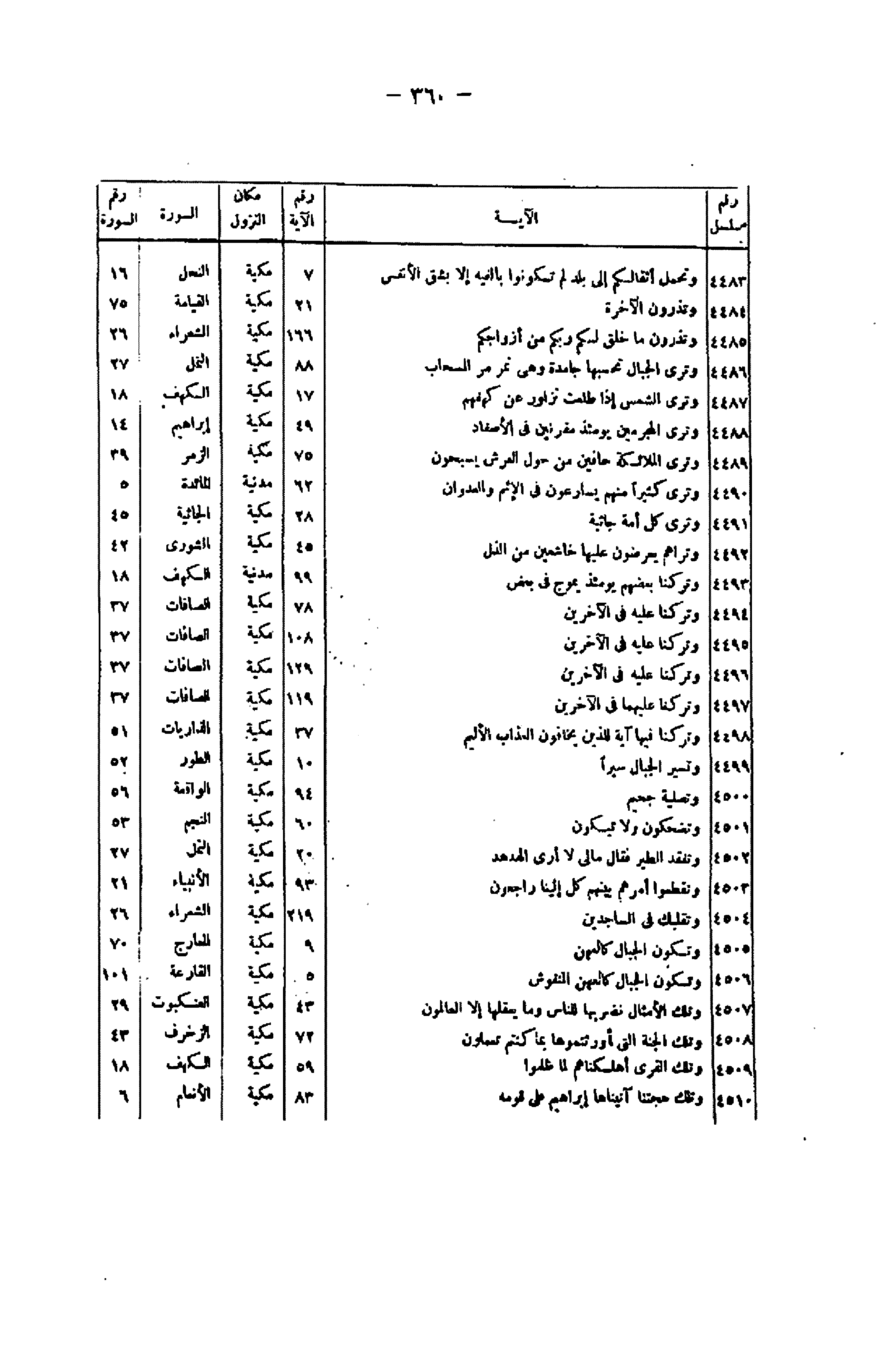رقم مسلسل/ الآية/ رقم الآية/ مكان النزول/ السورة/ رقم السورة 4483/ وَتَحْمِلُ أَثْقالَكُمْ إِلى بَلَدٍ لَمْ تَكُونُوا بالِغِيهِ إِلَّا بِشِقِّ الْأَنْفُسِ/ 7/ مكية/ النحل/ 16 4484/ وَتَذَرُونَ الْآخِرَةَ/ 21/ مكية/ القيامة/ 75 4485/ وَتَذَرُونَ ما خَلَقَ لَكُمْ رَبُّكُمْ مِنْ أَزْواجِكُمْ/ 166/ مكية/ الشعراء/ 26 4486/ وَتَرَى الْجِبالَ تَحْسَبُها جامِدَةً وَهِيَ تَمُرُّ مَرَّ السَّحابِ/ 88/ مكية/ النمل/ 27 4487/ وَتَرَى الشَّمْسَ إِذا طَلَعَتْ تَتَزاوَرُ عَنْ كَهْفِهِمْ/ 17/ مكية/ الكهف/ 18 4488/ وَتَرَى الْمُجْرِمِينَ يَوْمَئِذٍ مُقَرَّنِينَ فِي الْأَصْفادِ/ 49/ مكية/ إبراهيم/ 14 4489/ وَتَرَى الْمَلائِكَةَ حَافِّينَ مِنْ حَوْلِ الْعَرْشِ يُسَبِّحُونَ