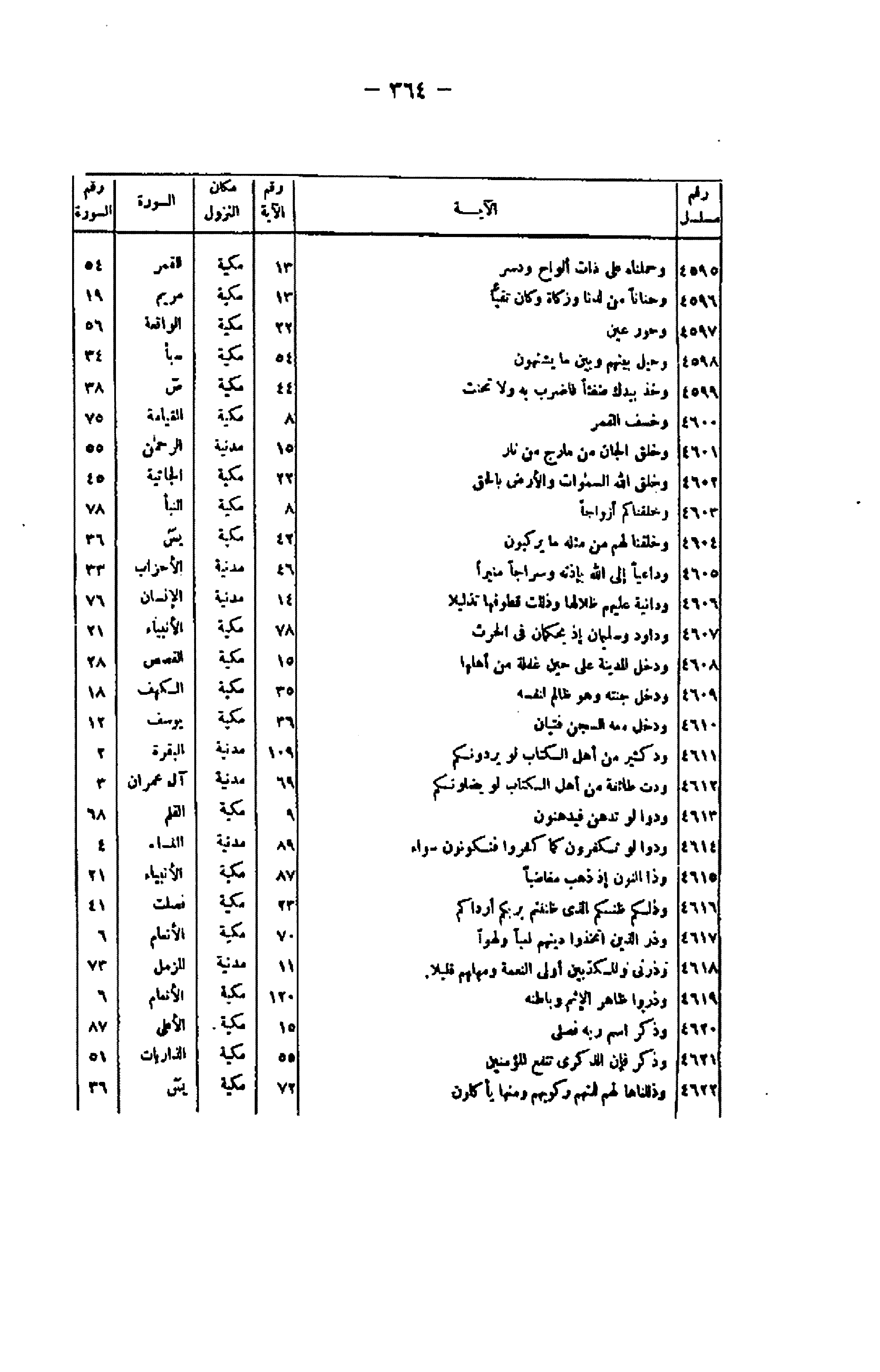 رقم مسلسل/ الآية/ رقم الآية/ مكان النزول/ السورة/ رقم السورة 4595/ وَحَمَلْناهُ عَلى ذاتِ أَلْواحٍ وَدُسُرٍ/ 13/ مكية/ القمر/ 54 4596/ وَحَناناً مِنْ لَدُنَّا وَزَكاةً وَكانَ تَقِيًّا/ 13/ مكية/ مريم/ 19 4597/ وَحُورٌ عِينٌ/ 22/ مكية/ الواقعة/ 56 4598/ وَحِيلَ بَيْنَهُمْ وَبَيْنَ ما يَشْتَهُونَ/ 54/ مكية/ سبأ/ 34 4599/ وَخُذْ بِيَدِكَ ضِغْثاً فَاضْرِبْ بِهِ وَلا تَحْنَثْ/ 44/ مكية/ ص/ 38 4600/ وَخَسَفَ الْقَمَرُ/ 8/ مكية/ القيامة/ 75 4601/ وَخَلَقَ الْجَانَّ مِنْ مارِجٍ مِنْ نارٍ/ 15/ مدنية/ الرحمن/ 55 4602/ وَخَلَقَ اللَّهُ السَّماواتِ وَالْأَرْضَ بِالْحَقِّ/ 22/ مكية/ الجاثية/ 45 4603/ وَخَلَقْناكُمْ أَزْواجاً/ 8/ مكية/ النبأ/ 78 4604/ وَخَلَقْنا لَهُمْ مِنْ مِثْلِهِ ما يَرْكَبُونَ/ 42/ مكية/ يس/ 36 4605/ وَداعِياً إِلَى اللَّهِ بِإِذْنِهِ وَسِراجاً مُنِيراً/ 46/ مدنية/ الأحزاب/ 33 4606/ وَدانِيَةً عَلَيْهِمْ ظِلالُها وَذُلِّلَتْ قُطُوفُها تَذْلِيلًا/ 14/ مدنية/ الإنسان/ 76 4607/ وَداوُدَ وَسُلَيْمانَ إِذْ يَحْكُمانِ فِي الْحَرْثِ/ 78/ مكية/ الأنبياء/ 21 4608/ وَدَخَلَ الْمَدِينَةَ عَلى حِينِ غَفْلَةٍ مِنْ أَهْلِها/ 15/ مكية/ القصص/ 28 4609/ وَدَخَلَ جَنَّتَهُ وَهُوَ ظالِمٌ لِنَفْسِهِ/ 35/ مكية/ الكهف/ 18 4610/ وَدَخَلَ مَعَهُ السِّجْنَ فَتَيانِ/ 36/ مكية/ يوسف/ 12 4611/ وَدَّ كَثِيرٌ مِنْ أَهْلِ الْكِتابِ لَوْ يَرُدُّونَكُمْ/ 109/ مدنية/ البقرة/ 2 4612/ وَدَّتْ طائِفَةٌ مِنْ أَهْلِ الْكِتابِ لَوْ يُضِلُّونَكُمْ/ 69/ مدنية/ آل عمران/ 3 4613/ وَدُّوا لَوْ تُدْهِنُ فَيُدْهِنُونَ/ 9/ مكية/ القلم/ 68 4614/ وَدُّوا لَوْ تَكْفُرُونَ كَما كَفَرُوا فَتَكُونُونَ سَواءً/ 89/ مدنية/ النساء/ 4 4615/ وَذَا النُّونِ إِذْ ذَهَبَ مُغاضِباً/ 87/ مكية/ الأنبياء/ 21 4616/ وَذلِكُمْ ظَنُّكُمُ الَّذِي ظَنَنْتُمْ بِرَبِّكُمْ أَرْداكُمْ/ 23/ مكية/ فصلت/ 41 4617/ وَذَرِ الَّذِينَ اتَّخَذُوا دِينَهُمْ لَعِباً وَلَهْواً/ 70/ مكية