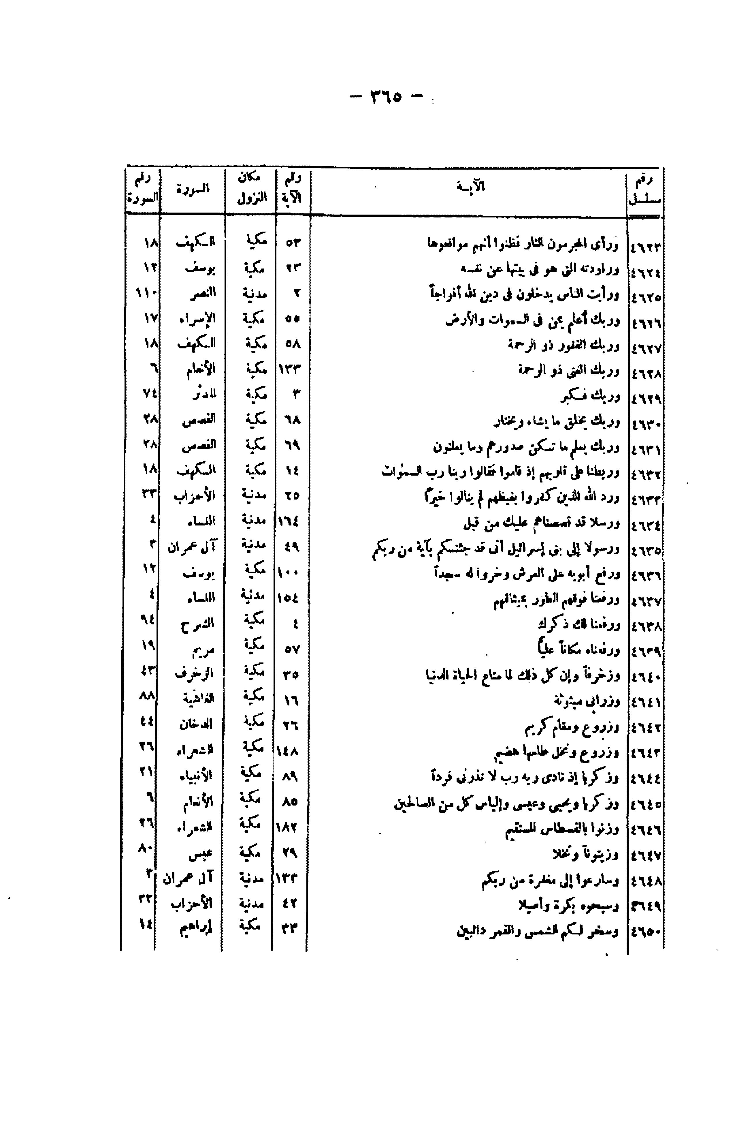 رقم مسلسل/ الآية/ رقم الآية/ مكان النزول/ السورة/ رقم السورة 4623/ وَرَأَى الْمُجْرِمُونَ النَّارَ فَظَنُّوا أَنَّهُمْ مُواقِعُوها/ 53/ مكية/ الكهف/ 18 4624/ وَراوَدَتْهُ الَّتِي هُوَ فِي بَيْتِها عَنْ نَفْسِهِ/ 23/ مكية/ يوسف/ 12 4625/ وَرَأَيْتَ النَّاسَ يَدْخُلُونَ فِي دِينِ اللَّهِ أَفْواجاً/ 2/ مدنية/ النصر/ 110 4626/ وَرَبُّكَ أَعْلَمُ بِمَنْ فِي السَّماواتِ وَالْأَرْضِ/ 55/ مكية/ الإسراء/ 17 4627/ وَرَبُّكَ الْغَفُورُ ذُو الرَّحْمَةِ/ 58/ مكية/ الكهف/ 18 4628/ وَرَبُّكَ الْغَنِيُّ ذُو الرَّحْمَةِ/ 133/ مكية/ الأنعام/ 6 4629/ وَرَبَّكَ فَكَبِّرْ/ 3/ مكية/ المدثر/ 74 4630/ وَرَبُّكَ يَخْلُقُ ما يَشاءُ وَيَخْتارُ/ 68/ مكية/ القصص/ 28 4631/ وَرَبُّكَ يَعْلَمُ ما تُكِنُّ صُدُورُهُمْ وَما يُعْلِنُونَ/ 69/ مكية/ القصص/ 28 4632/ وَرَبَطْنا عَلى قُلُوبِهِمْ إِذْ قامُوا فَقالُوا رَبُّنا رَبُّ السَّماواتِ/ 14/ مكية/ الكهف/ 18 4633/ وَرَدَّ اللَّهُ الَّذِينَ كَفَرُوا بِغَيْظِهِمْ لَمْ يَنالُوا خَيْراً/ 25/ مدنية/ الأحزاب/ 33 4634/ وَرُسُلًا قَدْ قَصَصْناهُمْ عَلَيْكَ مِنْ قَبْلُ/ 164/ مدنية/ النساء/ 4 4635/ وَرَسُولًا إِلى بَنِي إِسْرائِيلَ أَنِّي قَدْ جِئْتُكُمْ بِآيَةٍ مِنْ رَبِّكُمْ/ 49/ مدنية/ آل عمران/ 3 4636/ وَرَفَعَ أَبَوَيْهِ عَلَى الْعَرْشِ وَخَرُّوا لَهُ سُجَّداً/ 100/ مكية/ يوسف/ 12 4637/ وَرَفَعْنا فَوْقَهُمُ الطُّورَ بِمِيثاقِهِمْ/ 154/ مدنية/ النساء/ 4 4638/ وَرَفَعْنا لَكَ ذِكْرَكَ/ 4/ مكية/ الشرح/ 94 4639/ وَرَفَعْناهُ مَكاناً عَلِيًّا/ 57/ مكية/ مريم/ 19 4640/ وَزُخْرُفاً وَإِنْ كُلُّ ذلِكَ لَمَّا مَتاعُ الْحَياةِ الدُّنْيا/ 35/ مكية/ الزخرف/ 43 4641/ وَزَرابِيُّ مَبْثُوثَةٌ/ 16/ مكية/ الغاشية/ 88 4642/ وَزُرُوعٍ وَمَقامٍ كَرِيمٍ/ 26/ مكية/ الدخان/ 44 4643/ وَزُرُوعٍ وَنَخْلٍ طَلْعُها هَضِيمٌ/ 148/ مكية/ الشعراء/ 26 4644/ وَزَكَرِيَّا إِذْ نادى رَبَّهُ رَبِّ لا تَذَرْنِي فَرْداً/ 89/ مكية/ الأنبياء/ 21 4645/ وَزَكَرِيَّا وَيَحْيى وَعِيسى وَإِلْياسَ كُلٌّ مِنَ الصَّالِحِينَ/ 85/ مكية/ الأنعام/ 6 4646/ وَزِنُوا بِالْقِسْطاسِ الْمُسْتَقِيمِ/ 182/ مكية/ الشعراء/ 26 4647/ وَزَيْتُوناً وَنَخْلًا/ 29/ مكية/ عبس/ 80 4648/ وَسارِعُوا إِلى مَغْفِرَةٍ مِنْ رَبِّكُمْ/ 133/ مدنية/ آل عمران/ 3 4649/ وَسَبِّحُوهُ بُكْرَةً وَأَصِيلًا/ 42/ مدنية/ الأحزاب/ 33 4650/ وَسَخَّرَ لَكُمُ الشَّمْسَ وَالْقَمَرَ دائِبَيْنِ/ 33/ مكية/ إبراهيم/ 14