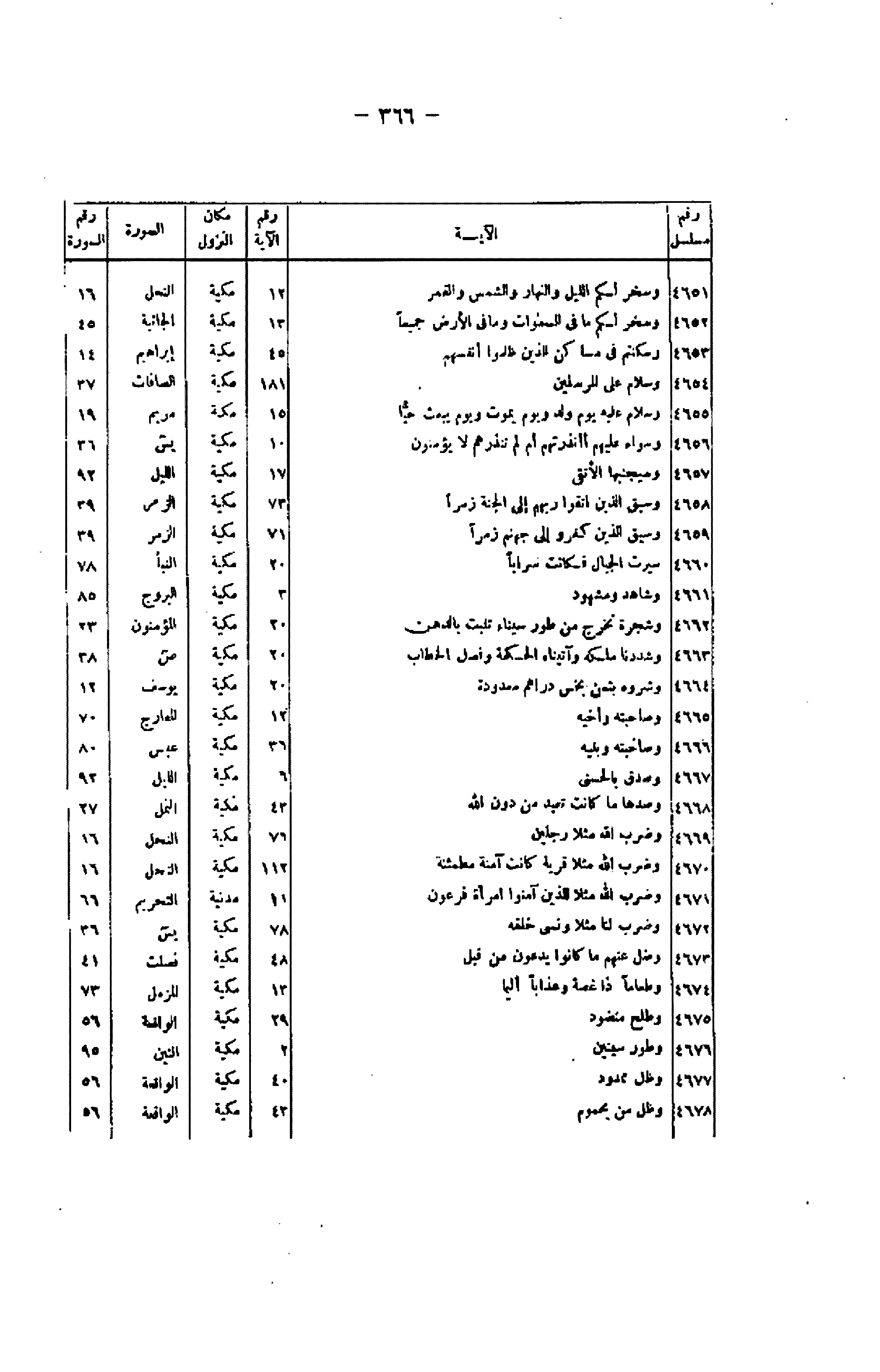 رقم مسلسل/ الآية/ رقم الآية/ مكان النزول/ السورة/ رقم السورة 4651/ وَسَخَّرَ لَكُمُ اللَّيْلَ وَالنَّهارَ وَالشَّمْسَ وَالْقَمَرَ/ 12/ مكية/ النحل/ 16 4652/ وَسَخَّرَ لَكُمْ ما فِي السَّماواتِ وَما فِي الْأَرْضِ جَمِيعاً/ 13/ مكية/ الجاثية/ 45 4653/ وَسَكَنْتُمْ فِي مَساكِنِ الَّذِينَ ظَلَمُوا أَنْفُسَهُمْ/ 45/ مكية/ إبراهيم/ 14 4654/ وَسَلامٌ عَلَى الْمُرْسَلِينَ/ 181/ مكية/ الصافات/ 37 4655/ وَسَلامٌ عَلَيْهِ يَوْمَ وُلِدَ وَيَوْمَ يَمُوتُ وَيَوْمَ يُبْعَثُ حَيًّا