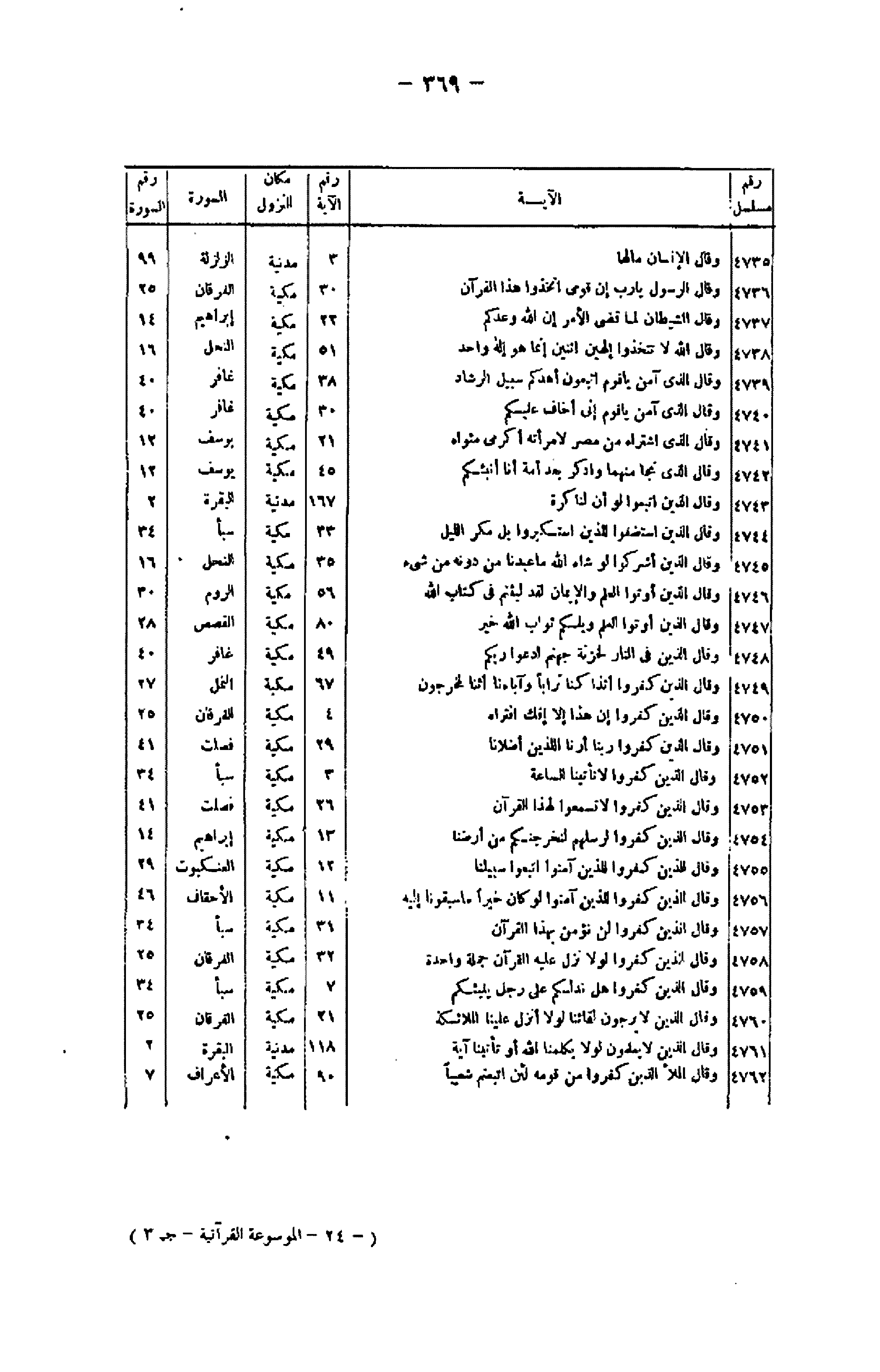 رقم مسلسل/ الآية/ رقم الآية/ مكان النزول/ السورة/ رقم السورة 4735/ وَقالَ الْإِنْسانُ ما لَها/ 3/ مدنية/ الزلزلة/ 99 4736/ وَقالَ الرَّسُولُ يا رَبِّ إِنَّ قَوْمِي اتَّخَذُوا هذَا الْقُرْآنَ/ 30/ مكية/ الفرقان/ 25 4737/ وَقالَ الشَّيْطانُ لَمَّا قُضِيَ الْأَمْرُ إِنَّ اللَّهَ وَعَدَكُمْ/ 22/ مكية/ إبراهيم/ 14 4738/ وَقالَ اللَّهُ لا تَتَّخِذُوا إِلهَيْنِ اثْنَيْنِ إِنَّما هُوَ إِلهٌ واحِدٌ/ 51/ مكية/ النحل/ 16 4739/ وَقالَ الَّذِي آمَنَ يا قَوْمِ اتَّبِعُونِ أَهْدِكُمْ سَبِيلَ الرَّشادِ/ 38/ مكية/ غافر/ 40 4740/ وَقالَ الَّذِي آمَنَ يا قَوْمِ إِنِّي أَخافُ عَلَيْكُمْ/ 30/ مكية/ غافر/ 40 4741/ وَقالَ الَّذِي اشْتَراهُ مِنْ مِصْرَ لِامْرَأَتِهِ أَكْرِمِي مَثْواهُ/ 21/ مكية/ يوسف/ 12 4742/ وَقالَ الَّذِي نَجا مِنْهُما وَادَّكَرَ بَعْدَ أُمَّةٍ أَنَا أُنَبِّئُكُمْ/ 45/ مكية/ يوسف/ 12 4743/ وَقالَ الَّذِينَ اتَّبَعُوا لَوْ أَنَّ لَنا كَرَّةً/ 167/ مدنية/ البقرة/ 2 4744/ وَقالَ الَّذِينَ اسْتُضْعِفُوا لِلَّذِينَ اسْتَكْبَرُوا بَلْ مَكْرُ اللَّيْلِ/ 33/ مكية/ سبأ/ 34 4745/ وَقالَ الَّذِينَ أَشْرَكُوا لَوْ شاءَ اللَّهُ ما عَبَدْنا مِنْ دُونِهِ مِنْ شَيْءٍ/ 35/ مكية/ النحل/ 16 4746/ وَقالَ الَّذِينَ أُوتُوا الْعِلْمَ وَالْإِيمانَ لَقَدْ لَبِثْتُمْ فِي كِتابِ اللَّهِ/ 56/ مكية/ الروم/ 30 4747/ وَقالَ الَّذِينَ أُوتُوا الْعِلْمَ وَيْلَكُمْ ثَوابُ اللَّهِ خَيْرٌ/ 80/ مكية/ القصص/ 28 4748/ وَقالَ الَّذِينَ فِي النَّارِ لِخَزَنَةِ جَهَنَّمَ ادْعُوا رَبَّكُمْ/ 49/ مكية/ غافر/ 40 4749/ وَقالَ الَّذِينَ كَفَرُوا أَإِذا كُنَّا تُراباً وَآباؤُنا أَإِنَّا لَمُخْرَجُونَ/ 67/ مكية/ النمل/ 27 4750/ وَقالَ الَّذِينَ كَفَرُوا إِنْ هَذا إِلَّا إِفْكٌ افْتَراهُ/ 4/ مكية/ الفرقان/ 25 4751/ وَقالَ الَّذِينَ كَفَرُوا رَبَّنا أَرِنَا الَّذَيْنِ أَضَلَّانا/ 29/ مكية/ فصلت/ 41 4752/ وَقالَ الَّذِينَ كَفَرُوا لا تَأْتِينَا السَّاعَةُ/ 3/ مكية/ سبأ/ 34 4753/ وَقالَ الَّذِينَ كَفَرُوا لا تَسْمَعُوا لِهذَا الْقُرْآنِ/ 26/ مكية/ فصلت/ 41 4754/ وَقالَ الَّذِينَ كَفَرُوا لِرُسُلِهِمْ لَنُخْرِجَنَّكُمْ مِنْ أَرْضِنا/ 13/ مكية/ إبراهيم/ 14 4755/ وَقالَ الَّذِينَ كَفَرُوا لِلَّذِينَ آمَنُوا اتَّبِعُوا سَبِيلَنا/ 12/ مكية/ العنكبوت/ 29 4756/ وَقالَ الَّذِينَ كَفَرُوا لِلَّذِينَ آمَنُوا لَوْ كانَ خَيْراً ما سَبَقُونا إِلَيْهِ/ 11/ مكية/ الأحقاف/ 46 4757/ وَقالَ الَّذِينَ كَفَرُوا لَنْ نُؤْمِنَ بِهذَا الْقُرْآنِ/ 31/ مكية/ سبأ/ 34 4758/ وَقالَ الَّذِينَ كَفَرُوا لَوْلا نُزِّلَ عَلَيْهِ الْقُرْآنُ جُمْلَةً واحِدَةً/ 32/ مكية/ الفرقان/ 25 4759/ وَقالَ الَّذِينَ كَفَرُوا هَلْ نَدُلُّكُمْ عَلى رَجُلٍ يُنَبِّئُكُمْ/ 7/ مكية/ سبأ/ 34 4760/ وَقالَ الَّذِينَ لا يَرْجُونَ لِقاءَنا لَوْلا أُنْزِلَ عَلَيْنَا الْمَلائِكَةُ/ 21/ مكية/ الفرقان/ 25 4761/ وَقالَ الَّذِينَ لا يَعْلَمُونَ لَوْلا يُكَلِّمُنَا اللَّهُ أَوْ تَأْتِينا آيَةٌ/ 118/ مدنية/ البقرة/ 2 4762/ وَقالَ الْمَلَأُ الَّذِينَ كَفَرُوا مِنْ قَوْمِهِ لَئِنِ اتَّبَعْتُمْ شُعَيْباً/ 90/ مكية