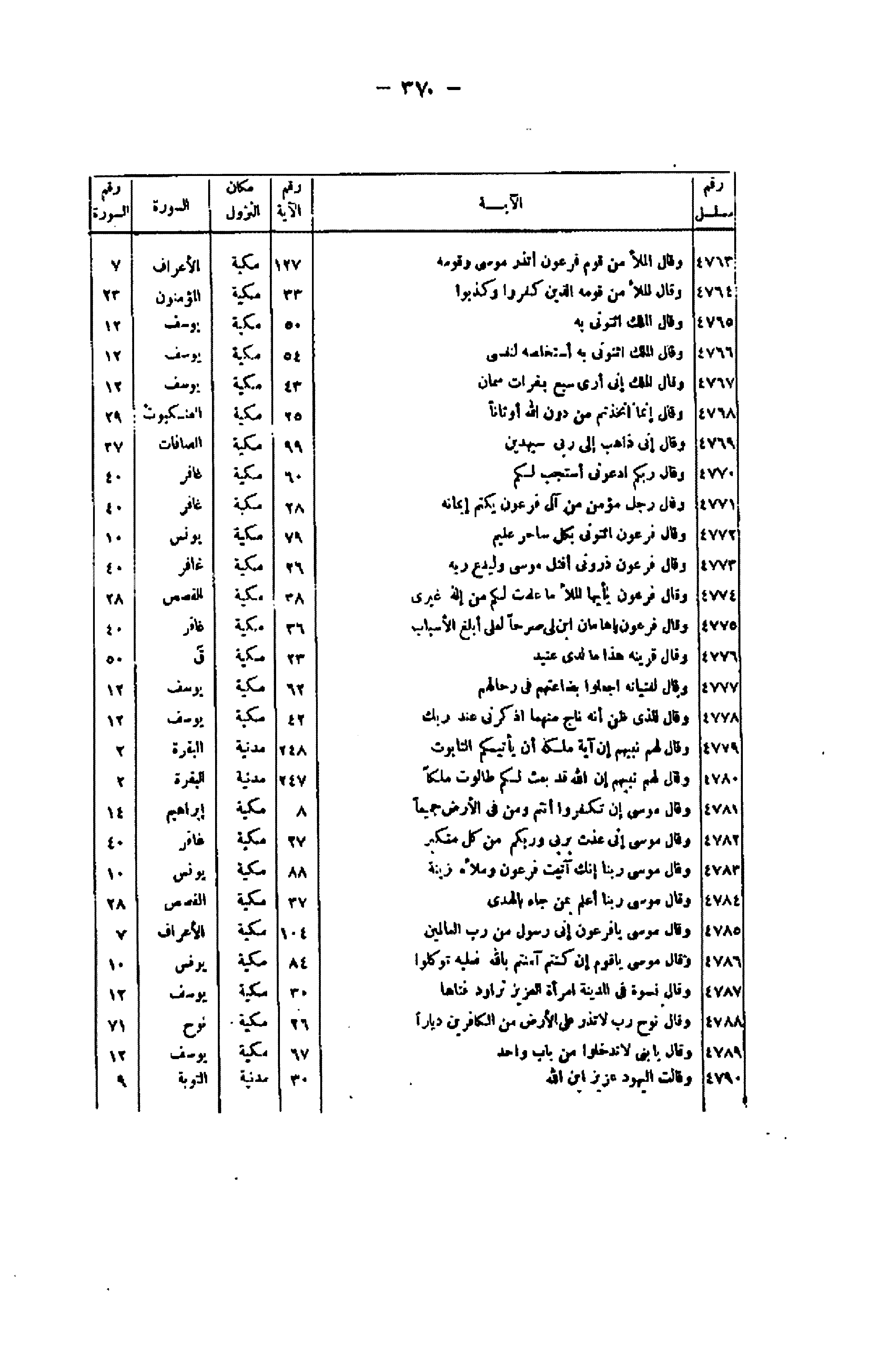 رقم مسلسل/ الآية/ رقم الآية/ مكان النزول/ السورة/ رقم السورة 4763/ وَقالَ الْمَلَأُ مِنْ قَوْمِ فِرْعَوْنَ أَتَذَرُ مُوسى وَقَوْمَهُ/ 127/ مكية/ الأعراف/ 7 4764/ وَقالَ الْمَلَأُ مِنْ قَوْمِهِ الَّذِينَ كَفَرُوا وَكَذَّبُوا/ 33/ مكية/ المؤمنون/ 23 4765/ وَقالَ الْمَلِكُ ائْتُونِي بِهِ/ 50/ مكية/ يوسف/ 12 4766/ وَقالَ الْمَلِكُ ائْتُونِي بِهِ أَسْتَخْلِصْهُ لِنَفْسِي/ 54/ مكية/ يوسف/ 12 4767/ وَقالَ الْمَلِكُ إِنِّي أَرى سَبْعَ بَقَراتٍ سِمانٍ/ 43/ مكية/ يوسف/ 12 4768/ وَقالَ إِنَّمَا اتَّخَذْتُمْ مِنْ دُونِ اللَّهِ أَوْثاناً/ 25/ مكية/ العنكبوت/ 29 4769/ وَقالَ إِنِّي ذاهِبٌ إِلى رَبِّي سَيَهْدِينِ/ 99/ مكية/ الصافات/ 37 4770/ وَقالَ رَبُّكُمُ ادْعُونِي أَسْتَجِبْ لَكُمْ/ 60/ مكية/ غافر/ 40 4771/ وَقالَ رَجُلٌ مُؤْمِنٌ مِنْ آلِ فِرْعَوْنَ يَكْتُمُ إِيمانَهُ/ 28/ مكية/ غافر/ 40 4772/ وَقالَ فِرْعَوْنُ ائْتُونِي بِكُلِّ ساحِرٍ عَلِيمٍ/ 79/ مكية/ يونس/ 10 4773/ وَقالَ فِرْعَوْنُ ذَرُونِي أَقْتُلْ مُوسى وَلْيَدْعُ رَبَّهُ/ 26/ مكية/ غافر/ 40 4774/ وَقالَ فِرْعَوْنُ يا أَيُّهَا الْمَلَأُ ما عَلِمْتُ لَكُمْ مِنْ إِلهٍ غَيْرِي/ 38/ مكية/ القصص/ 28 4775/ وَقالَ فِرْعَوْنُ يا هامانُ ابْنِ لِي صَرْحاً لَعَلِّي أَبْلُغُ الْأَسْبابَ/ 36/ مكية/ غافر/ 40 4776/ وَقالَ قَرِينُهُ هذا ما لَدَيَّ عَتِيدٌ/ 23/ مكية/ ق/ 50 4777/ وَقالَ لِفِتْيانِهِ اجْعَلُوا بِضاعَتَهُمْ فِي رِحالِهِمْ/ 62/ مكية/ يوسف/ 12 4778/ وَقالَ لِلَّذِي ظَنَّ أَنَّهُ ناجٍ مِنْهُمَا اذْكُرْنِي عِنْدَ رَبِّكَ/ 42/ مكية/ يوسف/ 12 4779/ وَقالَ لَهُمْ نَبِيُّهُمْ إِنَّ آيَةَ مُلْكِهِ أَنْ يَأْتِيَكُمُ التَّابُوتُ/ 248/ مدنية/ البقرة/ 2 4780/ وَقالَ لَهُمْ نَبِيُّهُمْ إِنَّ اللَّهَ قَدْ بَعَثَ لَكُمْ طالُوتَ مَلِكاً/ 247/ مدنية/ البقرة/ 2 4781/ وَقالَ مُوسى إِنْ تَكْفُرُوا أَنْتُمْ وَمَنْ فِي الْأَرْضِ جَمِيعاً/ 8/ مكية/ إبراهيم/ 14 4782/ وَقالَ مُوسى إِنِّي عُذْتُ بِرَبِّي وَرَبِّكُمْ مِنْ كُلِّ مُتَكَبِّرٍ/ 27/ مكية/ غافر/ 40 4783/ وَقالَ مُوسى رَبَّنا إِنَّكَ آتَيْتَ فِرْعَوْنَ وَمَلَأَهُ زِينَةً/ 88/ مكية/ يونس/ 10 4784/ وَقالَ مُوسى رَبِّي أَعْلَمُ بِمَنْ جاءَ بِالْهُدى / 37/ مكية/ القصص/ 28 4785/ وَقالَ مُوسى يا فِرْعَوْنُ إِنِّي رَسُولٌ مِنْ رَبِّ الْعالَمِينَ/ 104/ مكية/ الأعراف/ 7 4786/ وَقالَ مُوسى يا قَوْمِ إِنْ كُنْتُمْ آمَنْتُمْ بِاللَّهِ فَعَلَيْهِ تَوَكَّلُوا/ 84/ مكية/ يونس/ 10 4787/ وَقالَ نِسْوَةٌ فِي الْمَدِينَةِ امْرَأَتُ الْعَزِيزِ تُراوِدُ فَتاها/ 30/ مكية/ يوسف/ 12 4788/ وَقالَ نُوحٌ رَبِّ لا تَذَرْ عَلَى الْأَرْضِ مِنَ الْكافِرِينَ دَيَّاراً/ 26/ مكية/ نوح/ 71 4789/ وَقالَ يا بَنِيَّ لا تَدْخُلُوا مِنْ بابٍ واحِدٍ/ 67/ مكية/ يوسف/ 12 4790/ وَقالَتِ الْيَهُودُ عُزَيْرٌ ابْنُ اللَّهِ/ 30/ مدنية/ التوبة/ 9