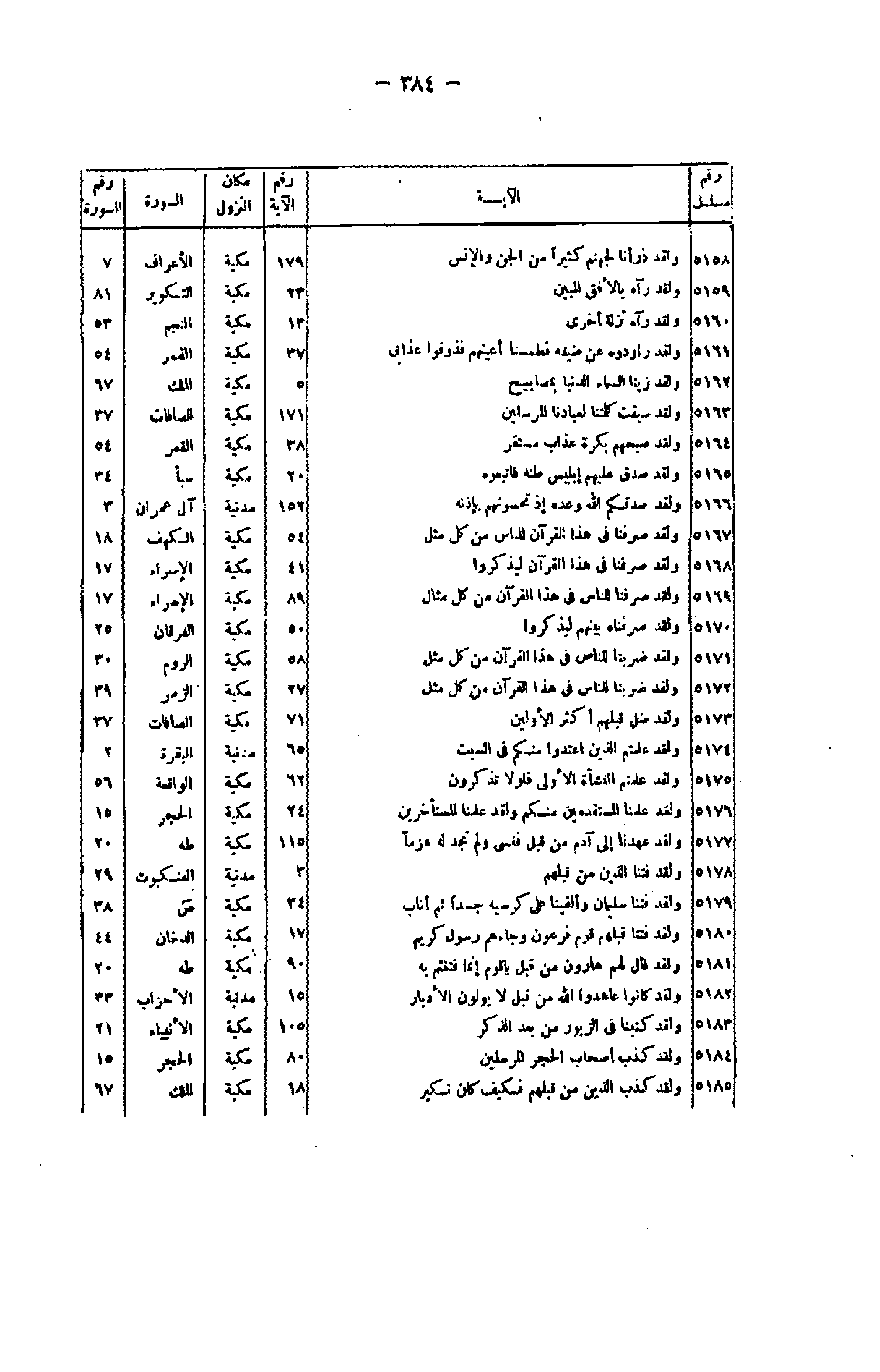 رقم مسلسل/ الآية/ رقم الآية/ مكان النزول/ السورة/ رقم السورة 5158/ وَلَقَدْ ذَرَأْنا لِجَهَنَّمَ كَثِيراً مِنَ الْجِنِّ وَالْإِنْسِ/ 179/ مكية/ الأعراف/ 7 5159/ وَلَقَدْ رَآهُ بِالْأُفُقِ الْمُبِينِ/ 23/ مكية/ التكوير/ 81 5160/ وَلَقَدْ رَآهُ نَزْلَةً أُخْرى / 13/ مكية/ النجم/ 53 5161/ وَلَقَدْ راوَدُوهُ عَنْ ضَيْفِهِ فَطَمَسْنا أَعْيُنَهُمْ فَذُوقُوا عَذابِي/ 37/ مكية/ القمر/ 54 5162/ وَلَقَدْ زَيَّنَّا السَّماءَ الدُّنْيا بِمَصابِيحَ/ 5/ مكية/ الملك/ 67 5163/ وَلَقَدْ سَبَقَتْ كَلِمَتُنا لِعِبادِنَا الْمُرْسَلِينَ/ 171/ مكية/ الصافات/ 37 5164/ وَلَقَدْ صَبَّحَهُمْ بُكْرَةً عَذابٌ مُسْتَقِرٌّ/ 38/ مكية/ القمر/ 54 5165/ وَلَقَدْ صَدَّقَ عَلَيْهِمْ إِبْلِيسُ ظَنَّهُ فَاتَّبَعُوهُ/ 20/ مكية