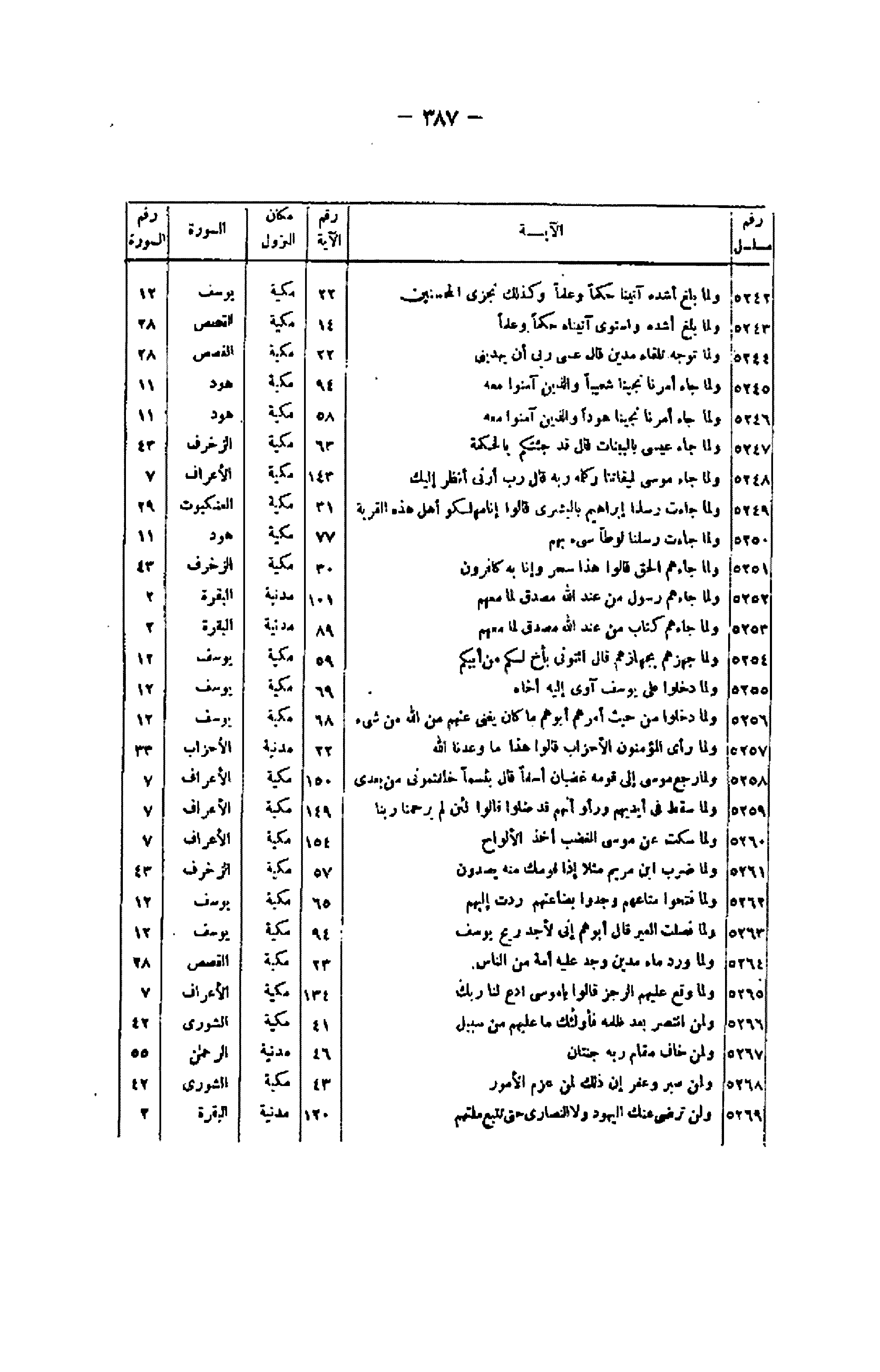 رقم مسلسل/ الآية/ رقم الآية/ مكان النزول/ السورة/ رقم السورة 5242/ وَلَمَّا بَلَغَ أَشُدَّهُ آتَيْناهُ حُكْماً وَعِلْماً وَكَذلِكَ نَجْزِي الْمُحْسِنِينَ/ 22/ مكية/ يوسف/ 12 5243/ وَلَمَّا بَلَغَ أَشُدَّهُ وَاسْتَوى آتَيْناهُ حُكْماً وَعِلْماً/ 14/ مكية/ القصص/ 28 5244/ وَلَمَّا تَوَجَّهَ تِلْقاءَ مَدْيَنَ قالَ عَسى رَبِّي أَنْ يَهْدِيَنِي/ 22/ مكية/ القصص/ 28 5245/ وَلَمَّا جاءَ أَمْرُنا نَجَّيْنا شُعَيْباً وَالَّذِينَ آمَنُوا مَعَهُ/ 94/ مكية/ هود/ 11 5246/ وَلَمَّا جاءَ أَمْرُنا نَجَّيْنا هُوداً وَالَّذِينَ آمَنُوا مَعَهُ/ 58/ مكية/ هود/ 11 5247/ وَلَمَّا جاءَ عِيسى بِالْبَيِّناتِ قالَ قَدْ جِئْتُكُمْ بِالْحِكْمَةِ/ 63/ مكية/ الزخرف/ 43 5248/ وَلَمَّا جاءَ مُوسى لِمِيقاتِنا وَكَلَّمَهُ رَبُّهُ قالَ رَبِّ أَرِنِي أَنْظُرْ إِلَيْكَ/ 143/ مكية/ الأعراف/ 7 5249/ وَلَمَّا جاءَتْ رُسُلُنا إِبْراهِيمَ بِالْبُشْرى قالُوا إِنَّا مُهْلِكُوا أَهْلِ هذِهِ الْقَرْيَةِ/ 31/ مكية/ العنكبوت/ 29 5250/ وَلَمَّا جاءَتْ رُسُلُنا لُوطاً سِيءَ بِهِمْ/ 77/ مكية/ هود/ 11 5251/ وَلَمَّا جاءَهُمُ الْحَقُّ قالُوا هذا سِحْرٌ وَإِنَّا بِهِ كافِرُونَ/ 30/ مكية/ الزخرف/ 43 5252/ وَلَمَّا جاءَهُمْ رَسُولٌ مِنْ عِنْدِ اللَّهِ مُصَدِّقٌ لِما مَعَهُمْ/ 101/ مدنية/ البقرة/ 2 5253/ وَلَمَّا جاءَهُمْ كِتابٌ مِنْ عِنْدِ اللَّهِ مُصَدِّقٌ لِما مَعَهُمْ/ 89/ مدنية/ البقرة/ 2 5254/ وَلَمَّا جَهَّزَهُمْ بِجَهازِهِمْ قالَ ائْتُونِي بِأَخٍ لَكُمْ مِنْ أَبِيكُمْ/ 59/ مكية/ يوسف/ 12 5255/ وَلَمَّا دَخَلُوا عَلى يُوسُفَ آوى إِلَيْهِ أَخاهُ/ 69/ مكية/ يوسف/ 12 5256/ وَلَمَّا دَخَلُوا مِنْ حَيْثُ أَمَرَهُمْ أَبُوهُمْ ما كانَ يُغْنِي عَنْهُمْ مِنَ اللَّهِ مِنْ شَيْءٍ/ 68/ مكية/ يوسف/ 12 5257/ وَلَمَّا رَأَ الْمُؤْمِنُونَ الْأَحْزابَ قالُوا هذا ما وَعَدَنَا اللَّهُ/ 22/ مدنية/ الأحزاب/ 33 5258/ وَلَمَّا رَجَعَ مُوسى إِلى قَوْمِهِ غَضْبانَ أَسِفاً قالَ بِئْسَما خَلَفْتُمُونِي مِنْ بَعْدِي/ 150/ مكية/ الأعراف/ 7 5259/ وَلَمَّا سُقِطَ فِي أَيْدِيهِمْ وَرَأَوْا أَنَّهُمْ قَدْ ضَلُّوا قالُوا لَئِنْ لَمْ يَرْحَمْنا رَبُّنا/ 149/ مكية/ الأعراف/ 7 5260/ وَلَمَّا سَكَتَ عَنْ مُوسَى الْغَضَبُ أَخَذَ الْأَلْواحَ/ 154/ مكية/ الأعراف/ 7 5261/ وَلَمَّا ضُرِبَ ابْنُ مَرْيَمَ مَثَلًا إِذا قَوْمُكَ مِنْهُ يَصِدُّونَ/ 57/ مكية/ الزخرف/ 43 5262/ وَلَمَّا فَتَحُوا مَتاعَهُمْ وَجَدُوا بِضاعَتَهُمْ رُدَّتْ إِلَيْهِمْ/ 65/ مكية/ يوسف/ 12 5263/ وَلَمَّا فَصَلَتِ الْعِيرُ قالَ أَبُوهُمْ إِنِّي لَأَجِدُ رِيحَ يُوسُفَ/ 94/ مكية/ يوسف/ 12 5264/ وَلَمَّا وَرَدَ ماءَ مَدْيَنَ وَجَدَ عَلَيْهِ أُمَّةً مِنَ النَّاسِ/ 23/ مكية/ القصص/ 28 5265/ وَلَمَّا وَقَعَ عَلَيْهِمُ الرِّجْزُ قالُوا يا مُوسَى ادْعُ لَنا رَبَّكَ/ 134/ مكية/ الأعراف/ 7 5266/ وَلَمَنِ انْتَصَرَ بَعْدَ ظُلْمِهِ فَأُولئِكَ ما عَلَيْهِمْ مِنْ سَبِيلٍ/ 41/ مكية/ الشورى/ 42 5267/ وَلِمَنْ خافَ مَقامَ رَبِّهِ جَنَّتانِ/ 46/ مدنية/ الرحمن/ 55 5268/ وَلَمَنْ صَبَرَ وَغَفَرَ إِنَّ ذلِكَ لَمِنْ عَزْمِ الْأُمُورِ/ 43/ مكية/ الشورى/ 42 5269/ وَلَنْ تَرْضى عَنْكَ الْيَهُودُ وَلَا النَّصارى حَتَّى تَتَّبِعَ مِلَّتَهُمْ/ 120/ مدنية/ البقرة/ 2