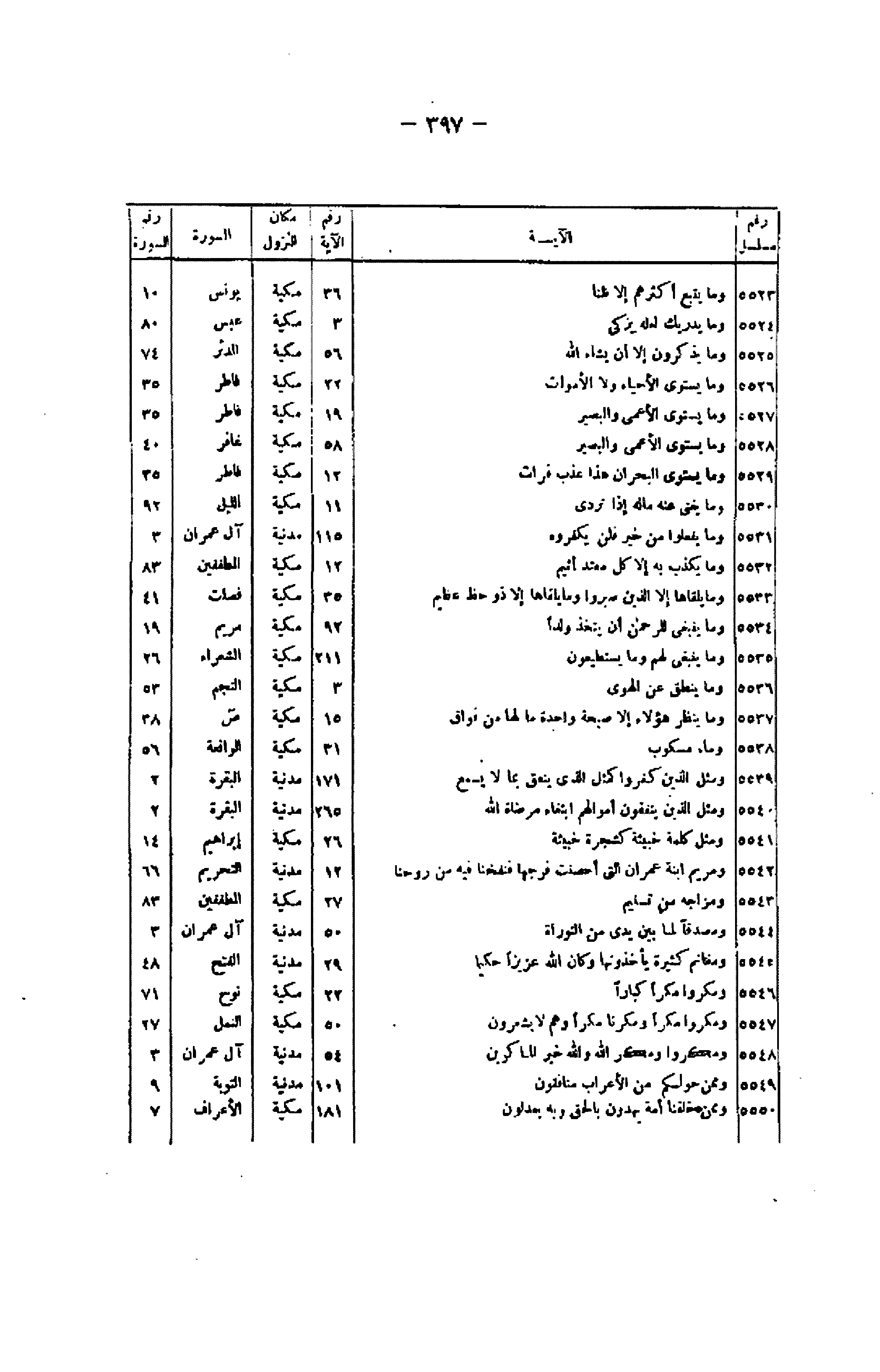 رقم مسلسل/ الآية/ رقم الآية/ مكان النزول/ السورة/ رقم السورة 5523/ وَما يَتَّبِعُ أَكْثَرُهُمْ إِلَّا ظَنًّا/ 36/ مكية/ يونس/ 10 5524/ وَما يُدْرِيكَ لَعَلَّهُ يَزَّكَّى/ 3/ مكية/ عبس/ 80 5525/ وَما يَذْكُرُونَ إِلَّا أَنْ يَشاءَ اللَّهُ/ 56/ مكية/ المدثر/ 74 5526/ وَما يَسْتَوِي الْأَحْياءُ وَلَا الْأَمْواتُ/ 22/ مكية/ فاطر/ 35 5527/ وَما يَسْتَوِي الْأَعْمى وَالْبَصِيرُ/ 19/ مكية/ فاطر/ 35 5528/ وَما يَسْتَوِي الْأَعْمى وَالْبَصِيرُ/ 58/ مكية/ غافر/ 40 5529/ وَما يَسْتَوِي الْبَحْرانِ هذا عَذْبٌ فُراتٌ/ 12/ مكية/ فاطر/ 35 5530/ وَما يُغْنِي عَنْهُ مالُهُ إِذا تَرَدَّى/ 11/ مكية/ الليل/ 92 5531/ وَما يَفْعَلُوا مِنْ خَيْرٍ فَلَنْ يُكْفَرُوهُ/ 115/ مدنية/ آل عمران/ 3 5532/ وَما يُكَذِّبُ بِهِ إِلَّا كُلُّ مُعْتَدٍ أَثِيمٍ/ 12/ مكية/ المطففين/ 83 5533/ وَما يُلَقَّاها إِلَّا الَّذِينَ صَبَرُوا وَما يُلَقَّاها إِلَّا ذُو حَظٍّ عَظِيمٍ/ 35/ مكية/ فصلت/ 41 5534/ وَما يَنْبَغِي لِلرَّحْمنِ أَنْ يَتَّخِذَ وَلَداً/ 92/ مكية/ مريم/ 19 5535/ وَما يَنْبَغِي لَهُمْ وَما يَسْتَطِيعُونَ/ 211/ مكية/ الشعراء/ 26 5536/ وَما يَنْطِقُ عَنِ الْهَوى / 3/ مكية/ النجم/ 53 5537/ وَما يَنْظُرُ هؤُلاءِ إِلَّا صَيْحَةً واحِدَةً ما لَها مِنْ فَواقٍ/ 15/ مكية/ ص/ 38 5538/ وَماءٍ مَسْكُوبٍ/ 31/ مكية/ الواقعة/ 56 5539/ وَمَثَلُ الَّذِينَ كَفَرُوا كَمَثَلِ الَّذِي يَنْعِقُ بِما لا يَسْمَعُ/ 171/ مدنية/ البقرة/ 2 5540/ وَمَثَلُ الَّذِينَ يُنْفِقُونَ أَمْوالَهُمُ ابْتِغاءَ مَرْضاتِ اللَّهِ/ 265/ مدنية/ البقرة/ 2 5541/ وَمَثَلُ كَلِمَةٍ خَبِيثَةٍ كَشَجَرَةٍ خَبِيثَةٍ/ 26/ مكية/ إبراهيم/ 14 5542/ وَمَرْيَمَ ابْنَتَ عِمْرانَ الَّتِي أَحْصَنَتْ فَرْجَها فَنَفَخْنا فِيهِ مِنْ رُوحِنا/ 12/ مدنية/ التحريم/ 66 5543/ وَمِزاجُهُ مِنْ تَسْنِيمٍ/ 27/ مكية/ المطففين/ 83 5544/ وَمُصَدِّقاً لِما بَيْنَ يَدَيَّ مِنَ التَّوْراةِ/ 50/ مدنية/ آل عمران