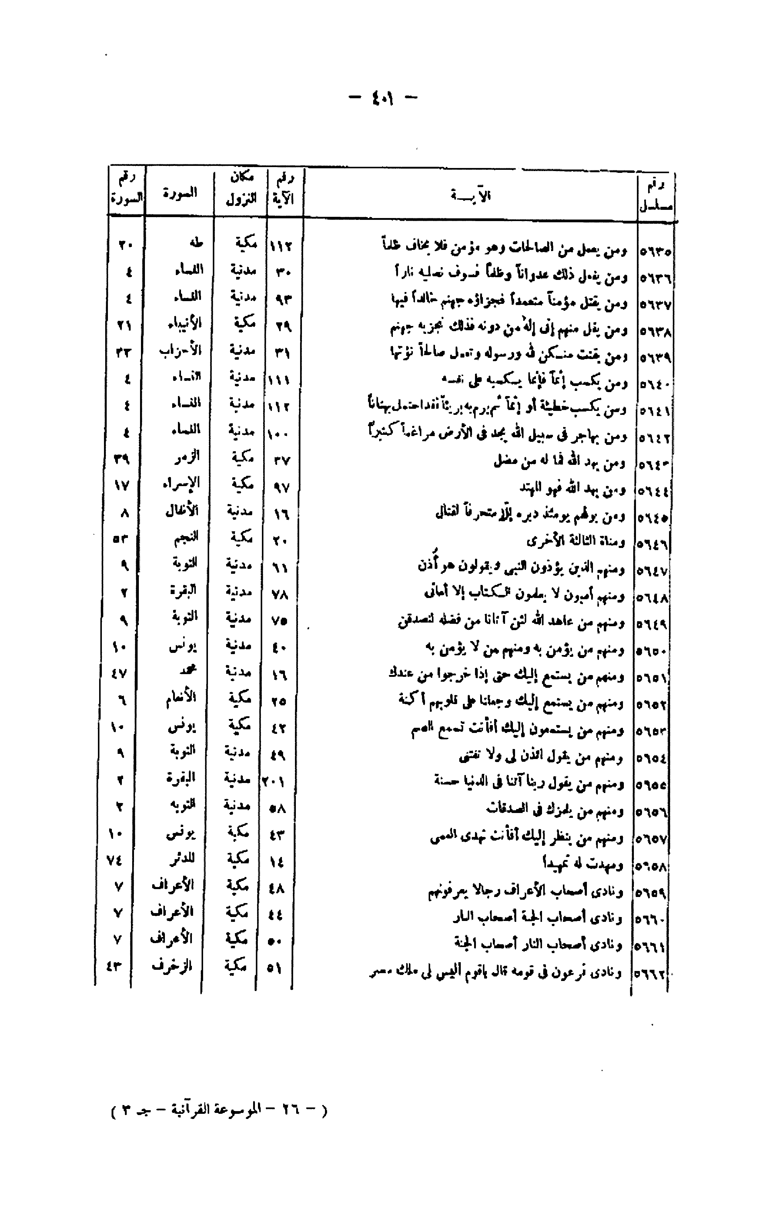 / 112/ مدنية/ النساء/ 4 5642/ وَمَنْ يُهاجِرْ فِي سَبِيلِ اللَّهِ يَجِدْ فِي الْأَرْضِ مُراغَماً كَثِيراً/ 100/ مدنية/ النساء/ 4 5643/ وَمَنْ يَهْدِ اللَّهُ فَما لَهُ مِنْ مُضِلٍّ/ 37/ مكية/ الزمر/ 39 5644/ وَمَنْ يَهْدِ اللَّهُ فَهُوَ الْمُهْتَدِ/ 97/ مكية/ الإسراء/ 17 5645/ وَمَنْ يُوَلِّهِمْ يَوْمَئِذٍ دُبُرَهُ إِلَّا مُتَحَرِّفاً لِقِتالٍ/ 16/ مدنية/ الأنفال/ 8 5646/ وَمَناةَ الثَّالِثَةَ الْأُخْرى / 20/ مكية/ النجم/ 53 5647/ وَمِنْهُمُ الَّذِينَ يُؤْذُونَ النَّبِيَّ وَيَقُولُونَ هُوَ أُذُنٌ/ 61/ مدنية/ التوبة/ 9 5648/ وَمِنْهُمْ أُمِّيُّونَ لا يَعْلَمُونَ الْكِتابَ إِلَّا أَمانِيَّ/ 78/ مدنية/ البقرة/ 2 5649/ وَمِنْهُمْ مَنْ عاهَدَ اللَّهَ لَئِنْ آتانا مِنْ فَضْلِهِ لَنَصَّدَّقَنَّ/ 75/ مدنية/ التوبة/ 9 5650/ وَمِنْهُمْ مَنْ يُؤْمِنُ بِهِ وَمِنْهُمْ مَنْ لا يُؤْمِنُ بِهِ/ 40/ مدنية/ يونس/ 10 5651/ وَمِنْهُمْ مَنْ يَسْتَمِعُ إِلَيْكَ حَتَّى إِذا خَرَجُوا مِنْ عِنْدِكَ/ 16/ مدنية/ محمد/ 47 5652/ وَمِنْهُمْ مَنْ يَسْتَمِعُ إِلَيْكَ وَجَعَلْنا عَلى قُلُوبِهِمْ أَكِنَّةً/ 25/ مكية/ الأنعام/ 6 5653/ وَمِنْهُمْ مَنْ يَسْتَمِعُونَ إِلَيْكَ أَفَأَنْتَ تُسْمِعُ الصُّمَّ/ 42/ مكية/ يونس/ 10 5654/ وَمِنْهُمْ مَنْ يَقُولُ ائْذَنْ لِي وَلا تَفْتِنِّي/ 49/ مدنية/ التوبة/ 9 5655/ وَمِنْهُمْ مَنْ يَقُولُ رَبَّنا آتِنا فِي الدُّنْيا حَسَنَةً/ 201/ مدنية/ البقرة/ 2 5656/ وَمِنْهُمْ مَنْ يَلْمِزُكَ فِي الصَّدَقاتِ/ 58/ مدنية/ التوبة/ 2 5657/ وَمِنْهُمْ مَنْ يَنْظُرُ إِلَيْكَ أَفَأَنْتَ تَهْدِي الْعُمْيَ/ 43/ مكية/ يونس/ 10 5658/ وَمَهَّدْتُ لَهُ تَمْهِيداً/ 14/ مكية/ المدثر/ 74 5659/ وَنادى أَصْحابُ الْأَعْرافِ رِجالًا يَعْرِفُونَهُمْ/ 48/ مكية/ الأعراف/ 7 5660/ وَنادى أَصْحابُ الْجَنَّةِ أَصْحابَ النَّارِ/ 44/ مكية/ الأعراف/ 7 5661/ وَنادى أَصْحابُ النَّارِ أَصْحابَ الْجَنَّةِ/ 50/ مكية/ الأعراف/ 7 5662/ وَنادى فِرْعَوْنُ فِي قَوْمِهِ قالَ يا قَوْمِ أَلَيْسَ لِي مُلْكُ مِصْرَ/ 51/ مكية/ الزخرف/ 43 (- 26- الموسوعة القرآنية- ج 3)
