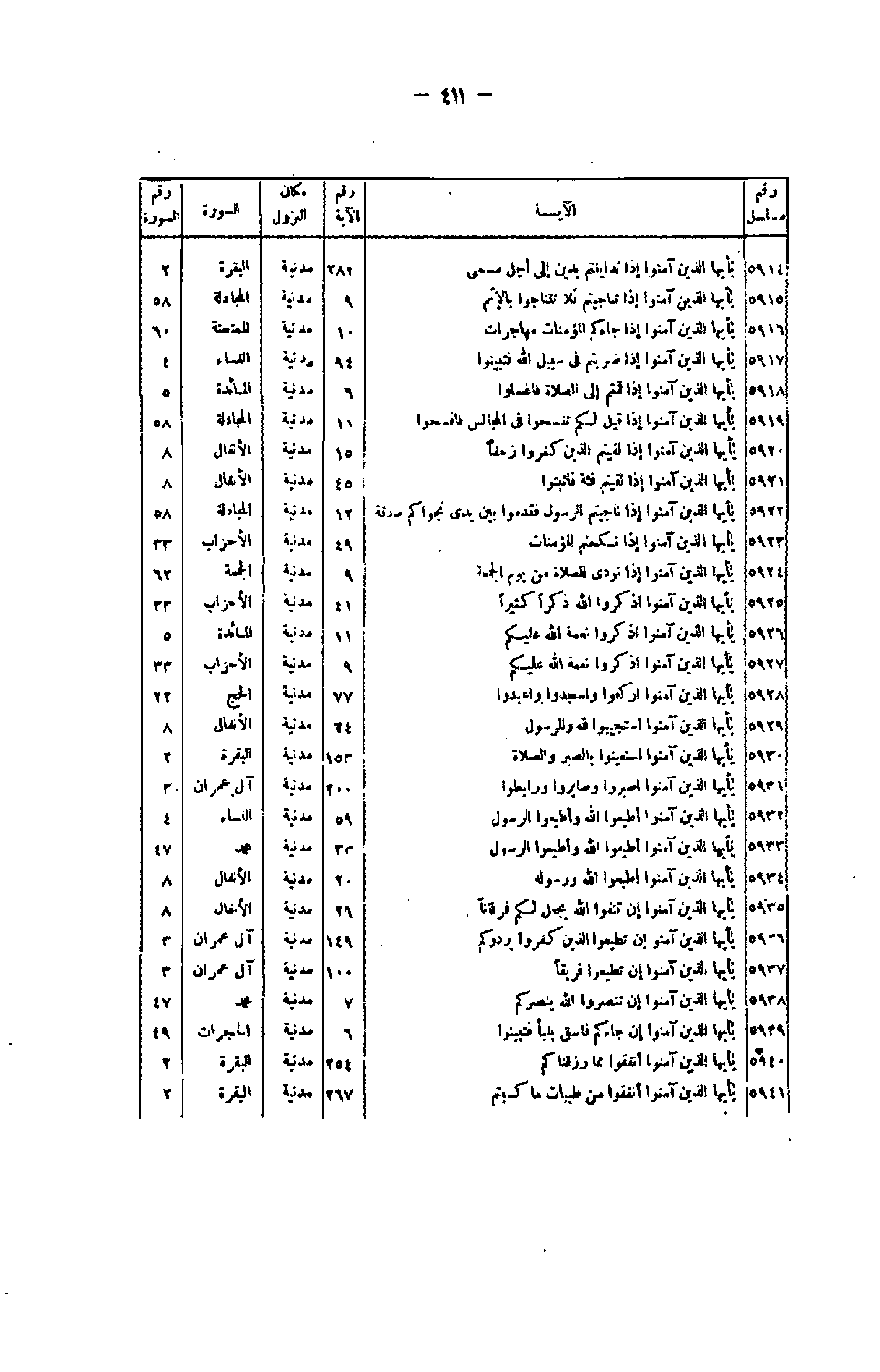 رقم مسلسل/ الآية/ رقم الآية/ مكان النزول/ السورة/ رقم السورة 5914/ يا أَيُّهَا الَّذِينَ آمَنُوا إِذا تَدايَنْتُمْ بِدَيْنٍ إِلى أَجَلٍ مُسَمًّى/ 282/ مدنية/ البقرة/ 2 5915/ يا أَيُّهَا الَّذِينَ آمَنُوا إِذا تَناجَيْتُمْ فَلا تَتَناجَوْا بِالْإِثْمِ/ 9/ مدنية/ المجادلة/ 58 5916/ يا أَيُّهَا الَّذِينَ آمَنُوا إِذا جاءَكُمُ الْمُؤْمِناتُ مُهاجِراتٍ/ 10/ مدنية/ الممتحنة/ 60 5917/ يا أَيُّهَا الَّذِينَ آمَنُوا إِذا ضَرَبْتُمْ فِي سَبِيلِ اللَّهِ فَتَبَيَّنُوا/ 94/ مدنية/ النساء/ 4 5918/ يا أَيُّهَا الَّذِينَ آمَنُوا إِذا قُمْتُمْ إِلَى الصَّلاةِ فَاغْسِلُوا/ 6/ مدنية/ المائدة/ 5 5919/ يا أَيُّهَا الَّذِينَ آمَنُوا إِذا قِيلَ لَكُمْ تَفَسَّحُوا فِي الْمَجالِسِ فَافْسَحُوا/ 11/ مدنية/ المجادلة/ 58 5920/ يا أَيُّهَا الَّذِينَ آمَنُوا إِذا لَقِيتُمُ الَّذِينَ كَفَرُوا زَحْفاً/ 15/ مدنية/ الأنفال/ 8 5921/ يا أَيُّهَا الَّذِينَ آمَنُوا إِذا لَقِيتُمْ فِئَةً فَاثْبُتُوا/ 45/ مدنية/ الأنفال/ 8 5922/ يا أَيُّهَا الَّذِينَ آمَنُوا إِذا ناجَيْتُمُ الرَّسُولَ فَقَدِّمُوا بَيْنَ يَدَيْ نَجْواكُمْ صَدَقَةً/ 12/ مدنية/ المجادلة/ 58 5923/ يا أَيُّهَا الَّذِينَ آمَنُوا إِذا نَكَحْتُمُ الْمُؤْمِناتِ/ 49/ مدنية/ الأحزاب/ 33 5924/ يا أَيُّهَا الَّذِينَ آمَنُوا إِذا نُودِيَ لِلصَّلاةِ مِنْ يَوْمِ الْجُمُعَةِ/ 9/ مدنية/ الجمعة/ 62 5925/ يا أَيُّهَا الَّذِينَ آمَنُوا اذْكُرُوا اللَّهَ ذِكْراً كَثِيراً/ 41/ مدنية/ الأحزاب/ 33 5926/ يا أَيُّهَا الَّذِينَ آمَنُوا اذْكُرُوا نِعْمَتَ اللَّهِ عَلَيْكُمْ/ 11/ مدنية/ المائدة/ 5 5927/ يا أَيُّهَا الَّذِينَ آمَنُوا اذْكُرُوا نِعْمَةَ اللَّهِ عَلَيْكُمْ/ 9/ مدنية/ الأحزاب/ 33 5928/ يا أَيُّهَا الَّذِينَ آمَنُوا ارْكَعُوا وَاسْجُدُوا وَاعْبُدُوا/ 77/ مدنية/ الحج/ 22 5929/ يا أَيُّهَا الَّذِينَ آمَنُوا اسْتَجِيبُوا لِلَّهِ وَلِلرَّسُولِ/ 24/ مدنية/ الأنفال/ 8 5930/ يا أَيُّهَا الَّذِينَ آمَنُوا اسْتَعِينُوا بِالصَّبْرِ وَالصَّلاةِ/ 153/ مدنية/ البقرة/ 2 5931/ يا أَيُّهَا الَّذِينَ آمَنُوا اصْبِرُوا وَصابِرُوا وَرابِطُوا/ 200/ مدنية/ آل عمران/ 3 5932/ يا أَيُّهَا الَّذِينَ آمَنُوا أَطِيعُوا اللَّهَ وَأَطِيعُوا الرَّسُولَ/ 59/ مدنية/ النساء/ 4 5933/ يا أَيُّهَا الَّذِينَ آمَنُوا أَطِيعُوا اللَّهَ وَأَطِيعُوا الرَّسُولَ/ 33/ مدنية/ محمد/ 47 5934/ يا أَيُّهَا الَّذِينَ آمَنُوا أَطِيعُوا اللَّهَ وَرَسُولَهُ/ 20/ مدنية/ الأنفال/ 8 5935/ يا أَيُّهَا الَّذِينَ آمَنُوا إِنْ تَتَّقُوا اللَّهَ يَجْعَلْ لَكُمْ فُرْقاناً/ 29/ مدنية/ الأنفال/ 8 5936/ يا أَيُّهَا الَّذِينَ آمَنُوا إِنْ تُطِيعُوا الَّذِينَ كَفَرُوا يَرُدُّوكُمْ/ 149/ مدنية/ آل عمران/ 3 5937/ يا أَيُّهَا الَّذِينَ آمَنُوا إِنْ تُطِيعُوا فَرِيقاً/ 100/ مدنية/ آل عمران/ 3 5938/ يا أَيُّهَا الَّذِينَ آمَنُوا إِنْ تَنْصُرُوا اللَّهَ يَنْصُرْكُمْ/ 7/ مدنية/ محمد/ 47 5939/ يا أَيُّهَا الَّذِينَ آمَنُوا إِنْ جاءَكُمْ فاسِقٌ بِنَبَإٍ فَتَبَيَّنُوا/ 6/ مدنية/ الحجرات/ 49 5940/ يا أَيُّهَا الَّذِينَ آمَنُوا أَنْفِقُوا مِمَّا رَزَقْناكُمْ/ 254/ مدنية/ البقرة/ 2 5941/ يا أَيُّهَا الَّذِينَ آمَنُوا أَنْفِقُوا مِنْ طَيِّباتِ ما كَسَبْتُمْ/ 267/ مدنية/ البقرة/ 2