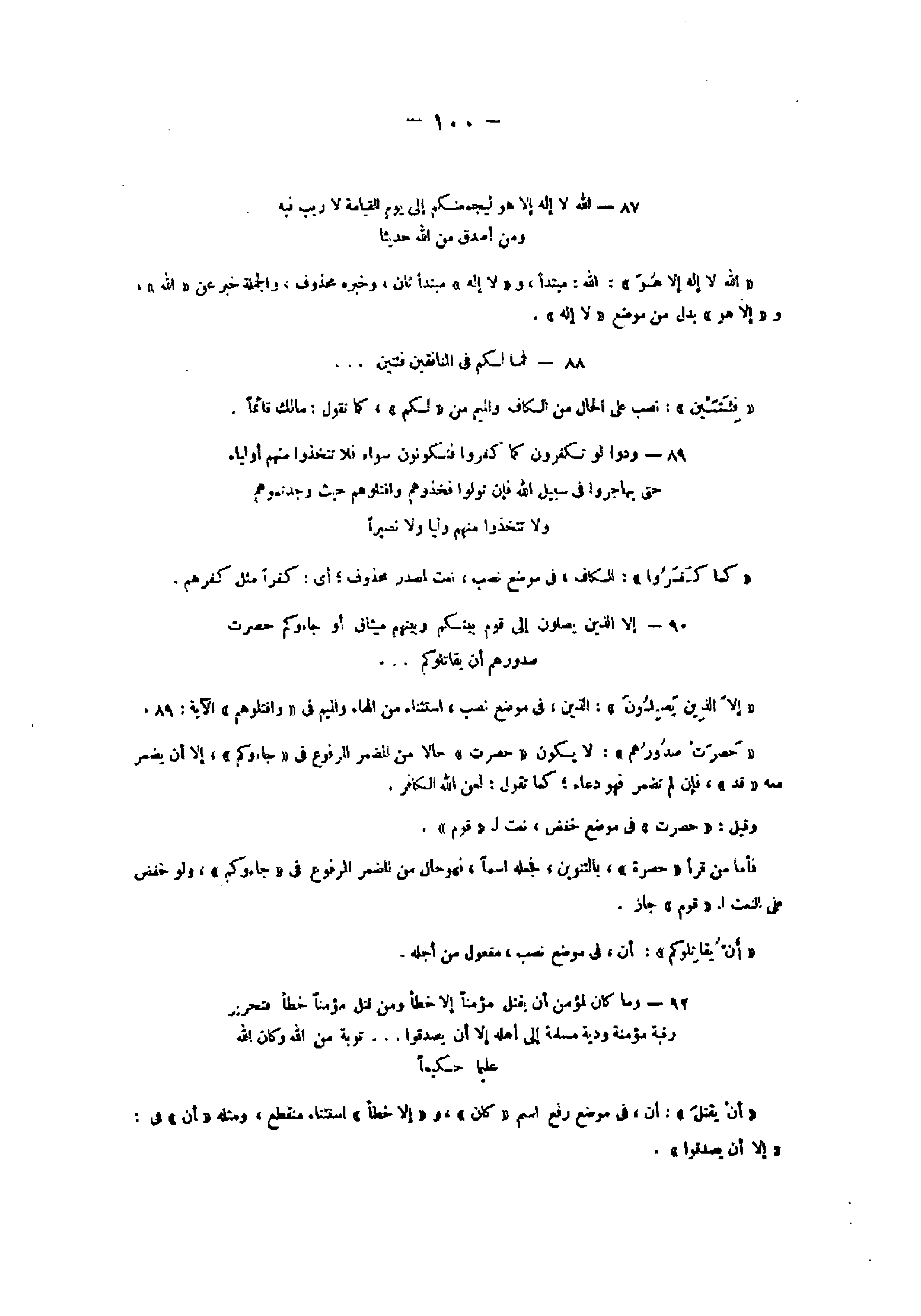 92- وَما كانَ لِمُؤْمِنٍ أَنْ يَقْتُلَ مُؤْمِناً إِلَّا خَطَأً وَمَنْ قَتَلَ مُؤْمِناً خَطَأً فَتَحْرِيرُ رَقَبَةٍ مُؤْمِنَةٍ وَدِيَةٌ مُسَلَّمَةٌ إِلى أَهْلِهِ إِلَّا أَنْ يَصَّدَّقُوا ... تَوْبَةً مِنَ اللَّهِ وَكانَ اللَّهُ عَلِيماً حَكِيماً «أن يقتل» : أن، فى موضع رفع اسم «كان» ، و «إلا خطأ» استثناء منقطع، ومثله «أن» فى: