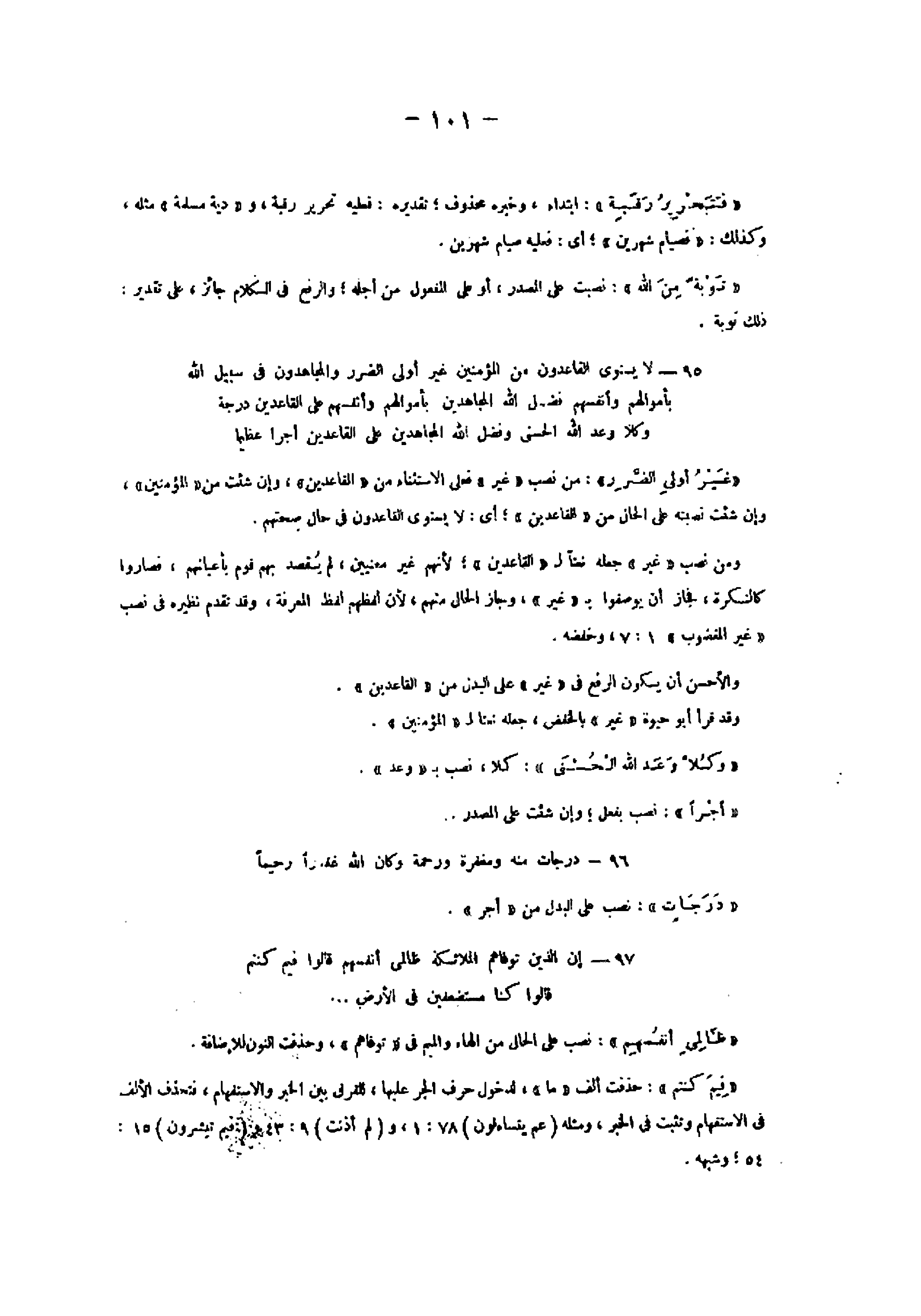 95- لا يَسْتَوِي الْقاعِدُونَ مِنَ الْمُؤْمِنِينَ غَيْرُ أُولِي الضَّرَرِ وَالْمُجاهِدُونَ فِي سَبِيلِ اللَّهِ بِأَمْوالِهِمْ وَأَنْفُسِهِمْ فَضَّلَ اللَّهُ الْمُجاهِدِينَ بِأَمْوالِهِمْ وَأَنْفُسِهِمْ عَلَى الْقاعِدِينَ دَرَجَةً وَكُلًّا وَعَدَ اللَّهُ الْحُسْنى وَفَضَّلَ اللَّهُ الْمُجاهِدِينَ عَلَى الْقاعِدِينَ أَجْراً عَظِيماً «غير أولى الضّرر» : من نصب «غير» فعلى الاستثناء من «القاعدين» ، وإن شئت من «المؤمنين» ، وإن شئت نصبته على الحال من «القاعدين» أي: لا يستوى القاعدون فى حال صحتهم.