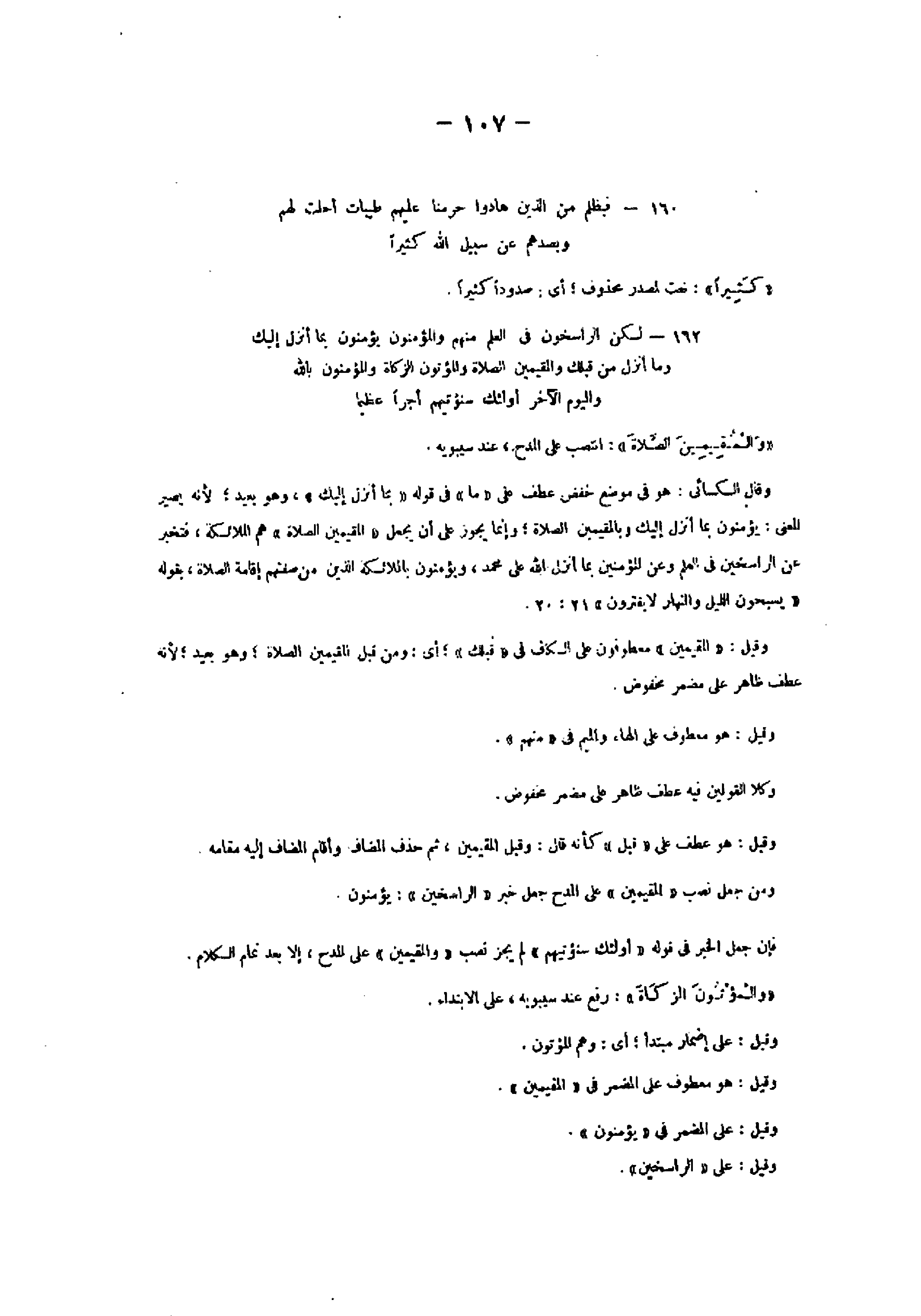 162- لكِنِ الرَّاسِخُونَ فِي الْعِلْمِ مِنْهُمْ وَالْمُؤْمِنُونَ يُؤْمِنُونَ بِما أُنْزِلَ إِلَيْكَ وَما أُنْزِلَ مِنْ قَبْلِكَ وَالْمُقِيمِينَ الصَّلاةَ وَالْمُؤْتُونَ الزَّكاةَ وَالْمُؤْمِنُونَ بِاللَّهِ وَالْيَوْمِ الْآخِرِ أُولئِكَ سَنُؤْتِيهِمْ أَجْراً عَظِيماً «والمقيمين الصّلاة» : انتصب على المدح، عند سيبويه.