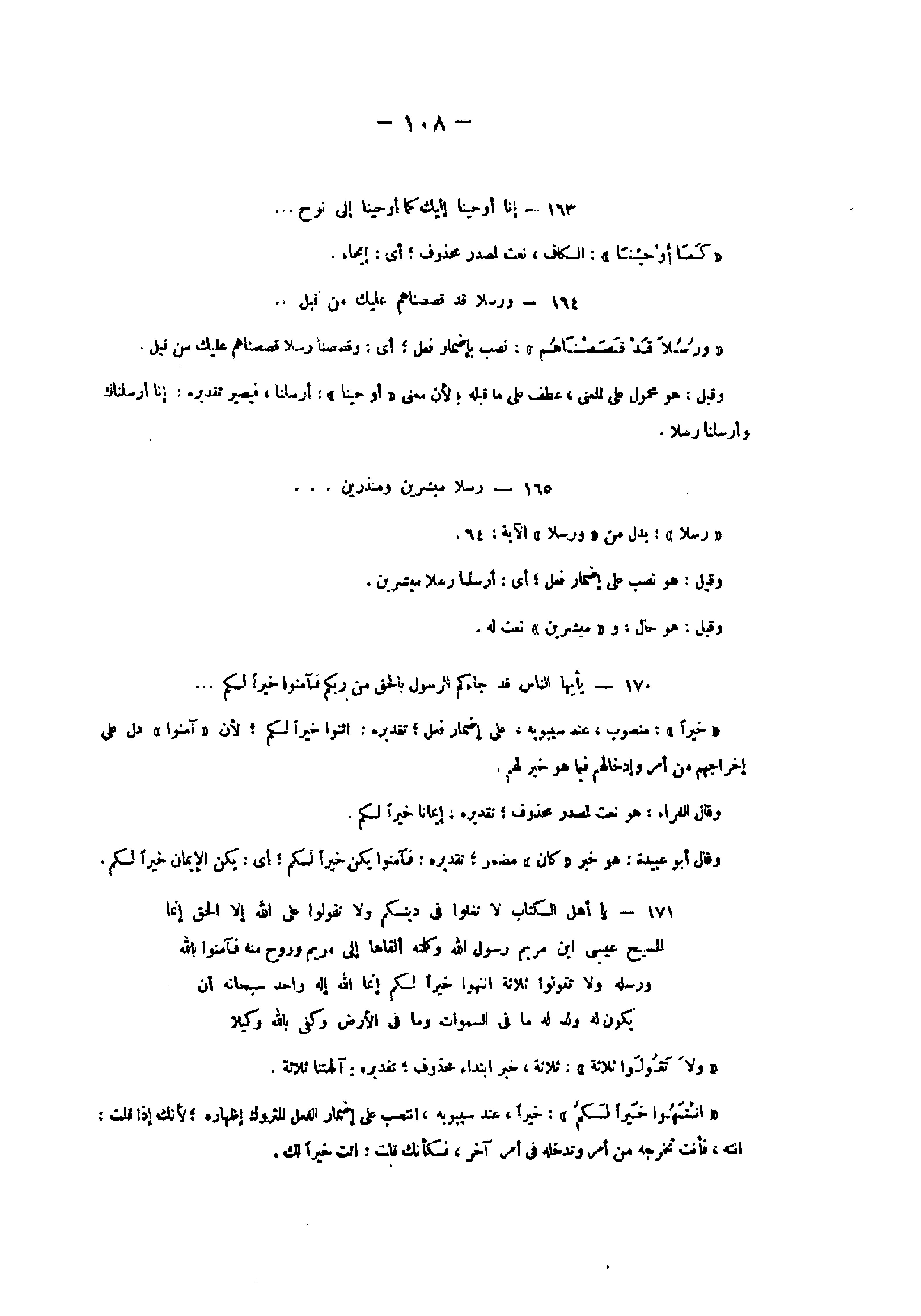 «انتهوا خيرا لكم» : خيرا، عند سيبويه، انتصب على إضمار الفعل المتروك إظهاره لأنك إذا قلت: