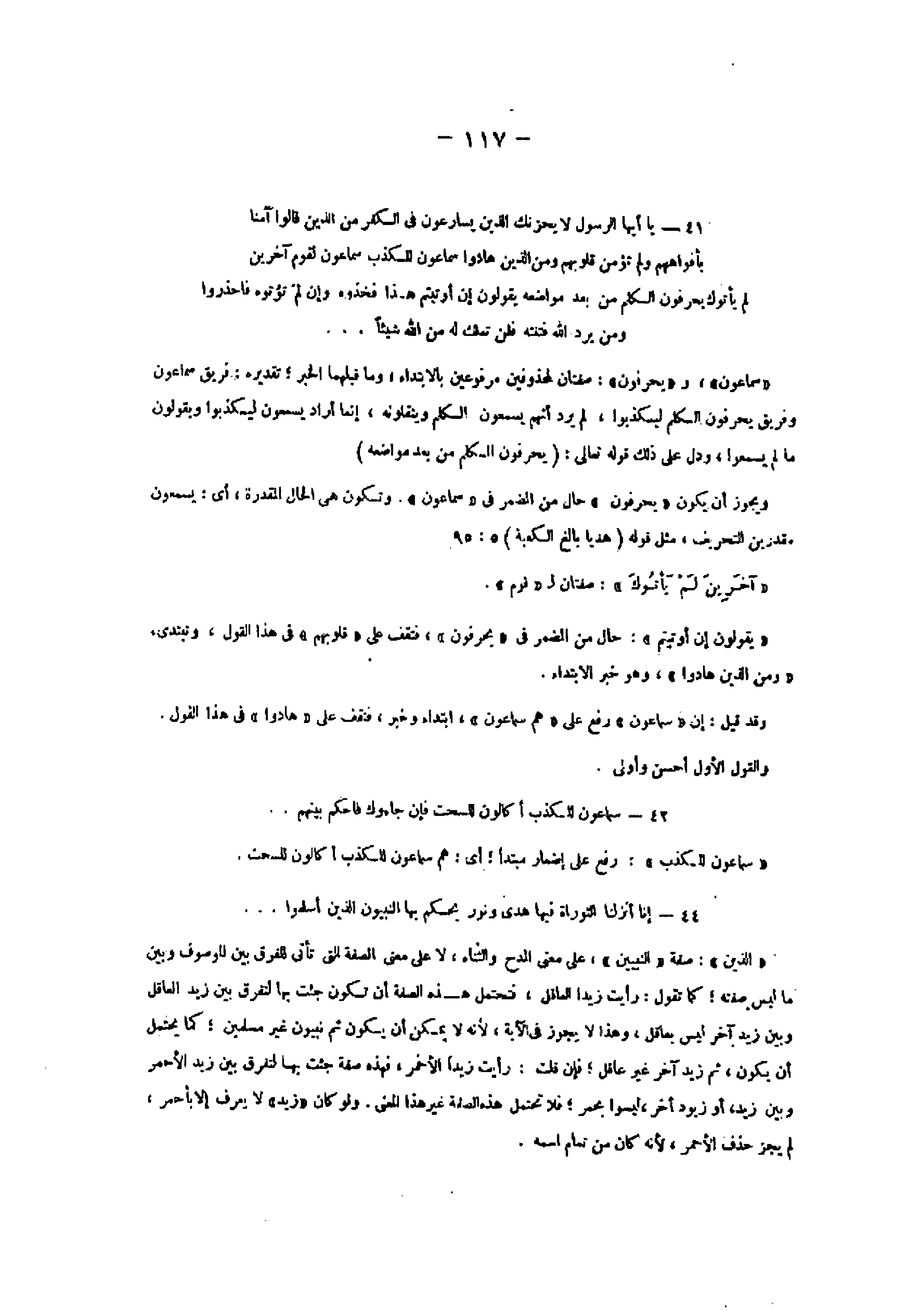«سماعون» ، و «يحرفون» : صفتان لمحذوفين مرفوعين بالابتداء، وما قبلهما الخبر تقديره: فريق سماعون وفريق يحرفون الكلم ليكذبوا، لم يرد أنهم يسمعون الكلم وينقلونه، إنما أراد يسمعون ليكذبوا ويقولون ما لم يسمعوا، ودل على ذلك قوله تعالى: (يُحَرِّفُونَ الْكَلِمَ مِنْ بَعْدِ مَواضِعِهِ) ويجوز أن يكون «يحرفون» حال من المضمر فى «سماعون» . وتكون هى الحال المقدرة، أي: يسمعون مقدرين التحريف، مثل قوله (هَدْياً بالِغَ الْكَعْبَةِ) 5: 95 «آخرين لم يأتوك» : صفتان ل «قوم» .