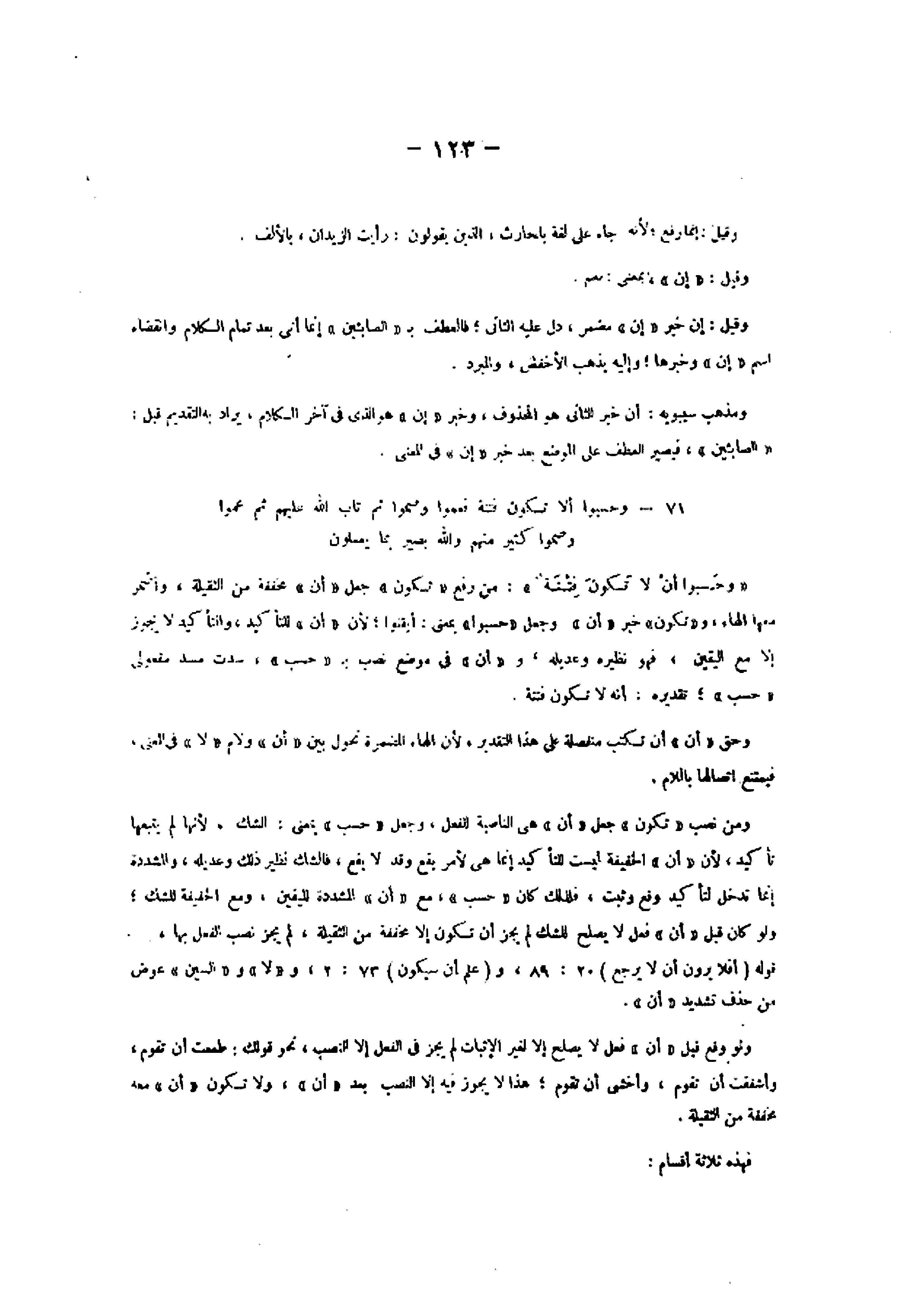 ومن نصب «تكون» جعل «أن» هى الناصبة للفعل، وجعل «حسب» بمعنى: الشك، لأنها لم يتبعها تأكيد، لأن «أن» الخفيفة ليست للتأكيد إنما هى لأمر يقع وقد لا يقع، فالشك نظير ذلك وعديله، والمشددة إنما تدخل لتأكيد وقع وثبت، فلذلك كان «حسب» ، مع «أن» المشددة لليقين، ومع الخفيفة للشك ولو كان قبل «أن» فعل لا يصلح للشك لم يجز أن تكون إلا مخففة من الثقيلة، لم يجز نصب الفعل بها، قوله (أَفَلا يَرَوْنَ أَلَّا يَرْجِعُ) 20: 89، و (عَلِمَ أَنْ سَيَكُونُ) 73: 2، و «لا» و «السين» عوض من حذف تشديد «أن» .
