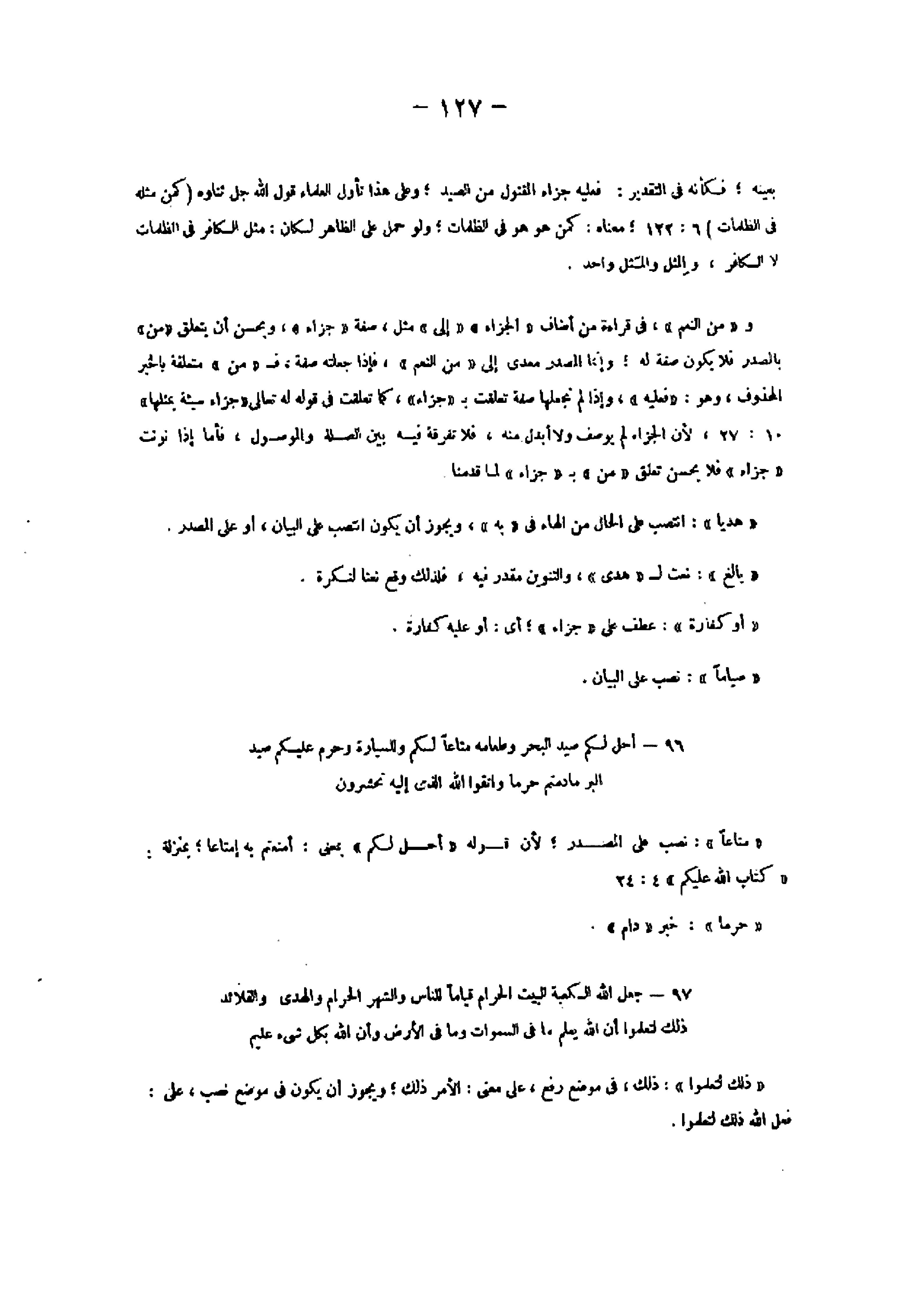 96- أُحِلَّ لَكُمْ صَيْدُ الْبَحْرِ وَطَعامُهُ مَتاعاً لَكُمْ وَلِلسَّيَّارَةِ وَحُرِّمَ عَلَيْكُمْ صَيْدُ الْبَرِّ ما دُمْتُمْ حُرُماً وَاتَّقُوا اللَّهَ الَّذِي إِلَيْهِ تُحْشَرُونَ «متاعا» : نصب على المصدر لأن قوله «أحل لكم» بمعنى: أمتعتم به إمتاعا بمنزلة: