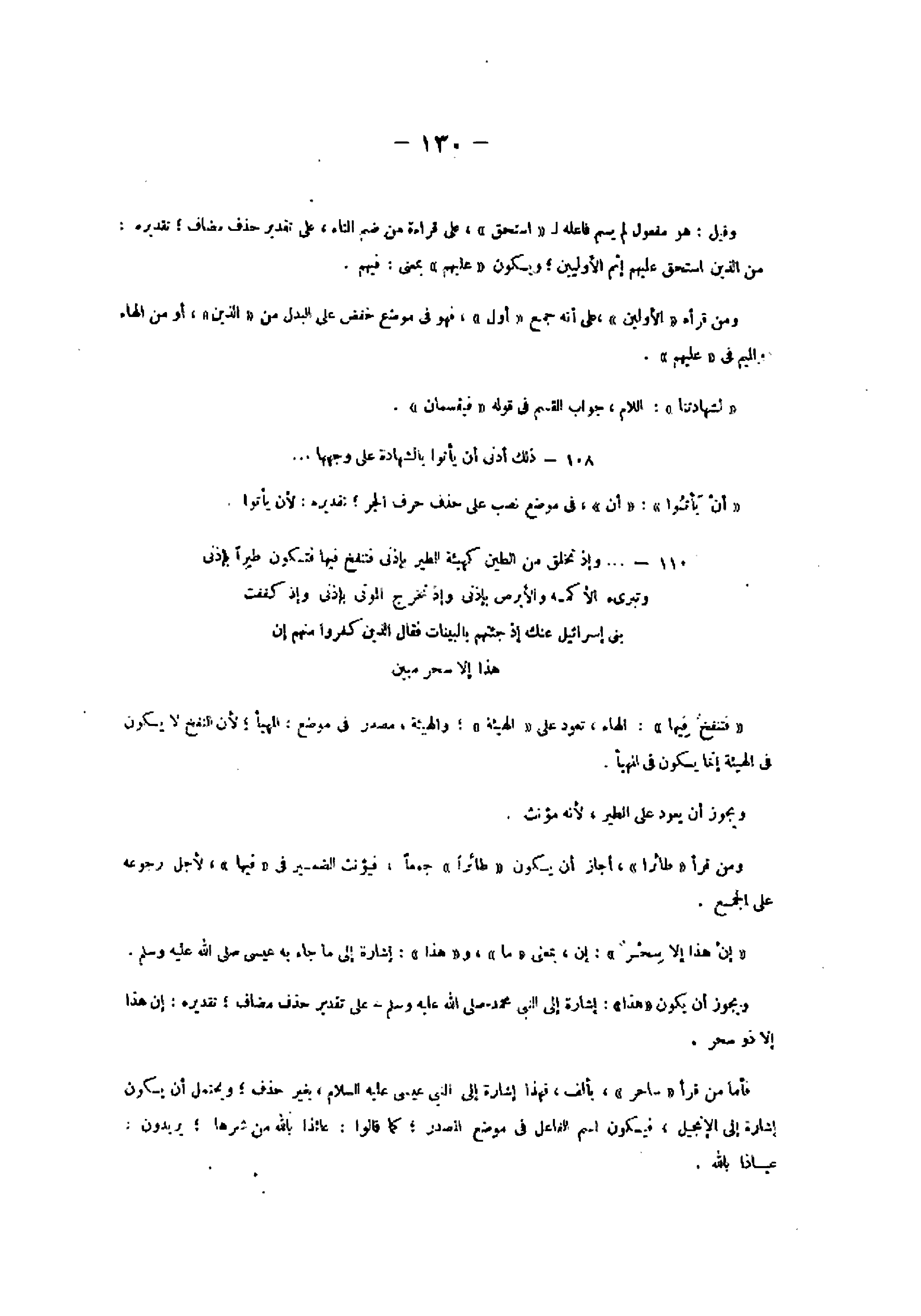 110- ... وَإِذْ تَخْلُقُ مِنَ الطِّينِ كَهَيْئَةِ الطَّيْرِ بِإِذْنِي فَتَنْفُخُ فِيها فَتَكُونُ طَيْراً بِإِذْنِي وَتُبْرِئُ الْأَكْمَهَ وَالْأَبْرَصَ بِإِذْنِي وَإِذْ تُخْرِجُ الْمَوْتى بِإِذْنِي وَإِذْ كَفَفْتُ بَنِي إِسْرائِيلَ عَنْكَ إِذْ جِئْتَهُمْ بِالْبَيِّناتِ فَقالَ الَّذِينَ كَفَرُوا مِنْهُمْ إِنْ هذا إِلَّا سِحْرٌ مُبِينٌ «فتنفخ فيها» : الهاء، تعود على «الهيئة» والهيئة، مصدر فى موضع: المهيأ لأن النفخ لا يكون فى الهيئة إنما يكون فى المهيأ.