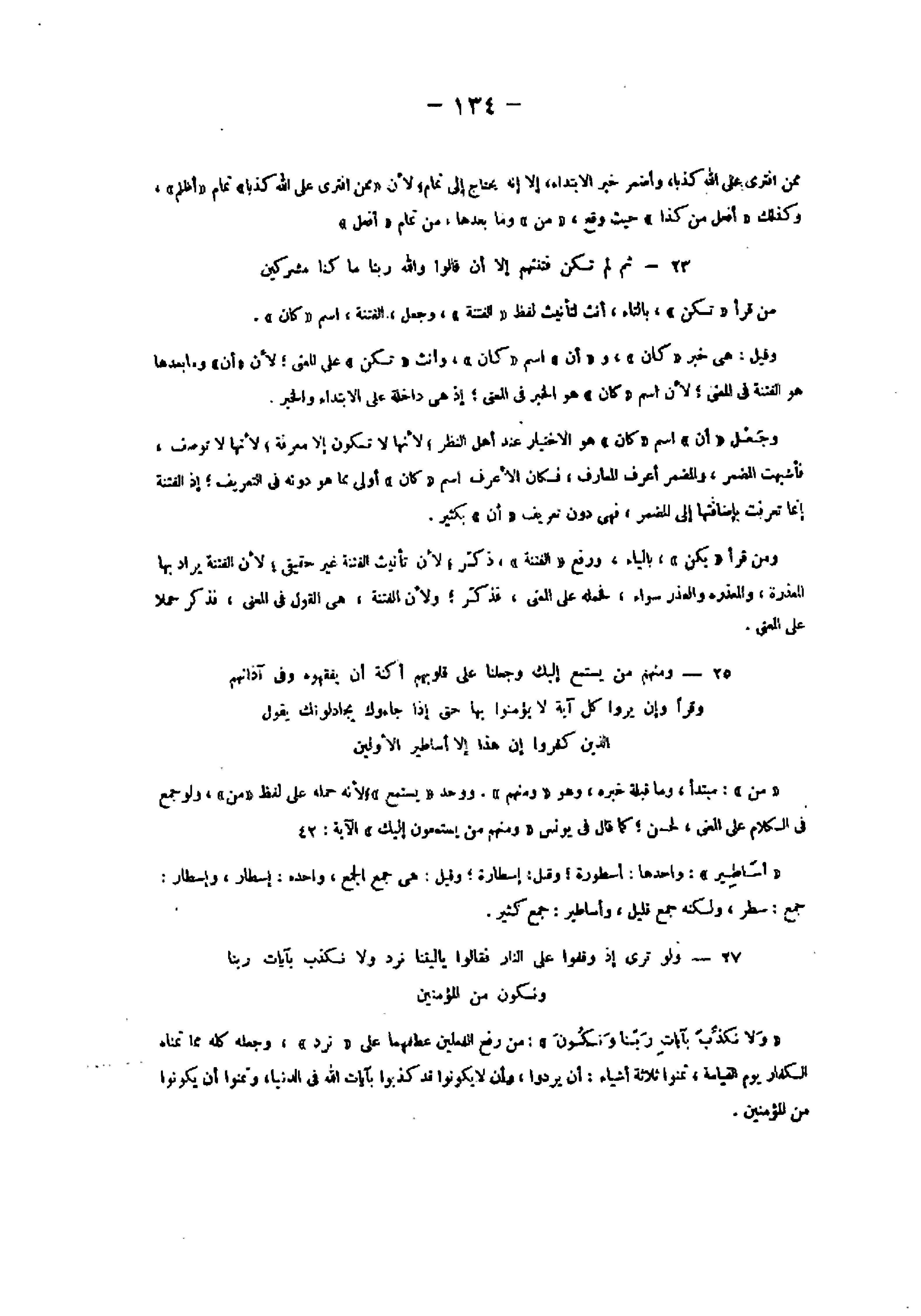ممن افترى على الله كذبا، وأضمر خبر الابتداء، إلا إنه يحتاج إلى تمام لأن «ممن افترى على الله كذبا» تمام «أظلم» ، وكذلك «أفعل من كذا» حيث وقع، «من» وما بعدها، من تمام «أفعل» 23- ثُمَّ لَمْ تَكُنْ فِتْنَتُهُمْ إِلَّا أَنْ قالُوا وَاللَّهِ رَبِّنا ما كُنَّا مُشْرِكِينَ من قرأ «تكن» ، بالتاء، أنث لتأنيث لفظ «الفتنة» ، وجعل، الفتنة، اسم «كان» .
