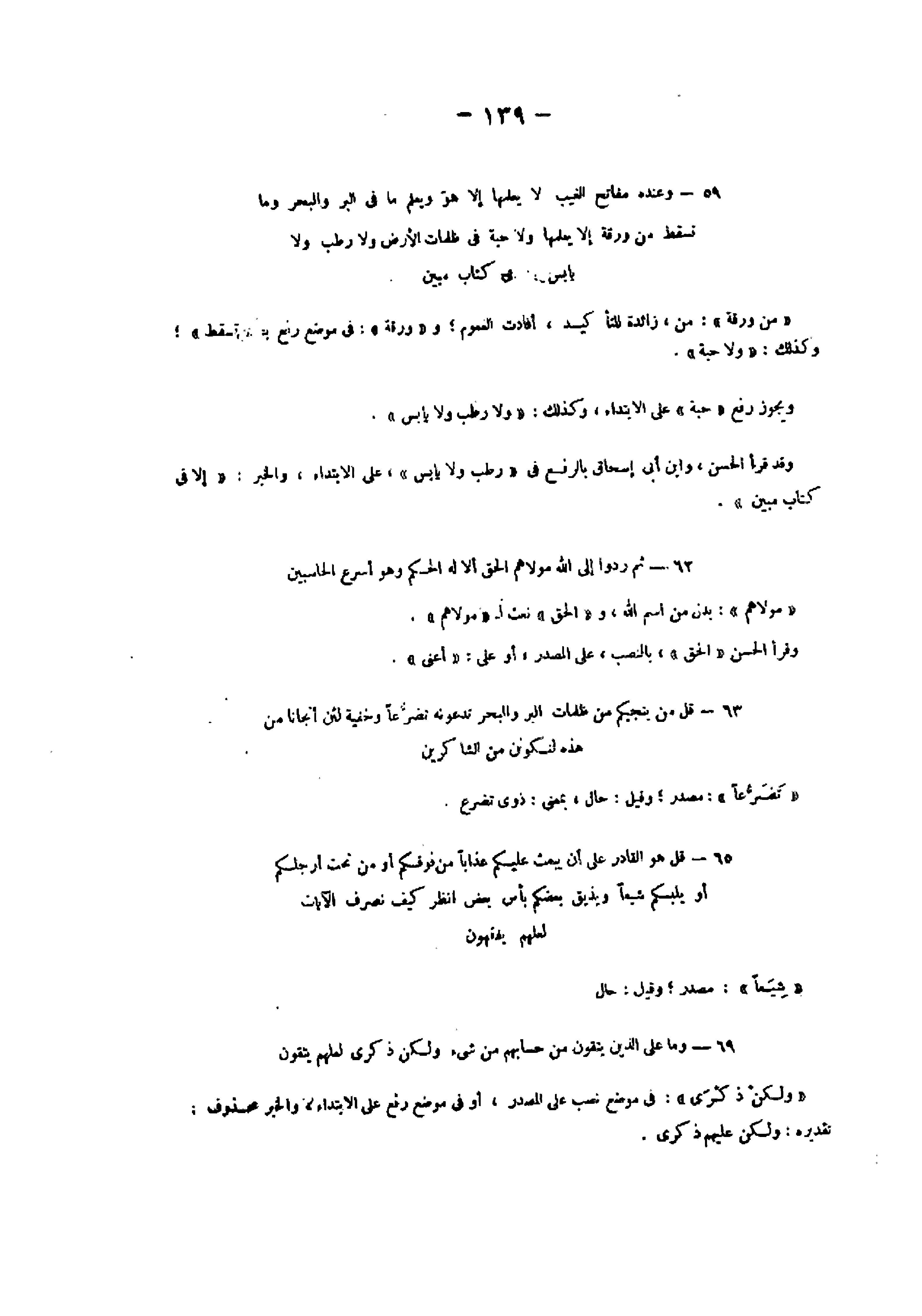 65- قُلْ هُوَ الْقادِرُ عَلى أَنْ يَبْعَثَ عَلَيْكُمْ عَذاباً مِنْ فَوْقِكُمْ أَوْ مِنْ تَحْتِ أَرْجُلِكُمْ أَوْ يَلْبِسَكُمْ شِيَعاً وَيُذِيقَ بَعْضَكُمْ بَأْسَ بَعْضٍ انْظُرْ كَيْفَ نُصَرِّفُ الْآياتِ لَعَلَّهُمْ يَفْقَهُونَ «شيعا» : مصدر وقيل: حال 69- وَما عَلَى الَّذِينَ يَتَّقُونَ مِنْ حِسابِهِمْ مِنْ شَيْءٍ وَلكِنْ ذِكْرى لَعَلَّهُمْ يَتَّقُونَ «ولكن ذكرى» : فى موضع نصب على المصدر، أو فى موضع رفع على الابتداء، والخبر محذوف: