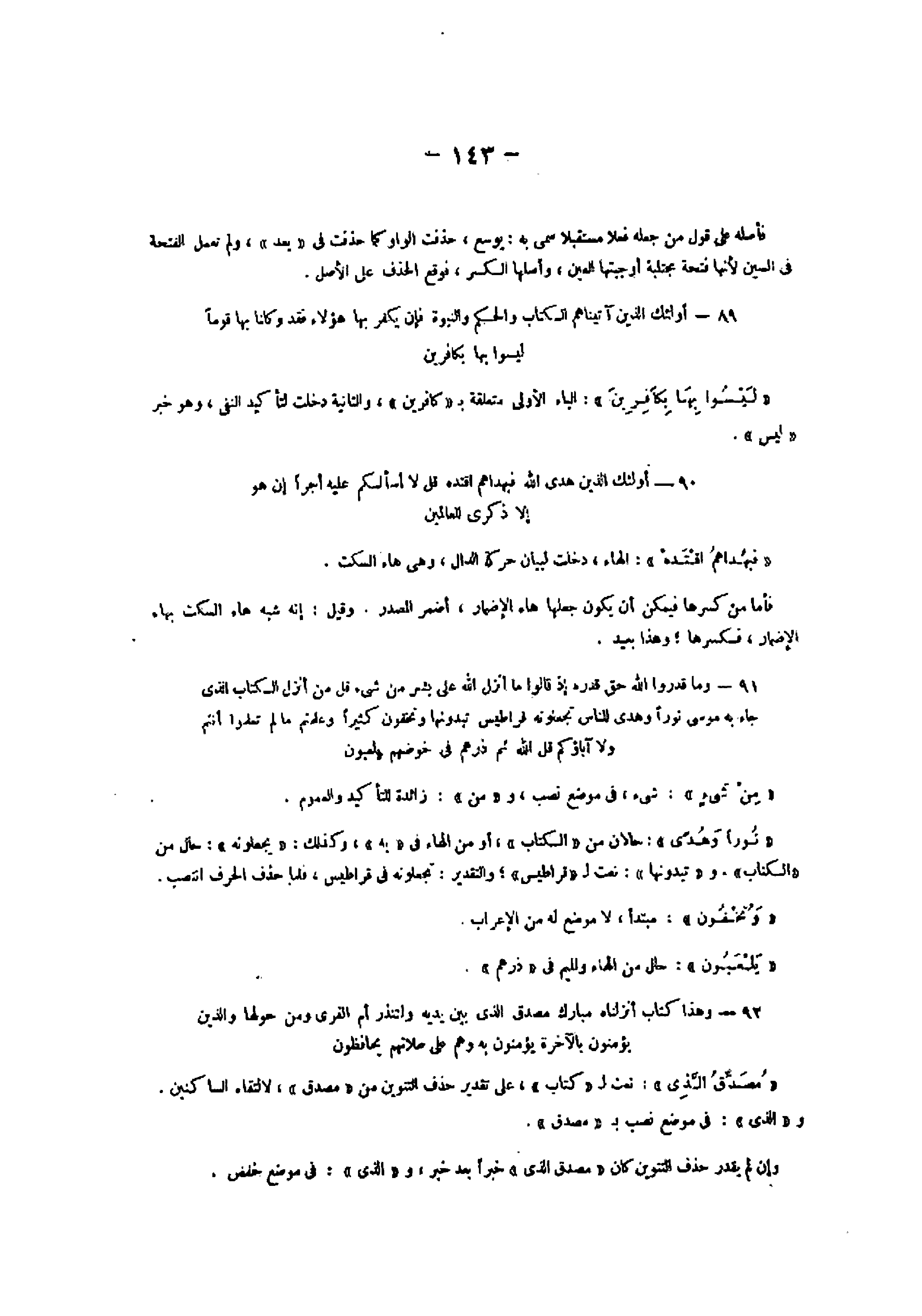 92- وَهذا كِتابٌ أَنْزَلْناهُ مُبارَكٌ مُصَدِّقُ الَّذِي بَيْنَ يَدَيْهِ وَلِتُنْذِرَ أُمَّ الْقُرى وَمَنْ حَوْلَها وَالَّذِينَ يُؤْمِنُونَ بِالْآخِرَةِ يُؤْمِنُونَ بِهِ وَهُمْ عَلى صَلاتِهِمْ يُحافِظُونَ «مصدّق الّذى» : نعت ل «كتاب» ، على تقدير حذف التنوين من «مصدق» ، لالتقاء الساكنين.
