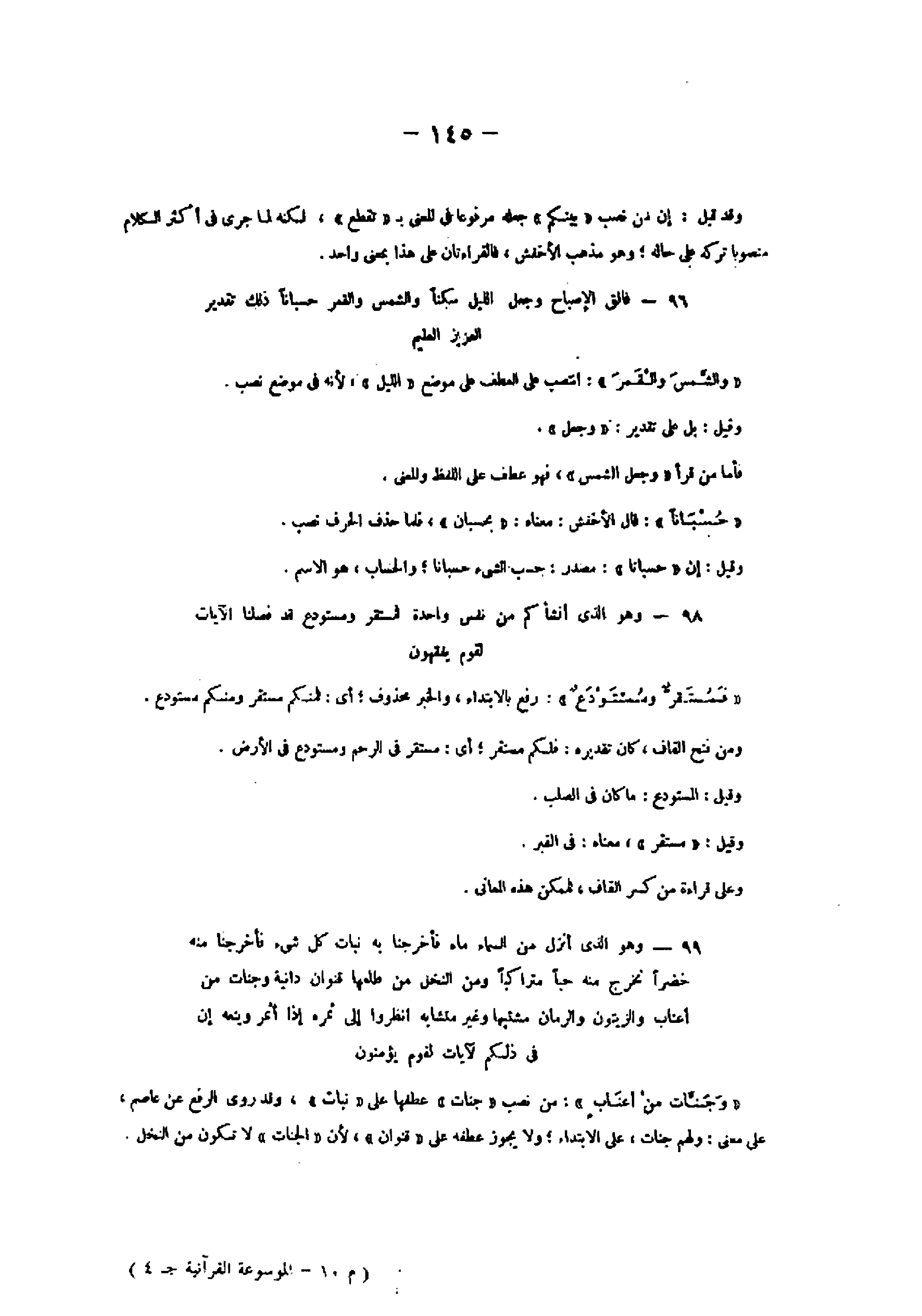 96- فالِقُ الْإِصْباحِ وَجَعَلَ اللَّيْلَ سَكَناً وَالشَّمْسَ وَالْقَمَرَ حُسْباناً ذلِكَ تَقْدِيرُ الْعَزِيزِ الْعَلِيمِ «والشّمس والقمر» : انتصب على العطف على موضع «الليل» ، لأنه فى موضع نصب.