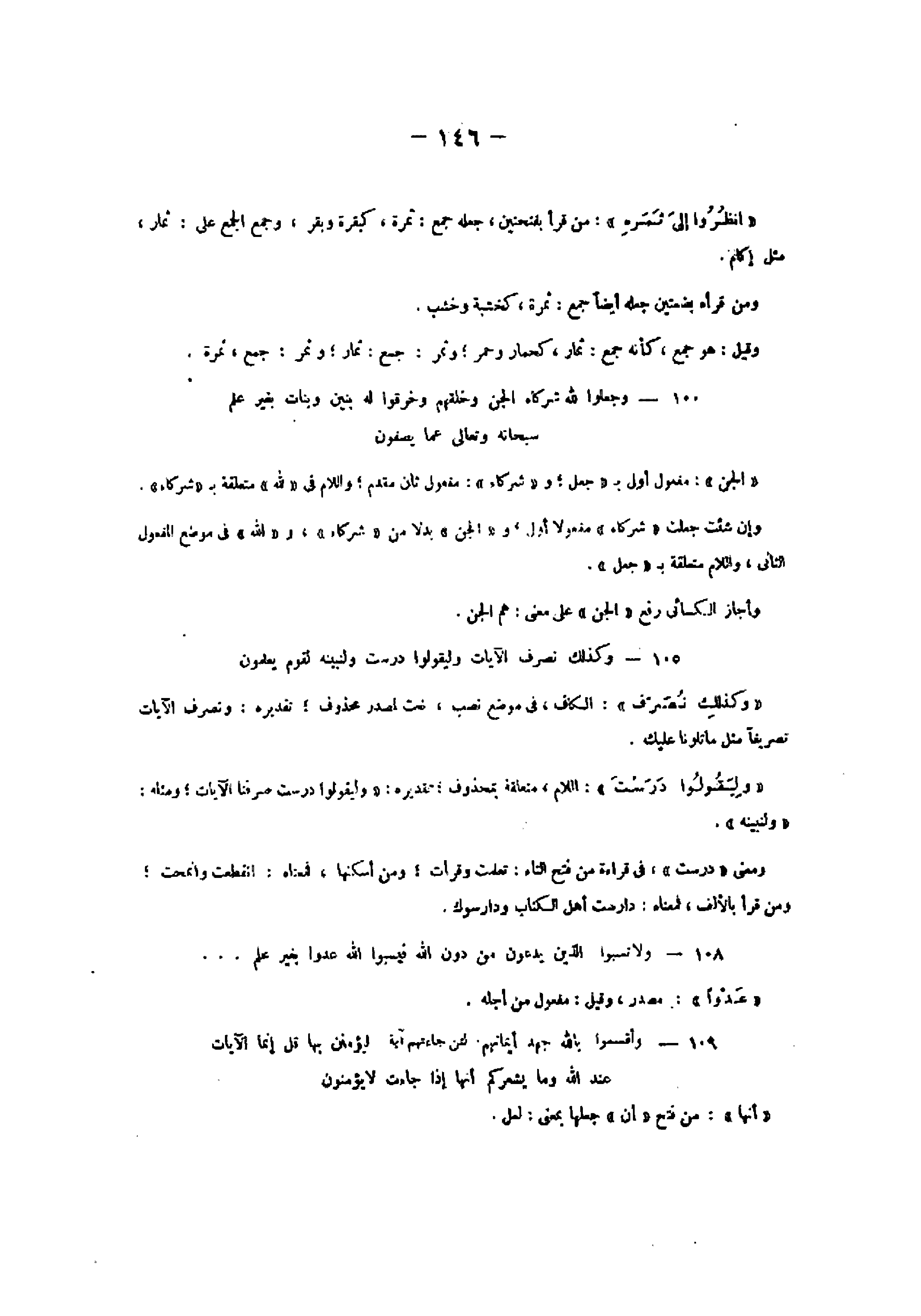100- وَجَعَلُوا لِلَّهِ شُرَكاءَ الْجِنَّ وَخَلَقَهُمْ وَخَرَقُوا لَهُ بَنِينَ وَبَناتٍ بِغَيْرِ عِلْمٍ سُبْحانَهُ وَتَعالى عَمَّا يَصِفُونَ «الجن» : مفعول أول ب «جعل» و «شركاء» : مفعول ثان مقدم واللام فى «لله» متعلقة ب «شركاء» .