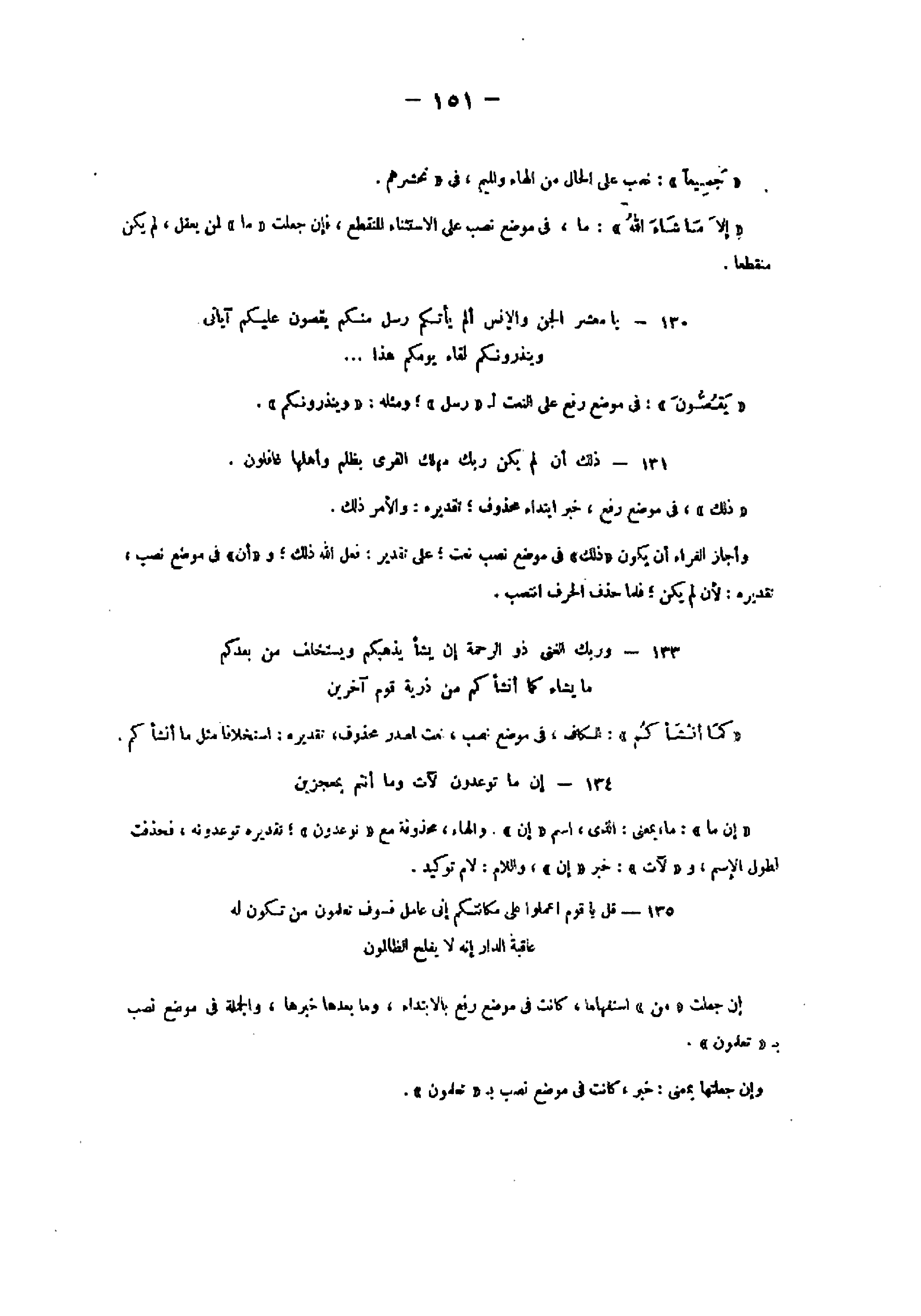 134- إِنَّ ما تُوعَدُونَ لَآتٍ وَما أَنْتُمْ بِمُعْجِزِينَ «إن ما» : ما، بمعنى: الذي، اسم «إن» . والهاء، محذوفة مع «توعدون» تقديره توعدونه، فحذفت لطول الاسم، و «لآت» : خبر «إن» ، واللام: لام توكيد.